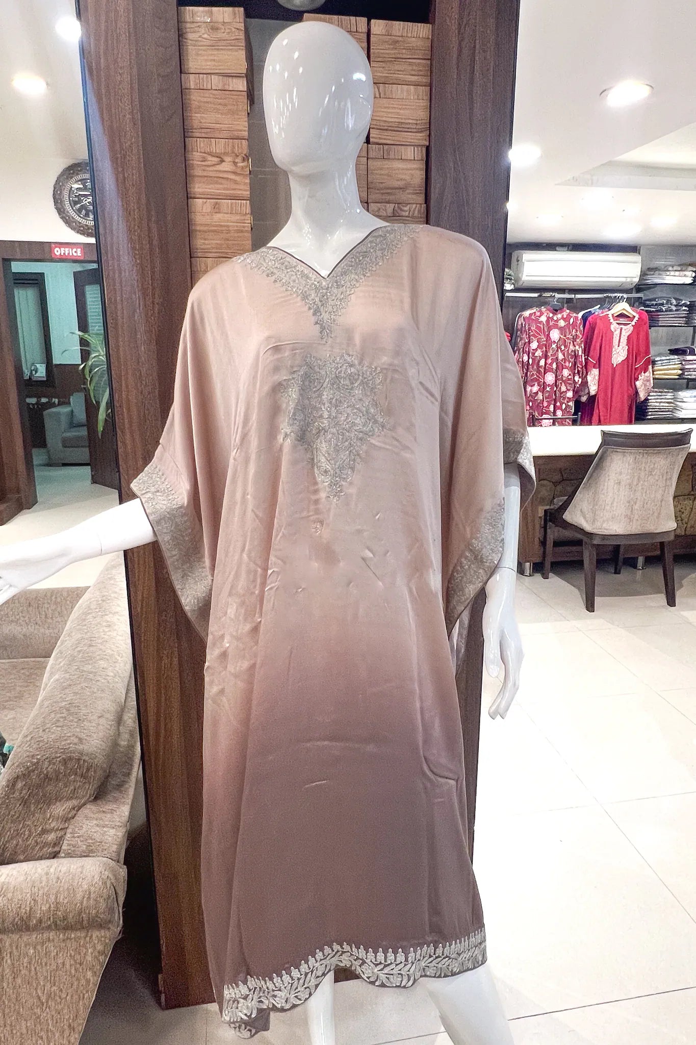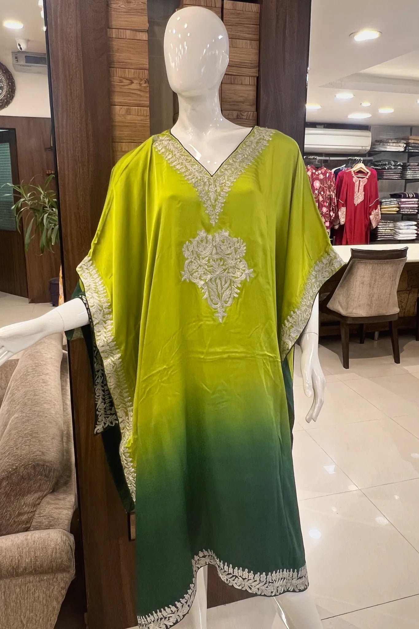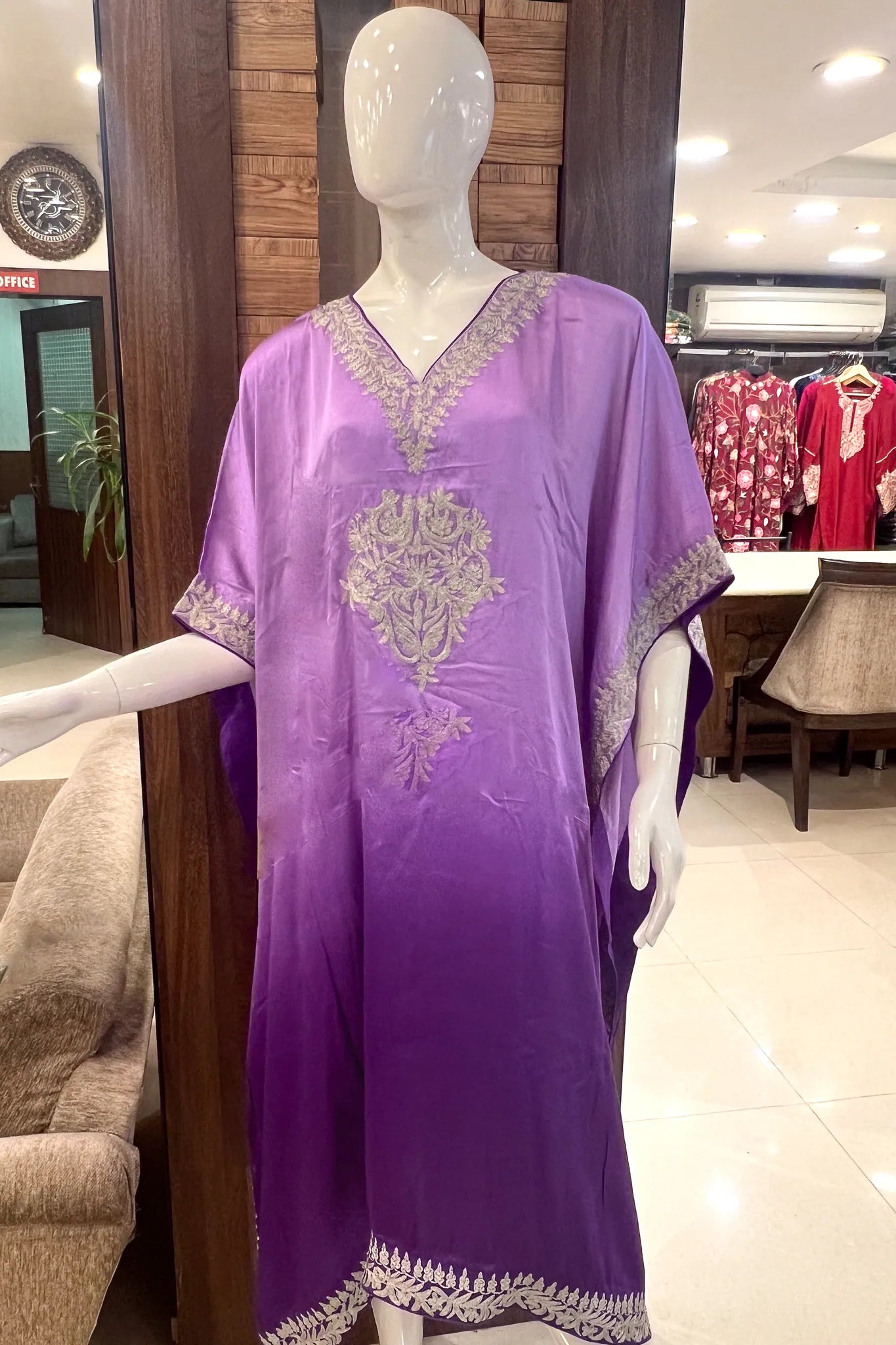 A luxurious ombre crepe silk kaftan, detailed with exquisite Kashmiri Tilla embroidery. Designed for flow, grace, and heritage charm.