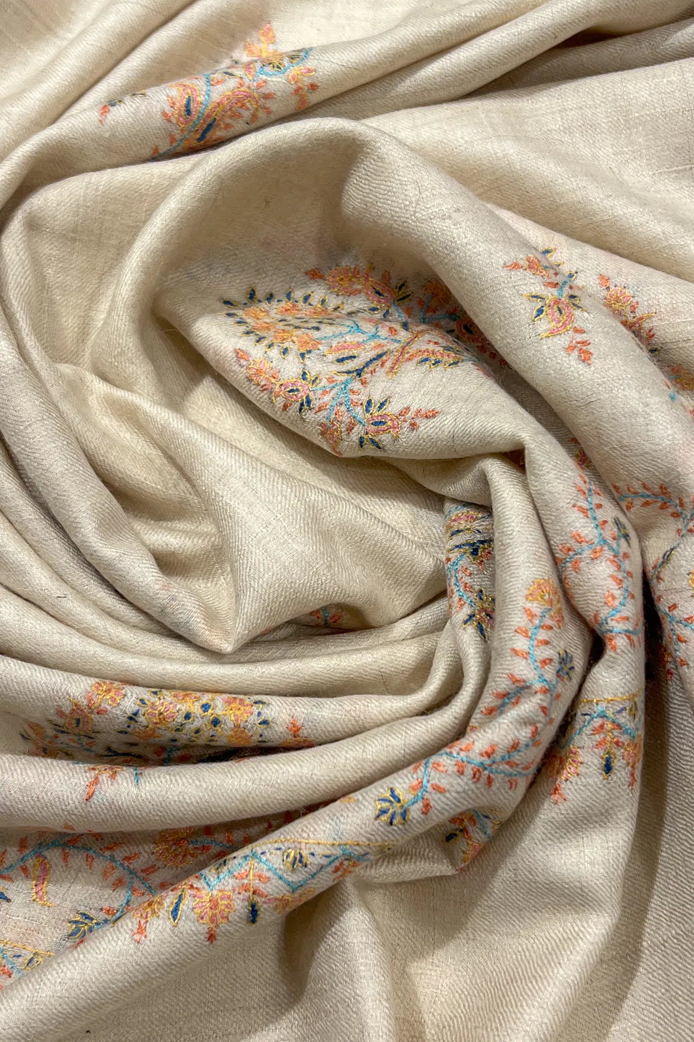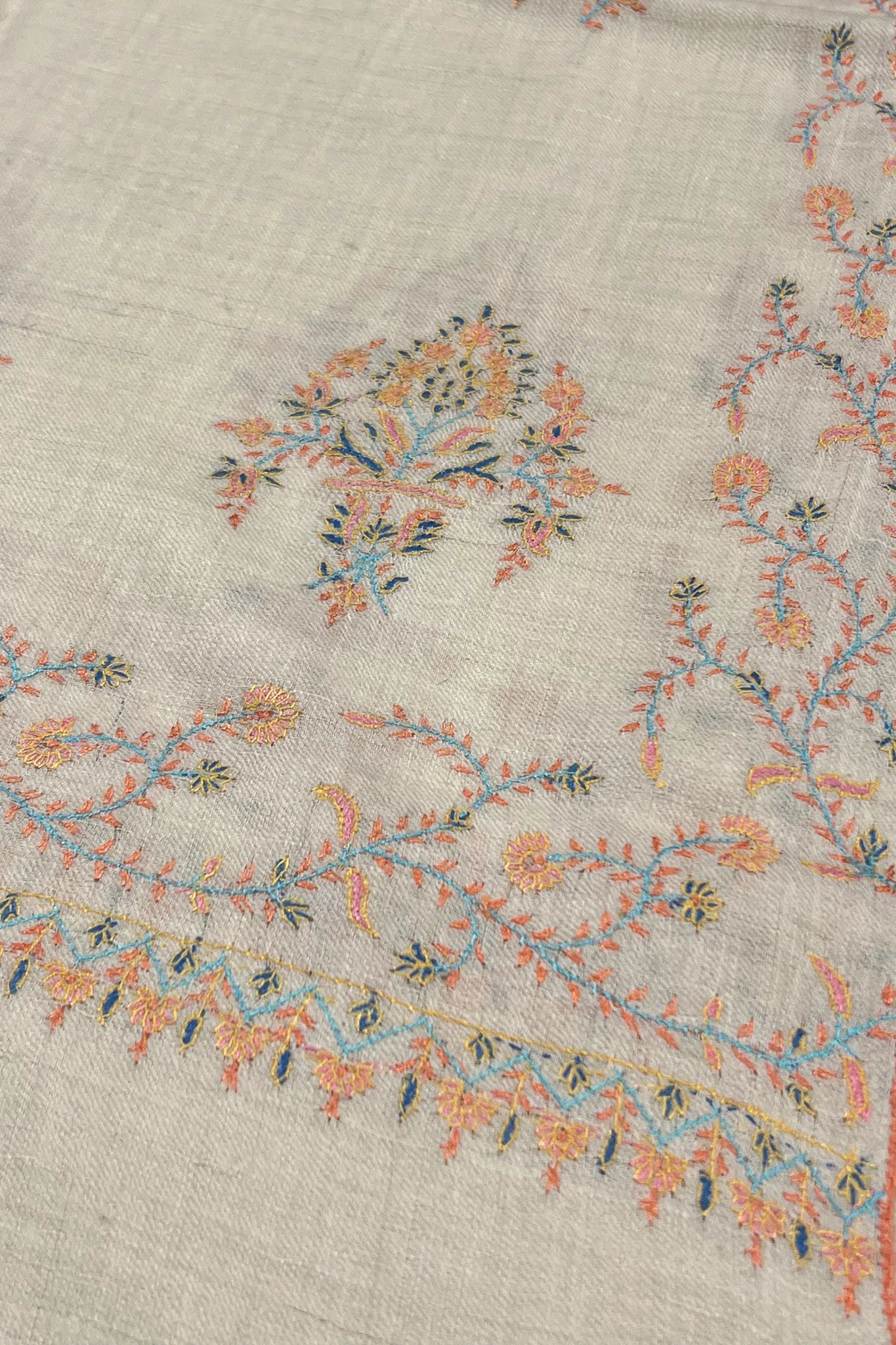 Scattered across the shawl, floral sozni embroidery appears like quiet conversations stitched in colour. Blues, corals, and muted golds emerge with restraint, never overwhelming, always balanced. The tight weave gives the shawl a reassuring presence, light yet grounding, something you reach for without thinking when the air turns cool or the evening stretches longer than expected.