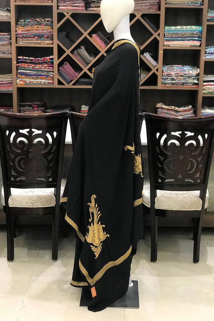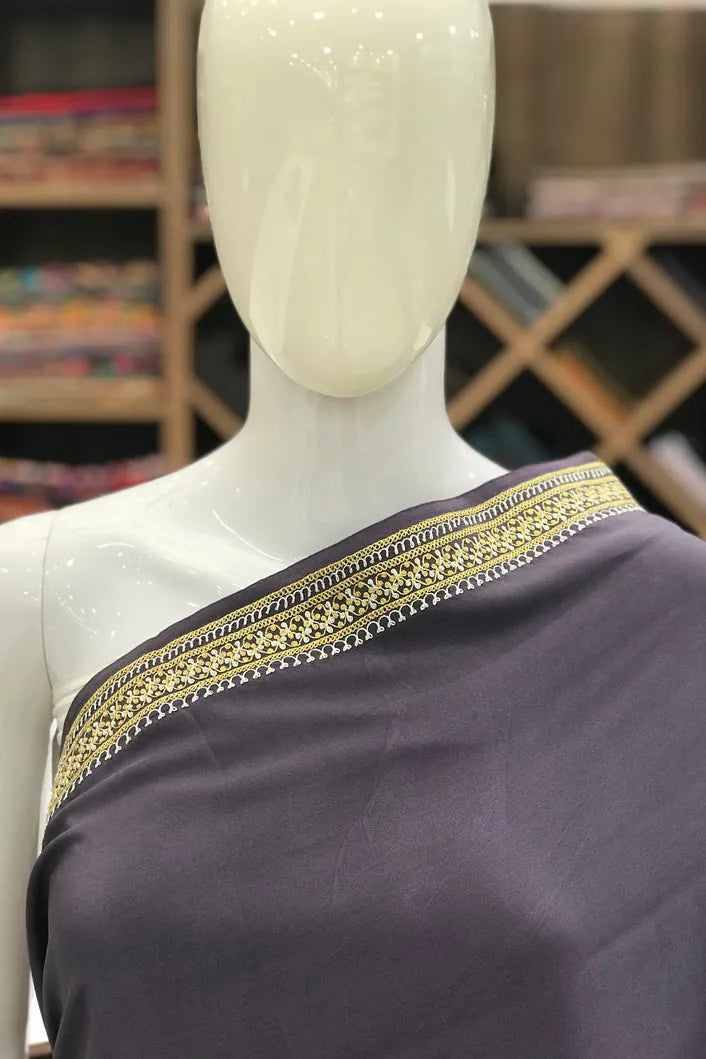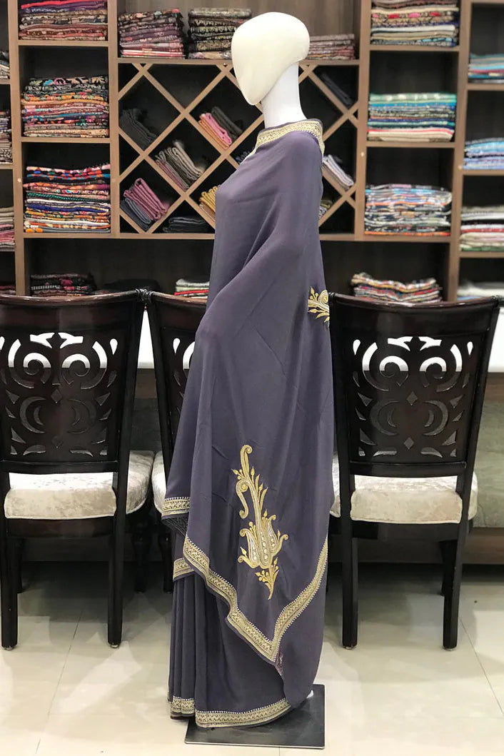 Wearing Neelab-e-Zar feels like stepping into quiet luxury—elegant, empowered, and deeply connected to the heritage of Kashmiri craftsmanship. The pure crepe drape moves with liquid ease, offering unmatched comfort, while delicate hand-done Tilla embroidery in gold and silver glows softly along the borders. A perfect harmony of refinement and cultural artistry, this saree transitions effortlessly from intimate gatherings to formal celebrations, carrying timeless appeal and heirloom value. Essential features include handcrafted Tilla/Zari embroidery, a lavender/red/navy/black crepe base, and a matching pure crepe blouse.