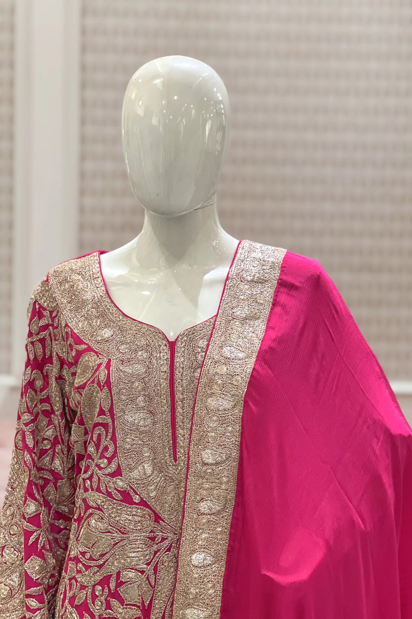 This exquisite piece stuns with its intricate zari work, meticulously embroidered to adorn every inch of the fabric. The delicate threads shimmer and catch the light, creating a mesmerising display of artistic craftsmanship.