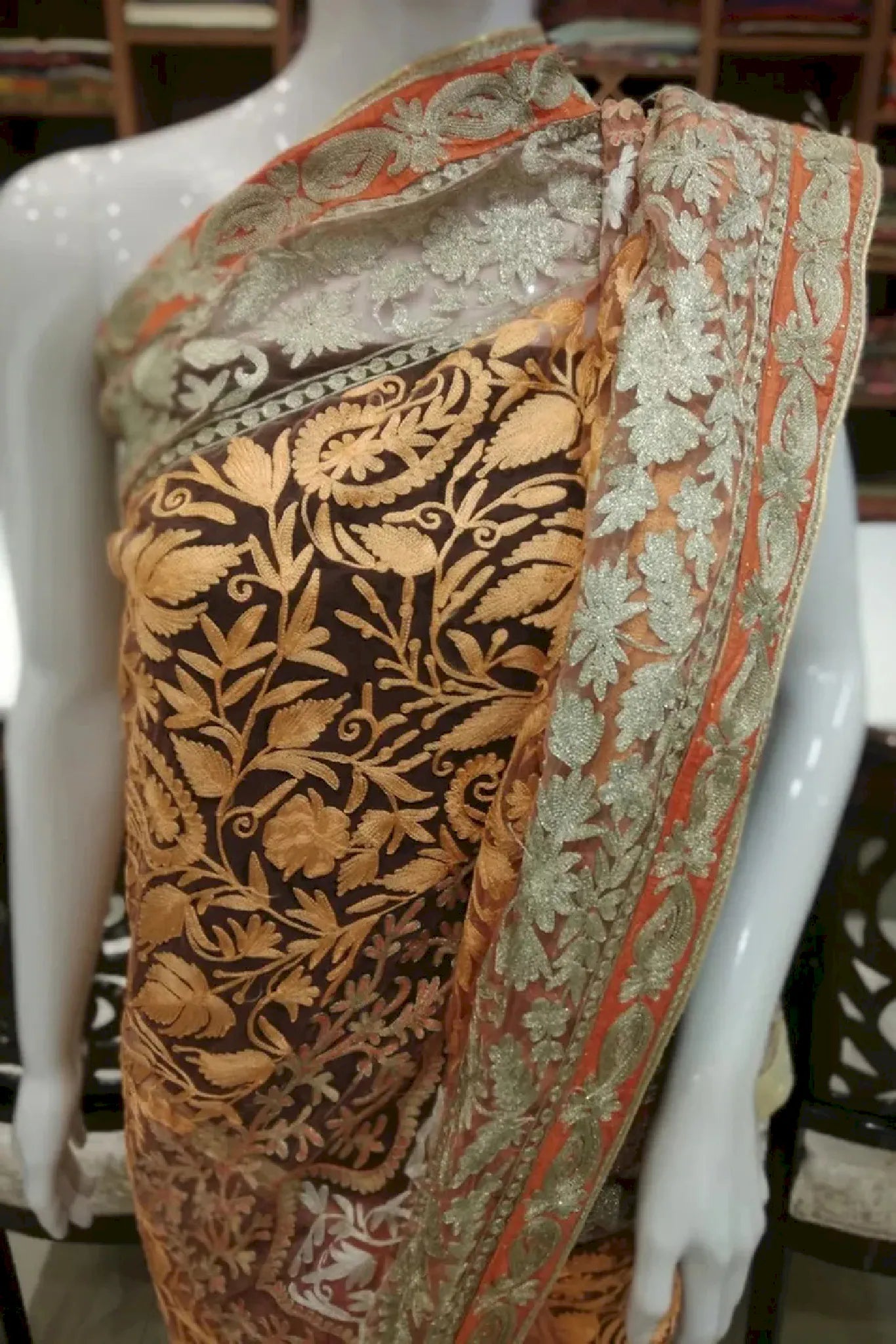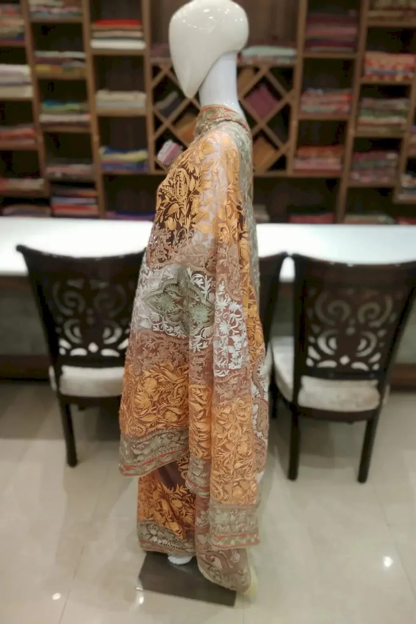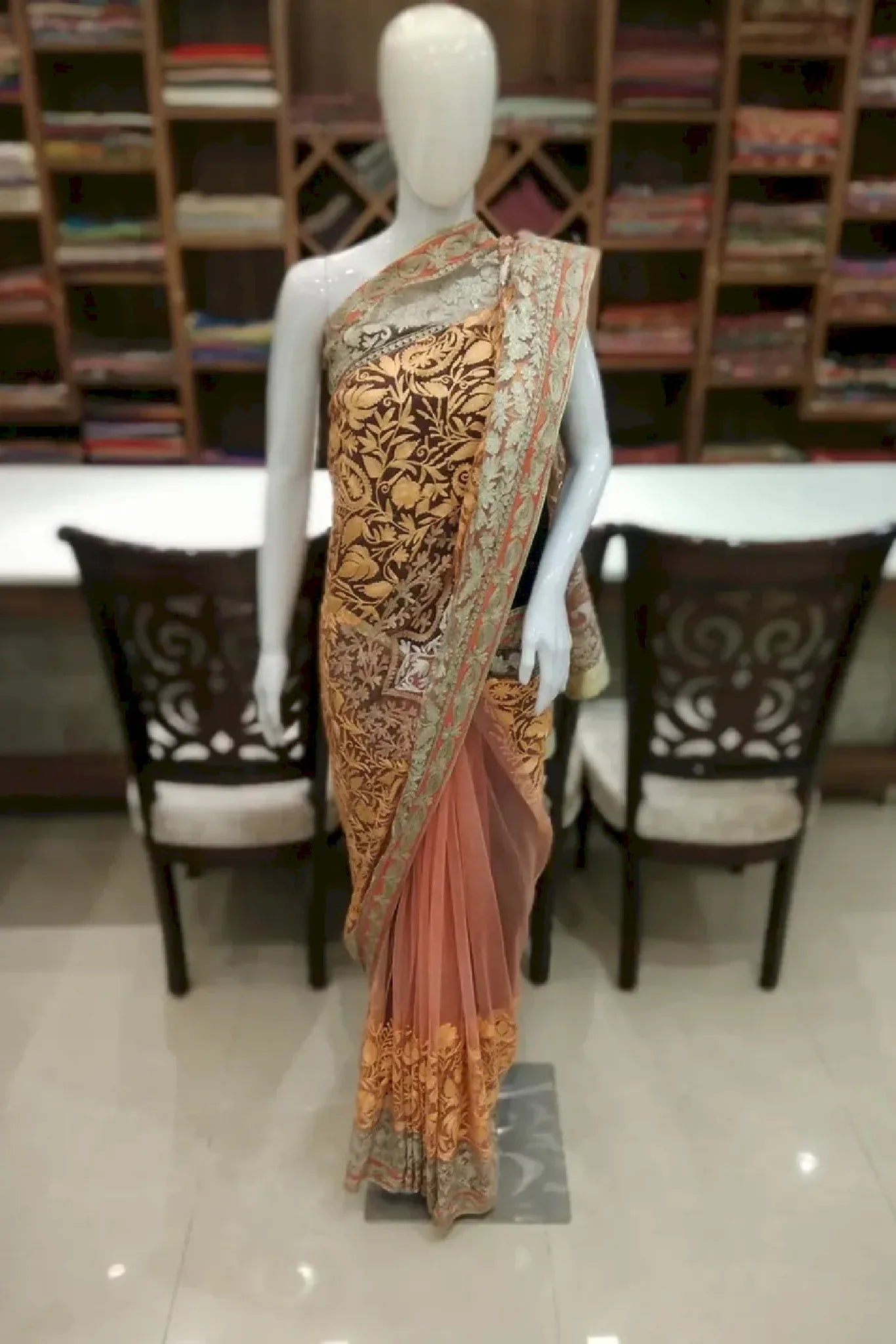 Wearing Saanjh Zarafshan feels luminous and assured, enveloping you in a quiet elegance that flows from tradition into the present. The soft peach net drapes effortlessly, creating a light and graceful silhouette, while intricate Kashmiri aari embroidery is highlighted with zari accents in antique gold. Designed for comfort and fluid movement, this saree carries a refined richness that transitions seamlessly from festive moments to evening celebrations. Crafted with care, it stands as a timeless expression of heritage, artistry, and modern femininity.