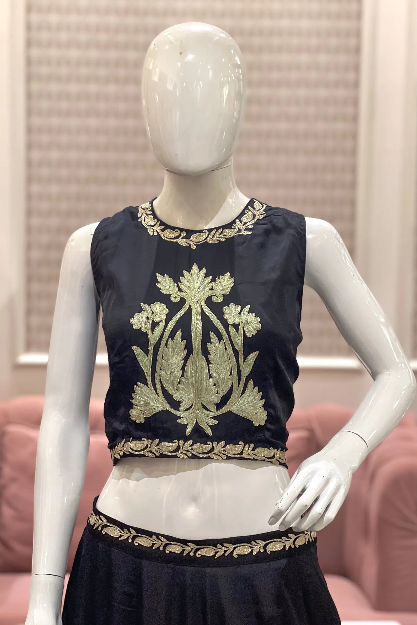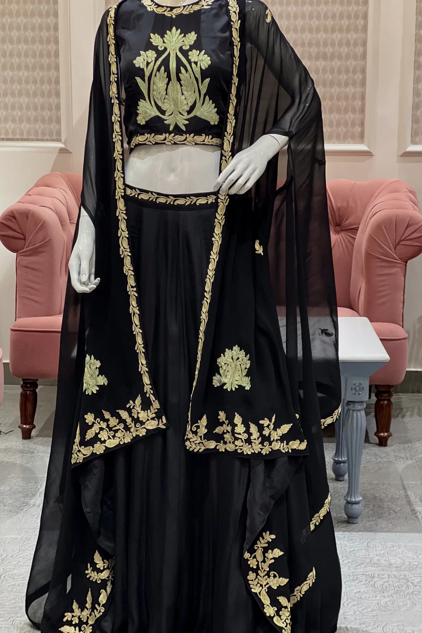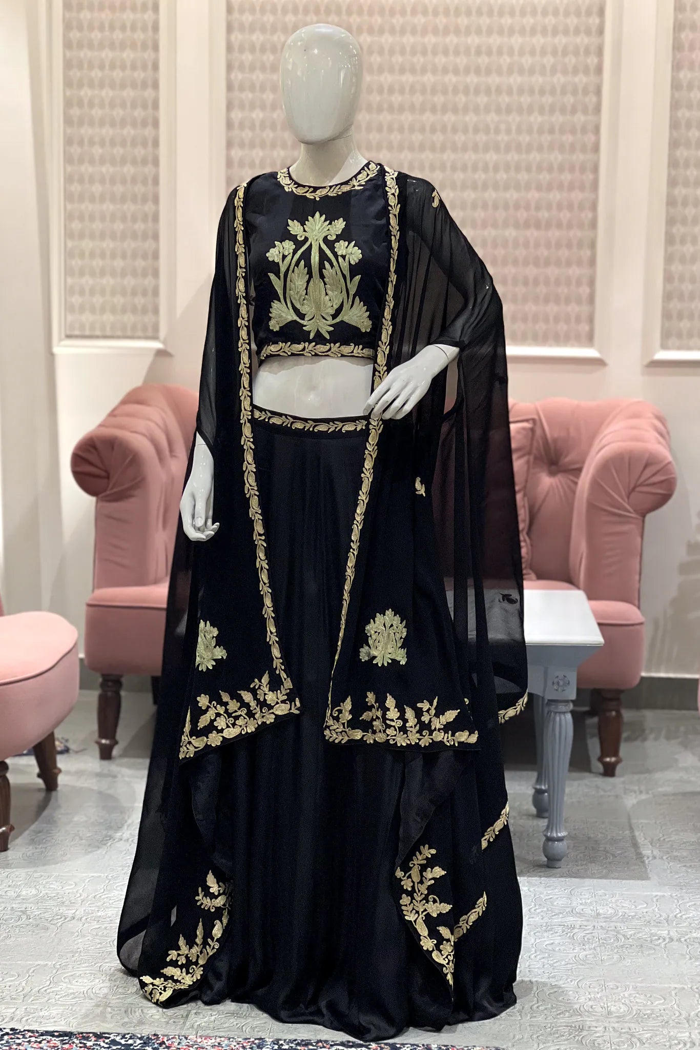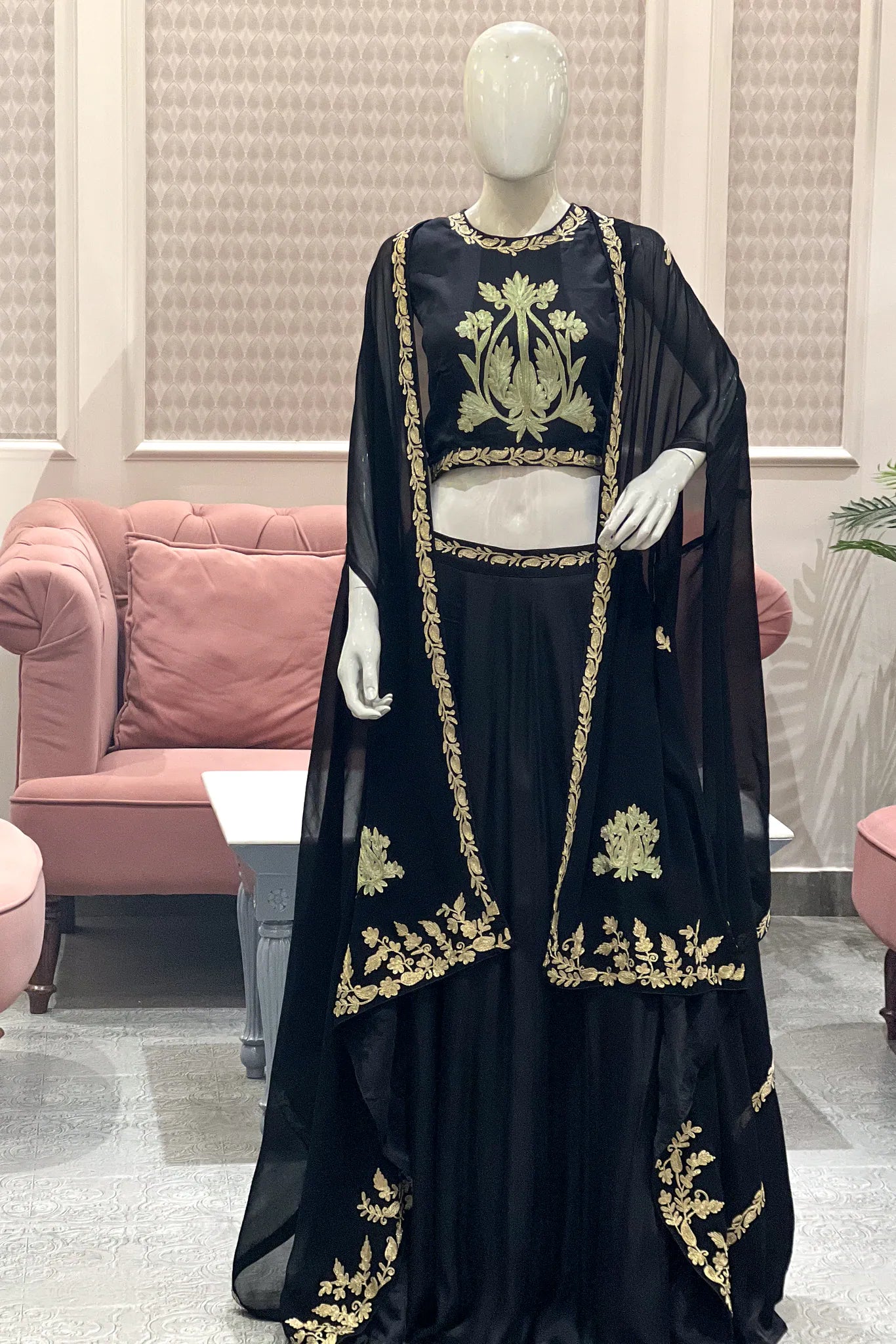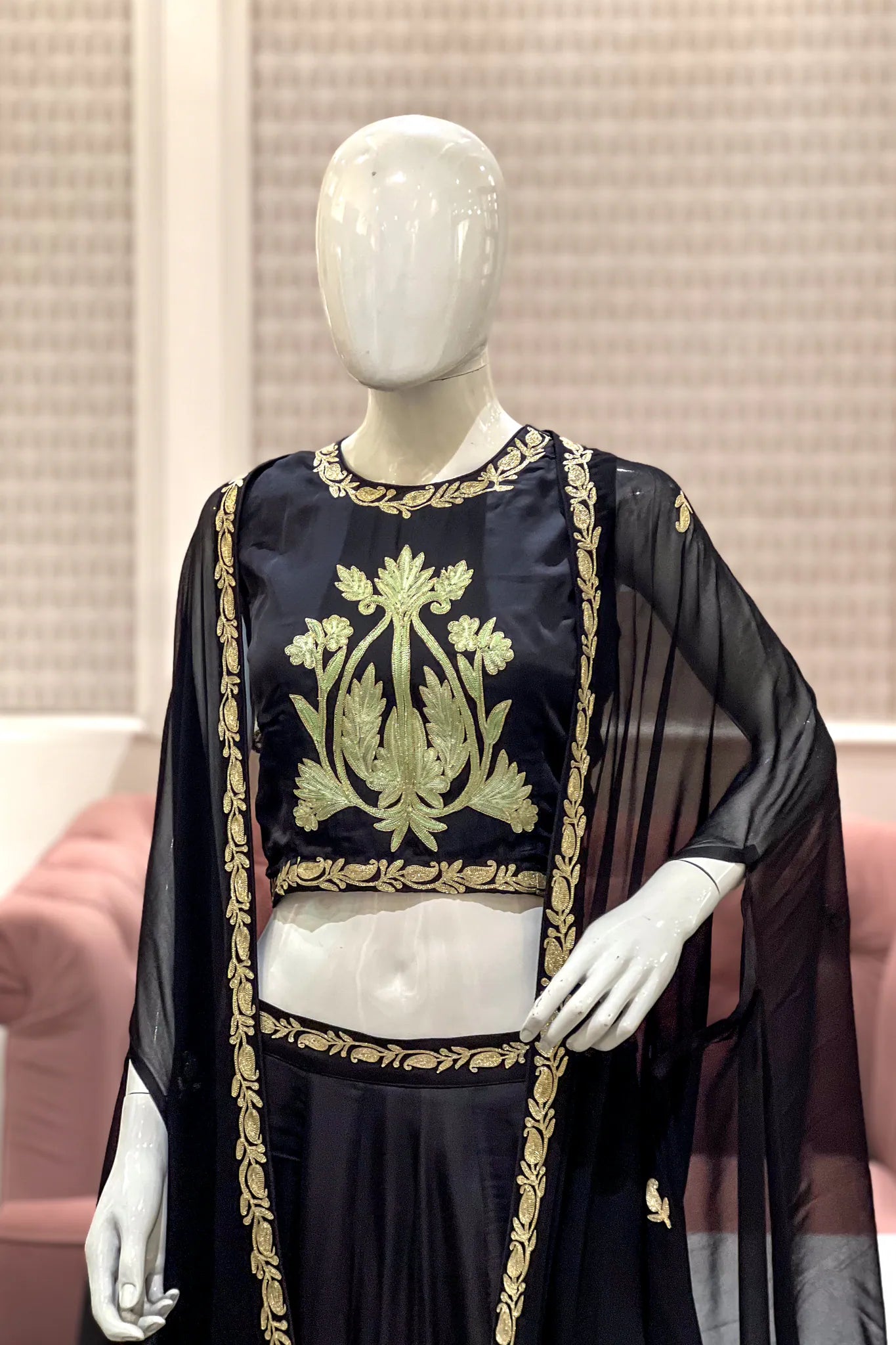 A blouse, dhoti skirt, and cape set where modal satin and georgette drape the body like poetry in motion. Aari and Tilla embroidery add their own verses to this sartorial sonnet.