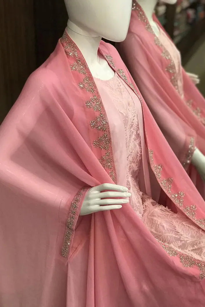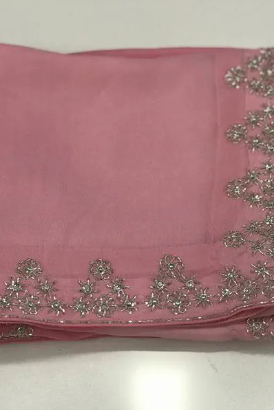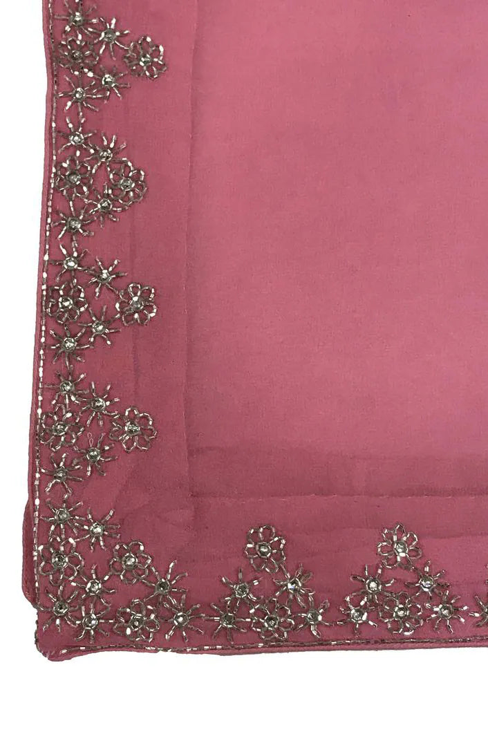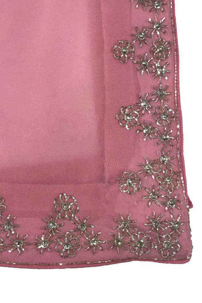 Elowen feels like a moment held gently. The ombre pink does not rush. It warms slowly, moving from softness to glow the way light changes when a room grows quieter. The georgette rests lightly in the hand, airy yet present, as if it has already learned how to move with you.