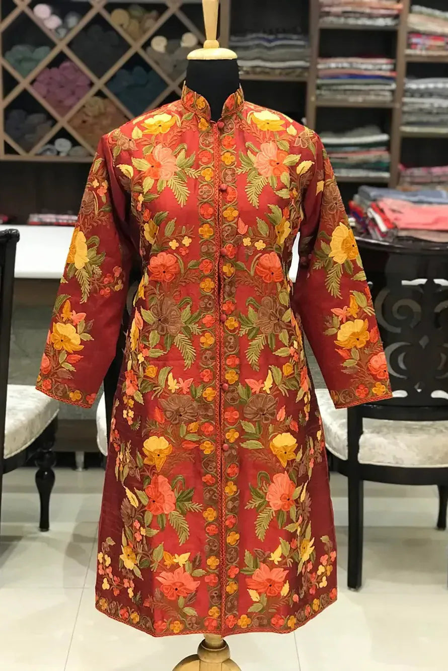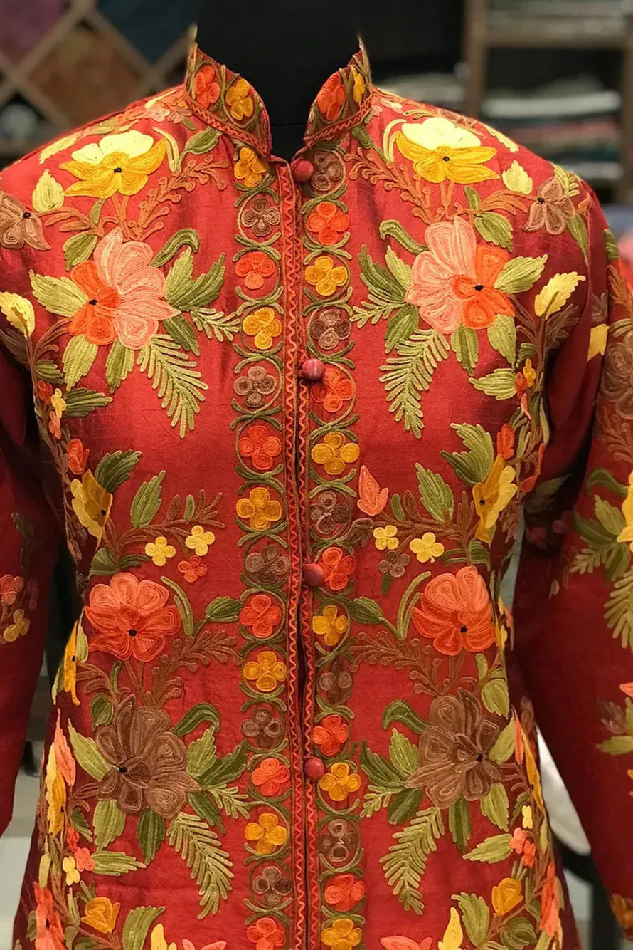 The red holds you first. It is not loud, yet it refuses to fade into the background. A warm, spiced crimson that feels as though it has absorbed lamplight for years. When your fingers brush against it, the surface feels assured and steady, and then the Kashmiri Aari embroidery begins to reveal itself. Marigold, saffron, soft coral and muted olive bloom across the length in climbing florals that gather at the front placket and drift outward toward the sleeves. The pattern does not scatter. It settles with intention, like petals placed by hand.