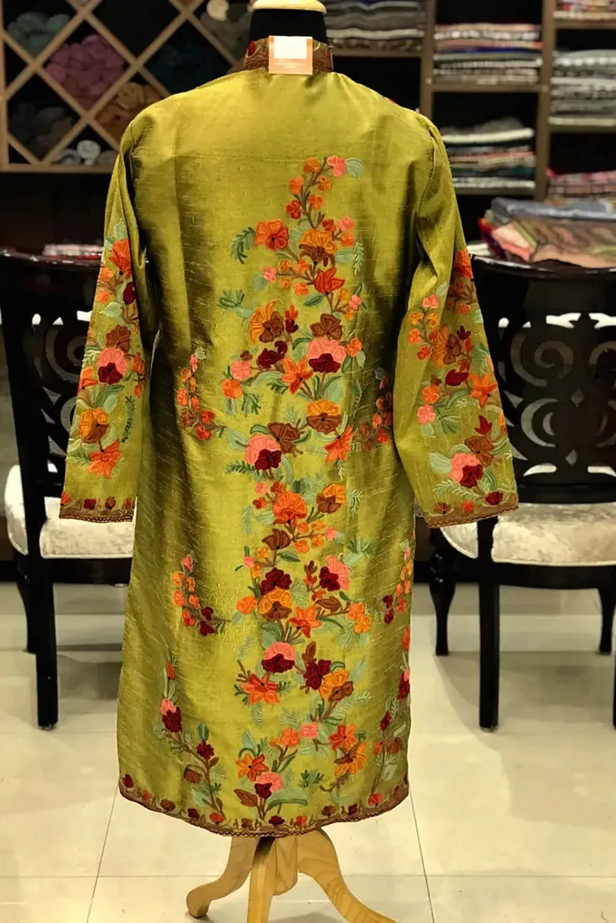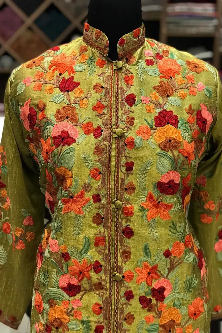 The olive feels like late afternoon light caught in fabric. Not bright, not muted, but settled. When you lift it from its hanger, there is a quiet density to it, a reassuring weight that suggests it will hold its shape through the evening. Then the Kashmiri Aari embroidery begins to reveal itself. Coral, rust, rose and soft teal florals bloom across the surface in a gentle climb, gathering along the placket, circling the cuffs, and trailing down the back in a single deliberate sweep. The colours do not compete. They converse.
