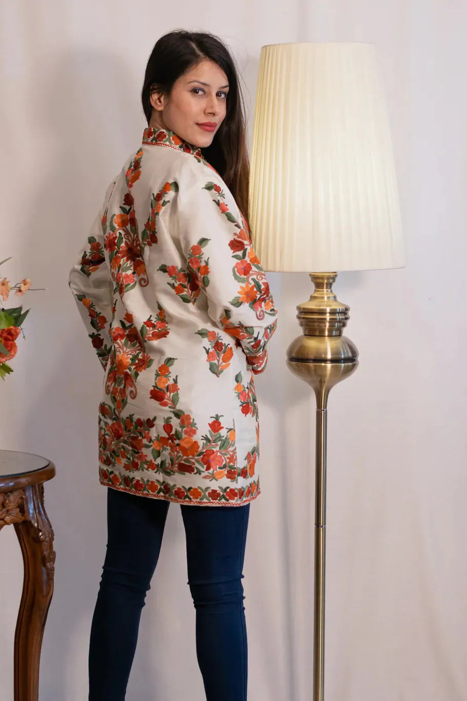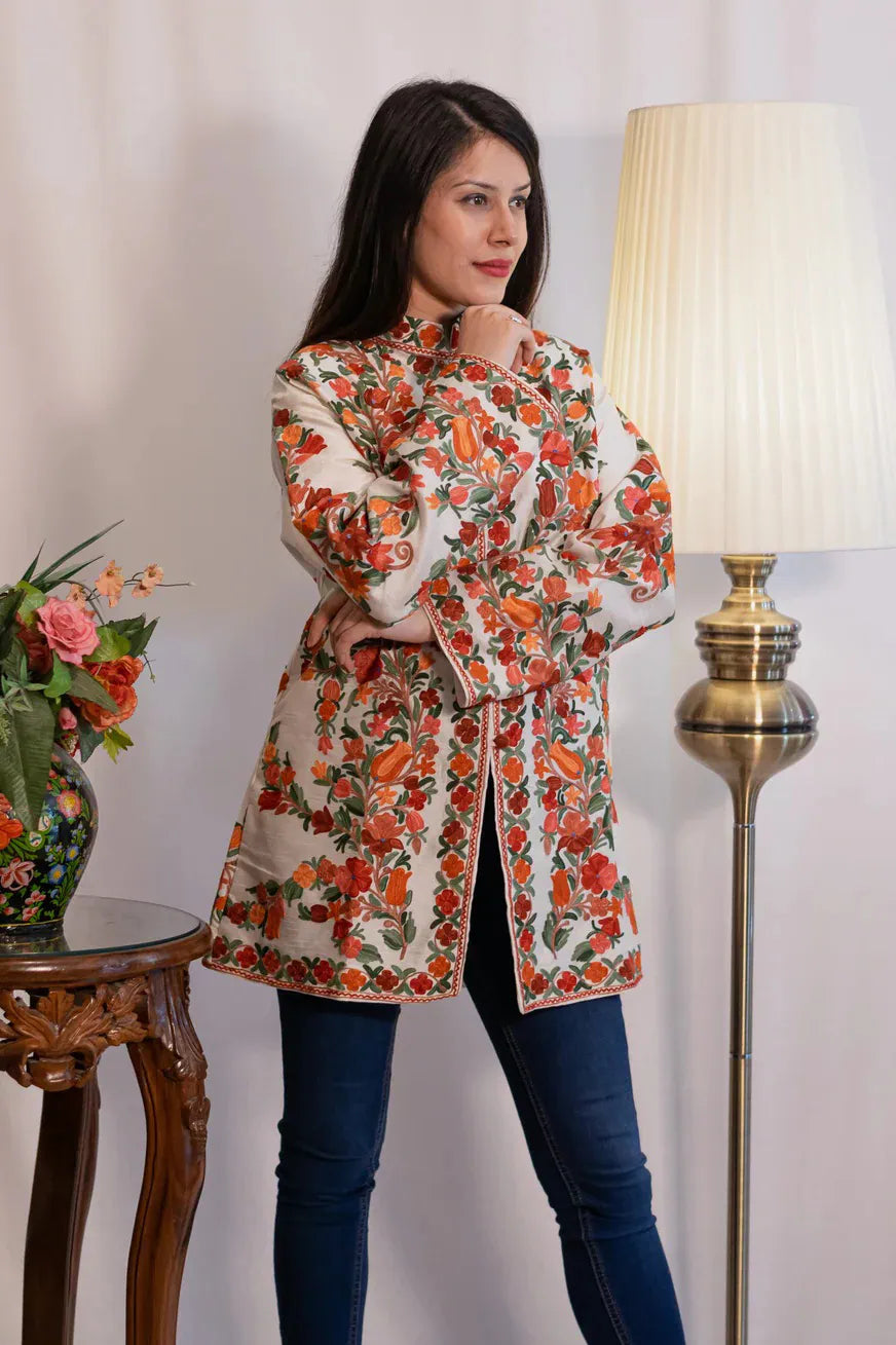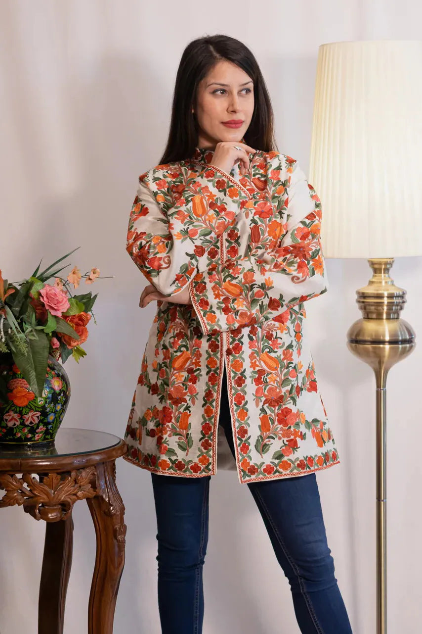 The white does not feel stark. It feels warmed, as if it has already been inside a room lit by a soft lamp. Against it, the Kashmiri Aari florals rise in vermilion, burnt orange, and deep green, climbing the front in careful symmetry. The embroidery gathers at the placket, circles the cuffs, and blooms fully across the back in a composition that feels deliberate and balanced, like a garden held within borders.