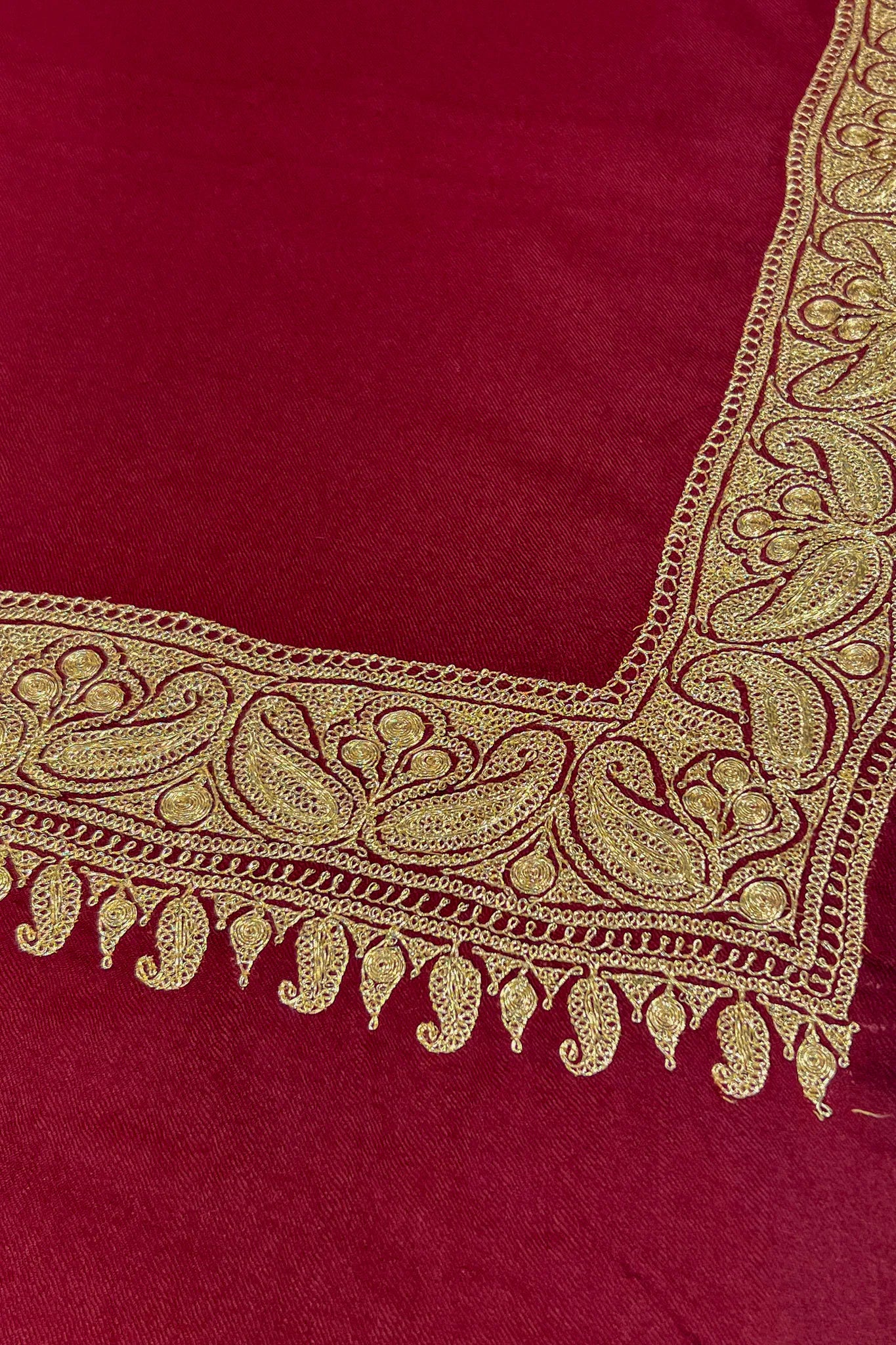 Zarmin carries the warmth of maroon the way evening holds lamplight. The colour feels settled and generous, neither bright nor dark, softened by time and touch. Along the edge, gold tilla embroidery rests with quiet confidence, catching light gently rather than demanding it. The pashmina feels smooth and reassuring in the hands, dense enough to feel protective, soft enough to invite closeness.