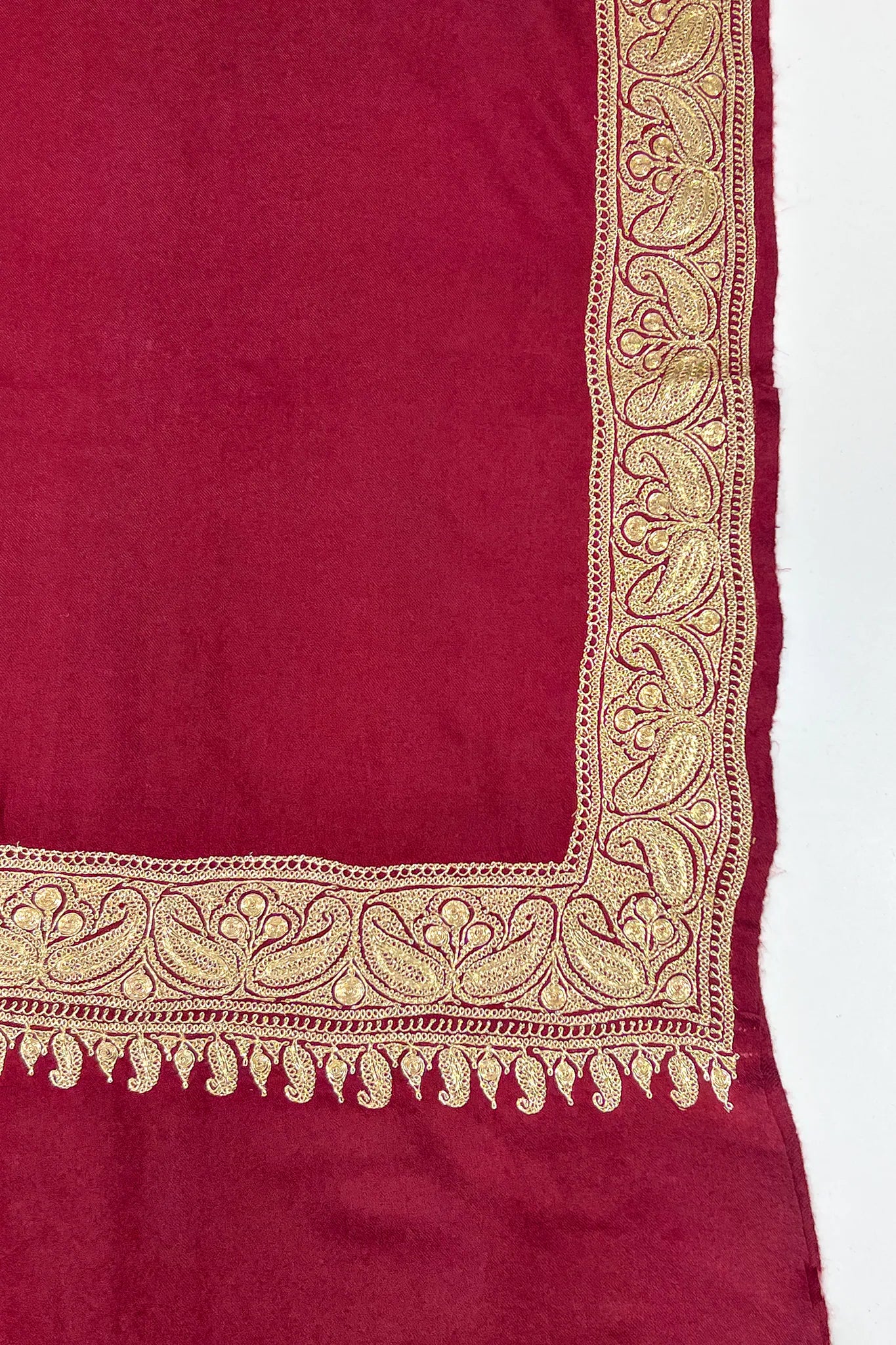 Worn, it feels ceremonial in the most personal way. The tight weave brings a sense of calm weight, while the embroidered border frames the shawl like a familiar ritual. It drapes without effort, staying close through movement and stillness alike. There is comfort in how it warms the shoulders, in how the gold thread glows softly against maroon, making it feel suited to long evenings, shared celebrations, and moments meant to linger.
