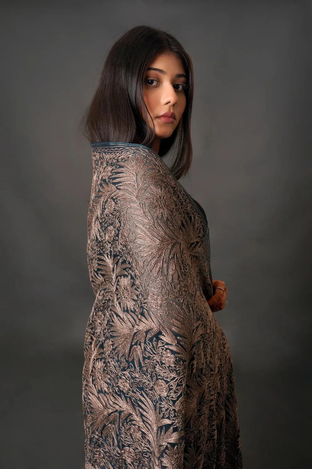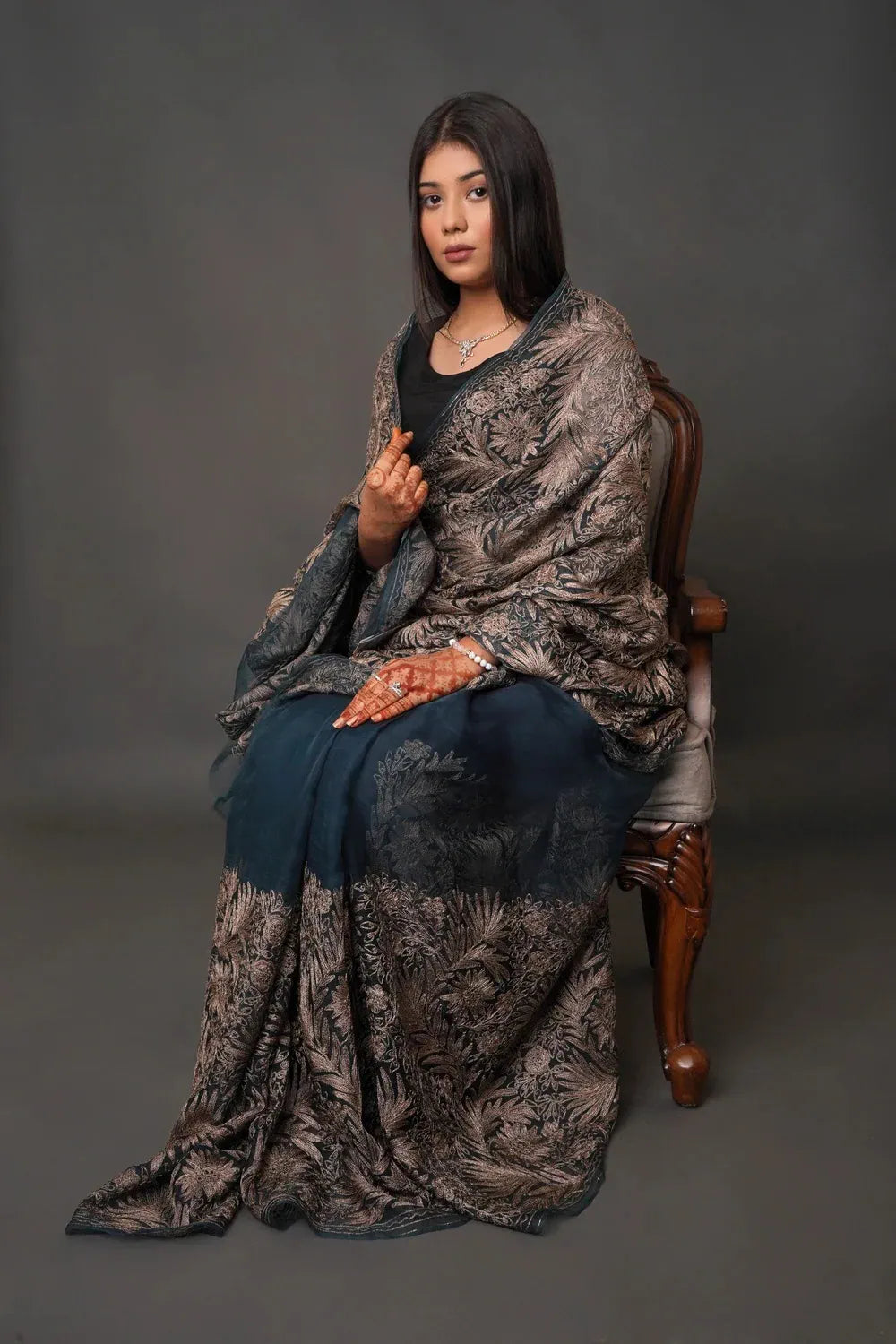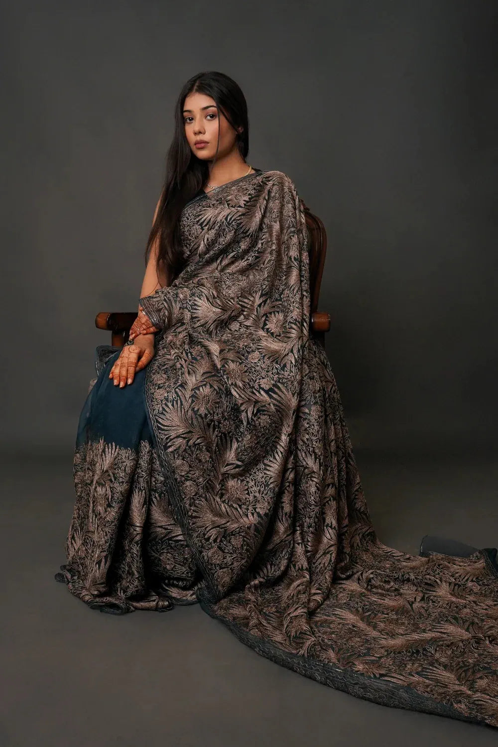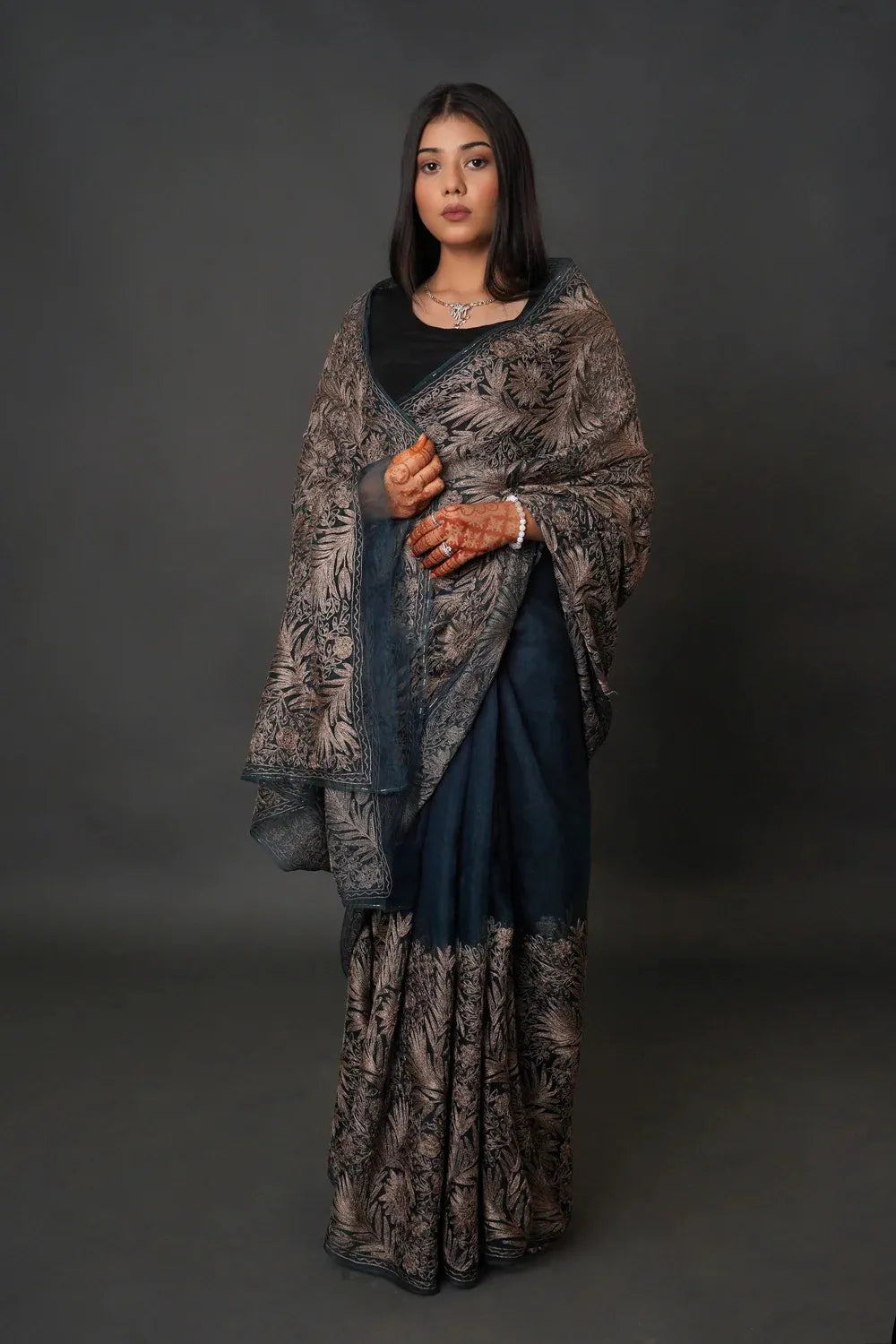 Draped in this ethereal organza saree, you feel transformed—elegant, powerful, and deeply connected to the timeless artistry of Kashmir. The delicate fabric floats with effortless ease, while the intricate Silk Thread Aari embroidery, it captures the poetry of heritage in every motif. Whether worn for weddings, intimate celebrations, or heirloom moments, this saree offers unmatched comfort, versatility, and a refined beauty that never fades. Available in rich Maroon and regal Peacock Blue, it features premium organza paired with matching blouse fabric for a complete, harmonious look.