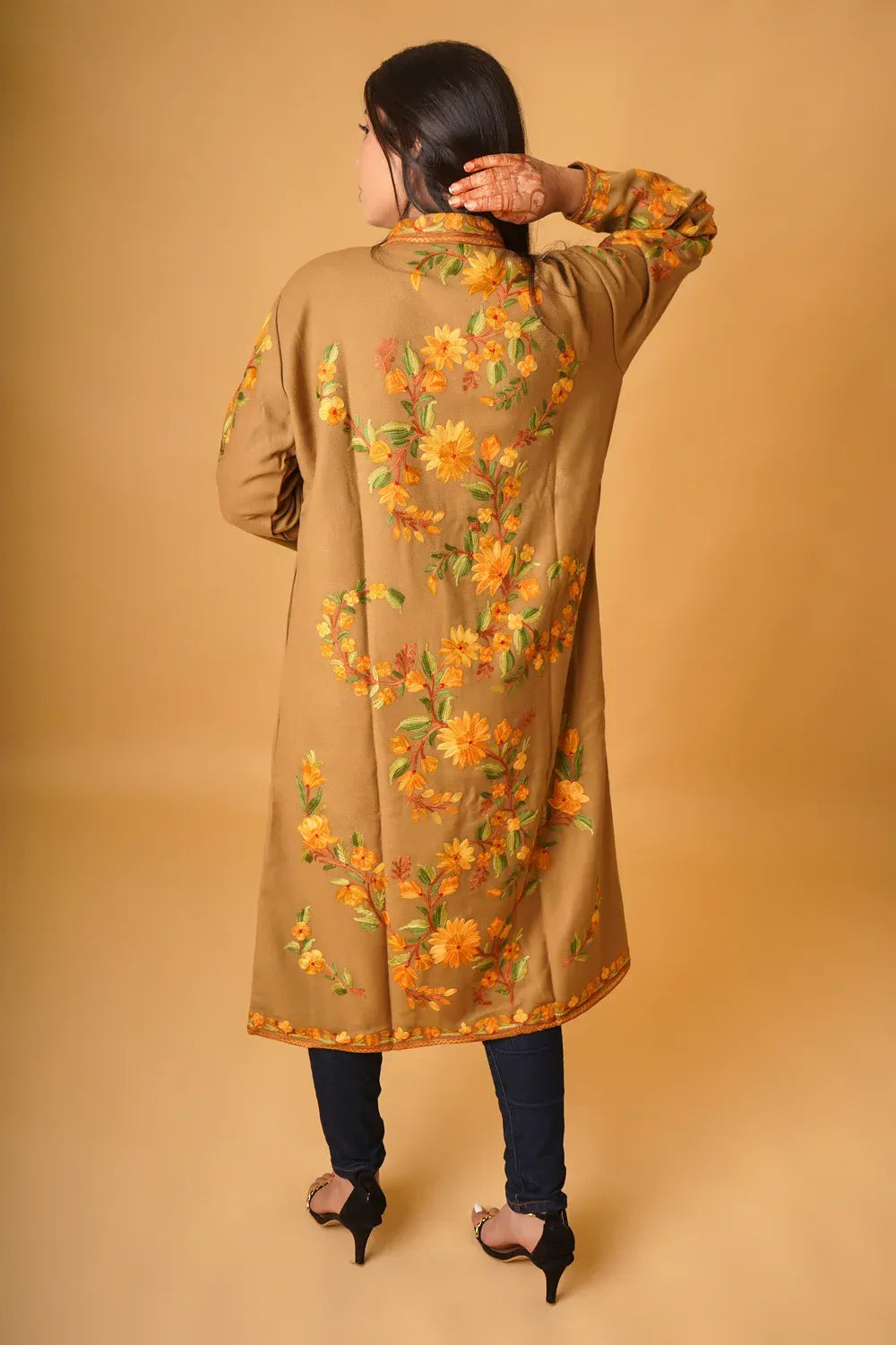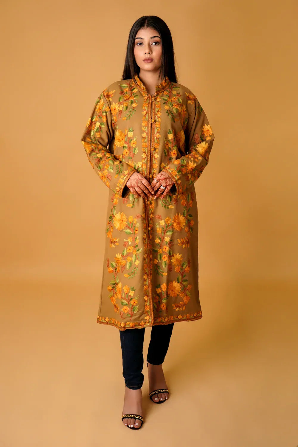 There is a certain warmth that settles the moment it is slipped on. The fawn base feels sun rested, almost like late afternoon light lingering on stone, while the multicolour Kashmiri Aari embroidery blooms across it in marigold, amber, and soft green. The surface is alive with florals that do not sit still, they climb gently along the front and sleeves, gathering near the hem as if drawn to warmth. The fabric carries a quiet structure, smooth beneath the palm, lined from within so it rests with assurance against the body.