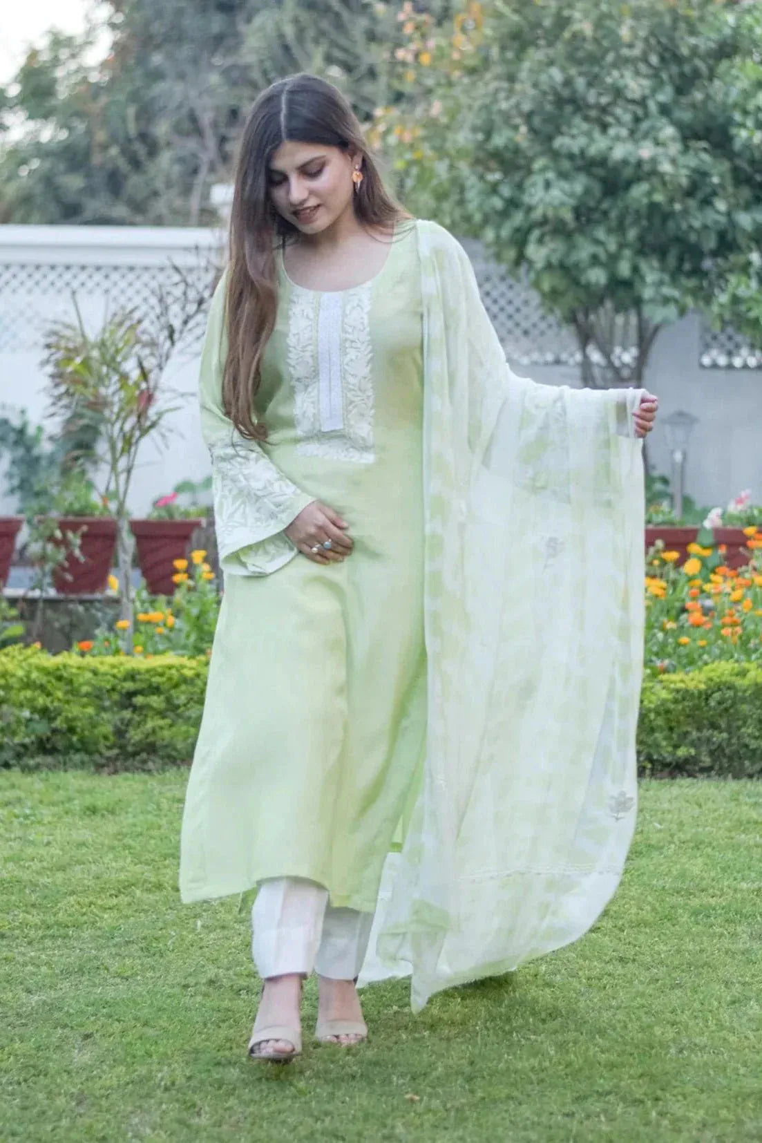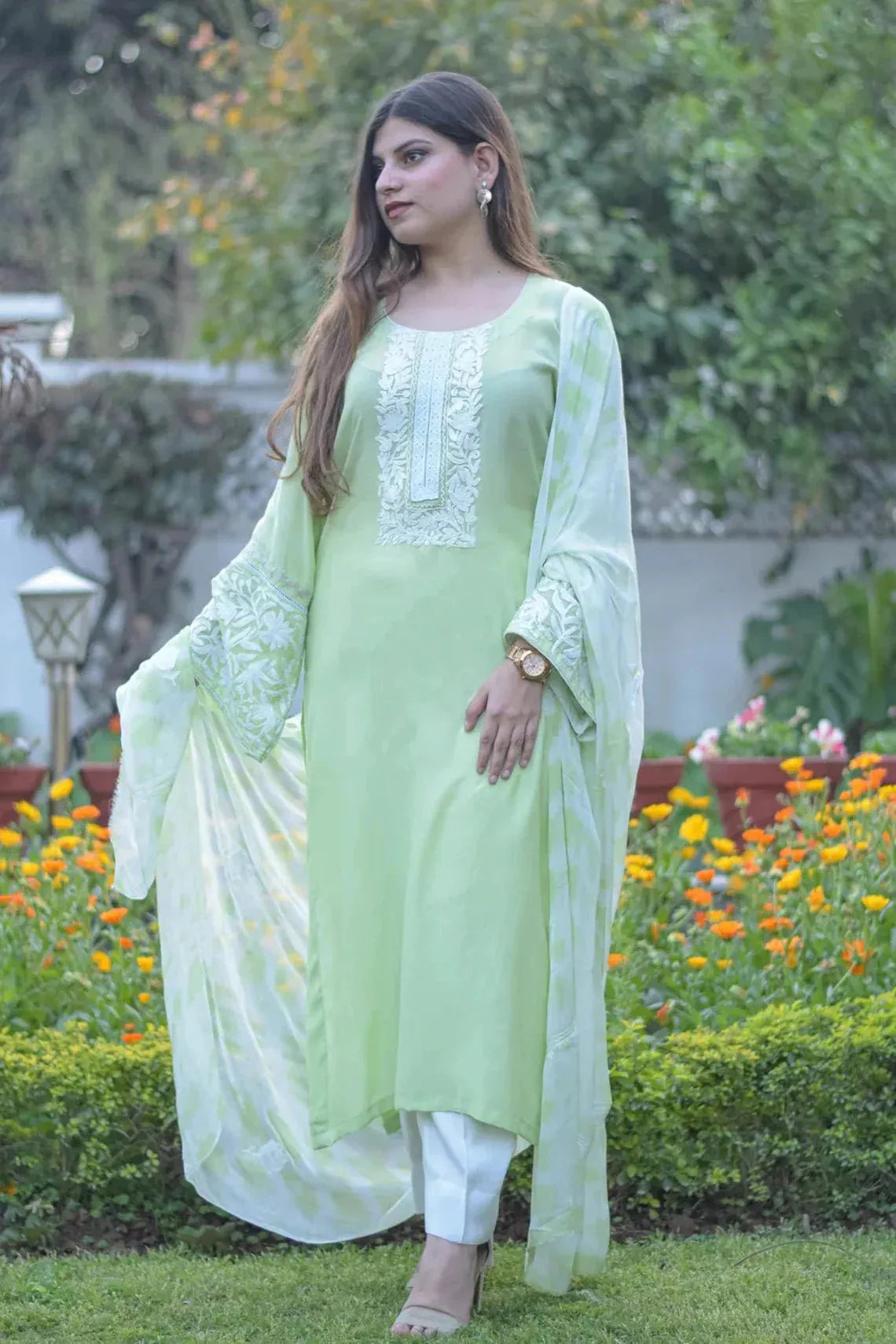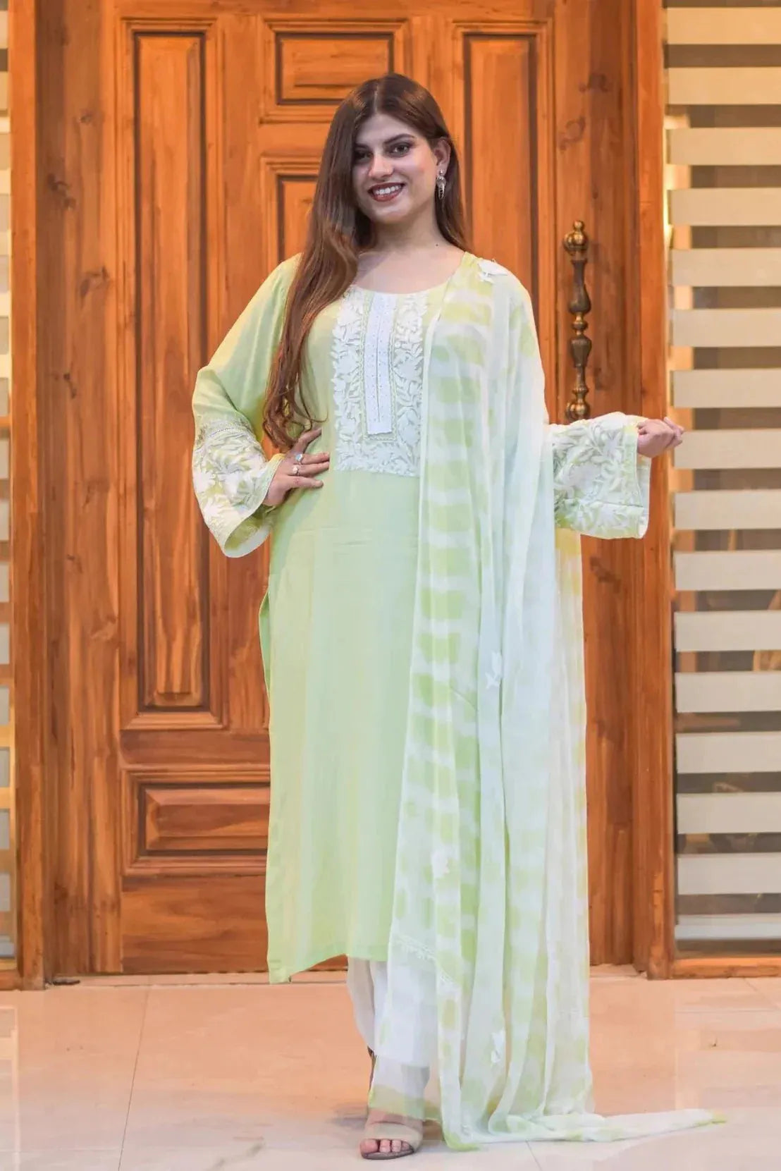 The first feeling is lightness, not in weight alone but in mood. The moss green carries a soft freshness, like air moving through a shaded garden, while the white embroidery rests quietly along the neckline, calm and assured. It feels gentle on the eye, inviting closer attention rather than demanding it.
