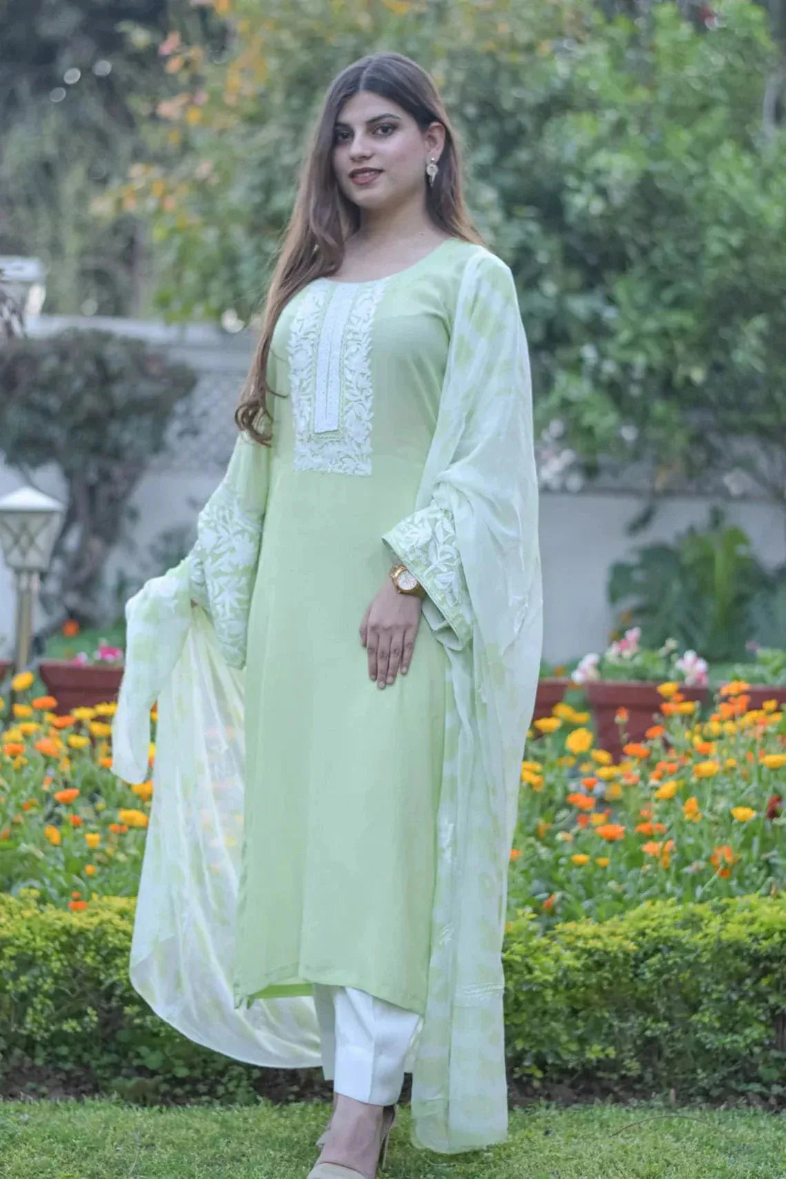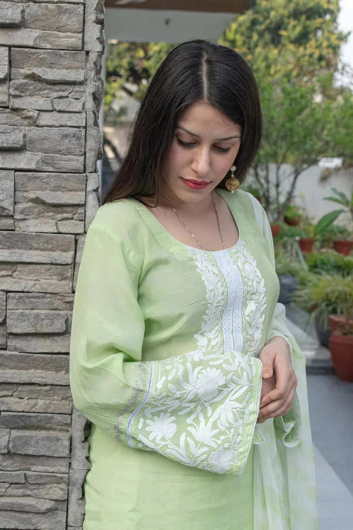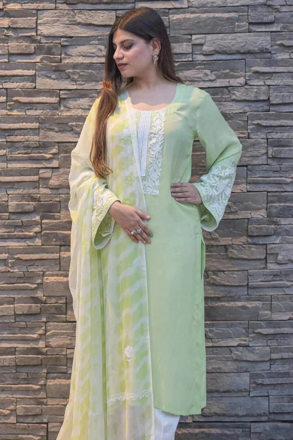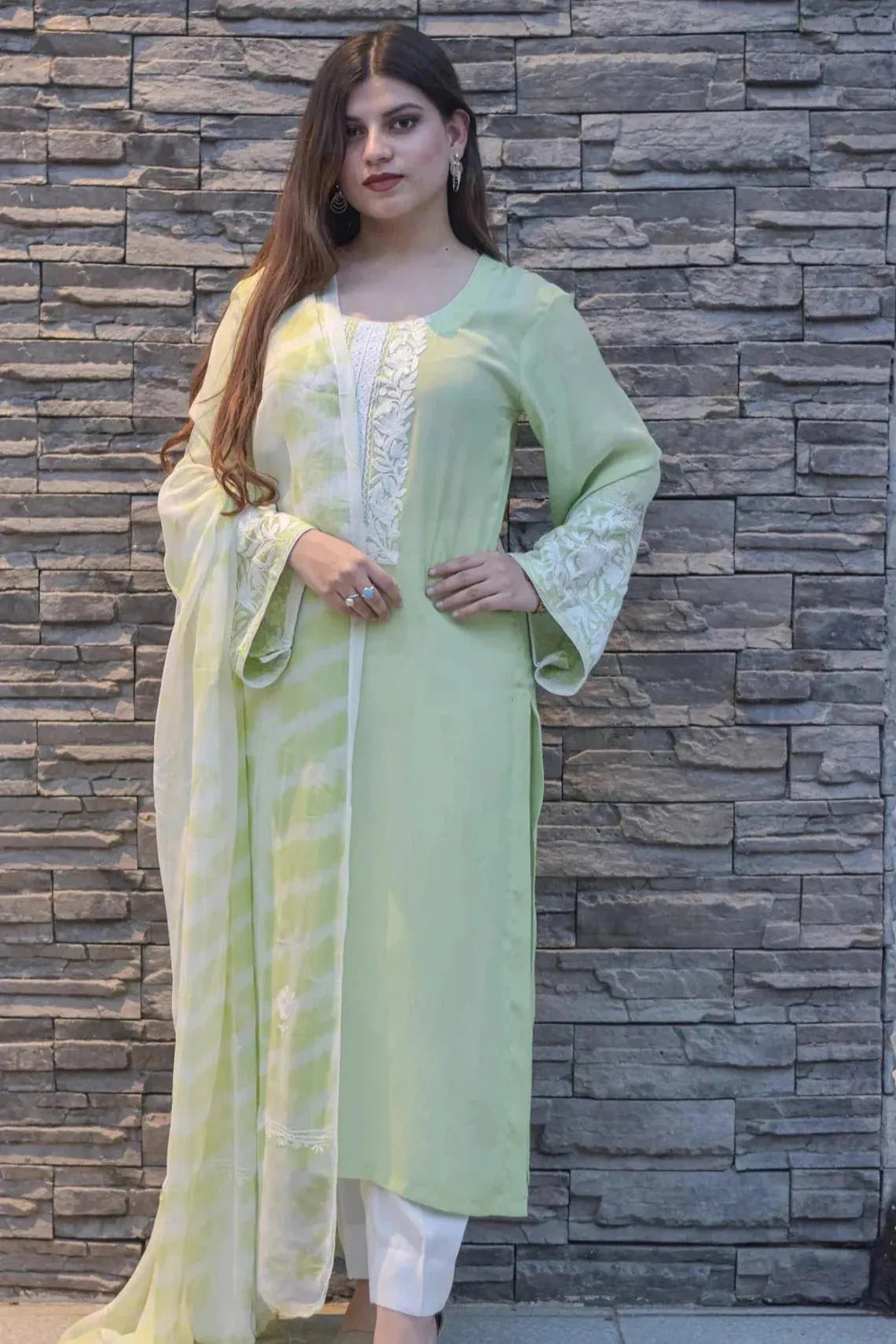 - A sheer moss or ivory chiffon dupatta worn long and loose at the side