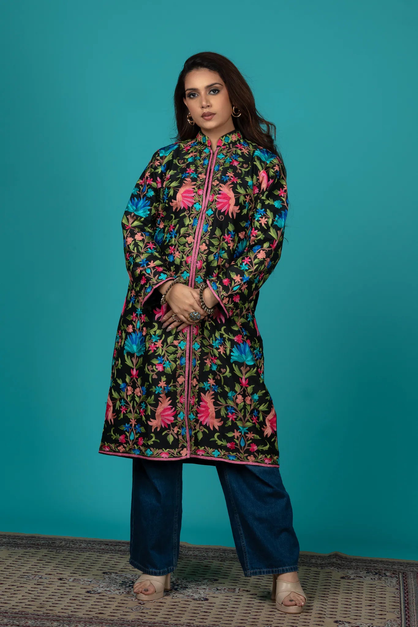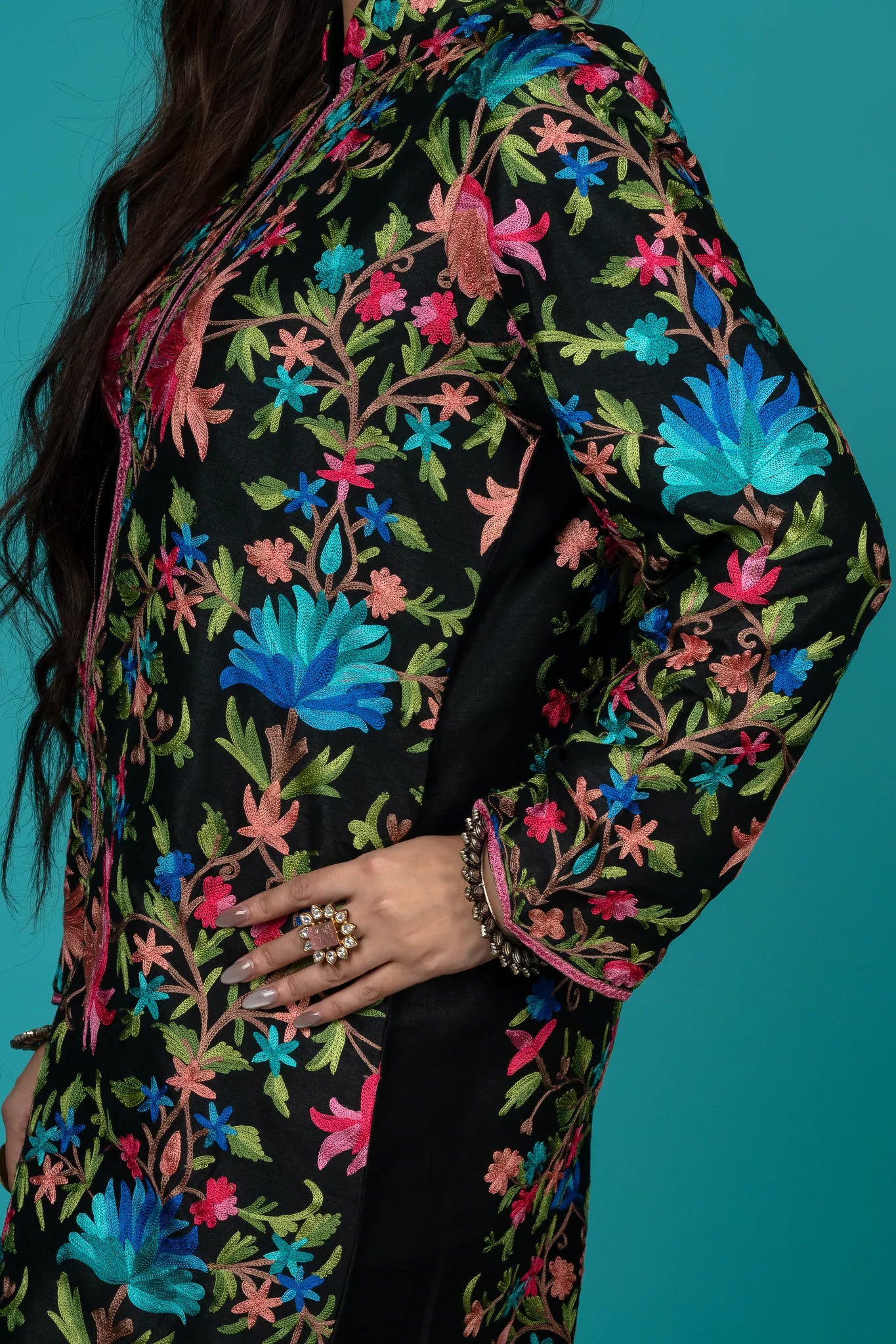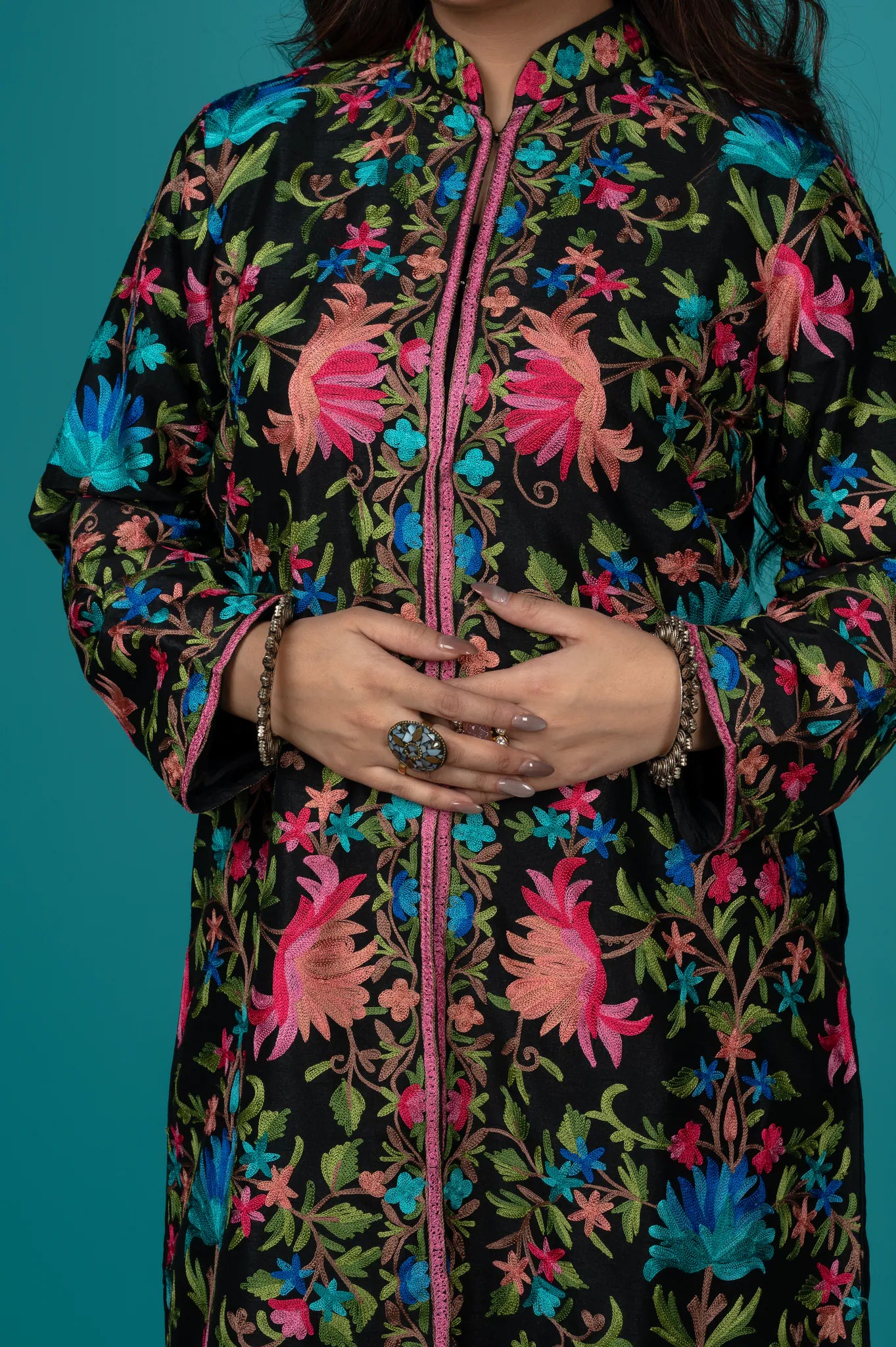 Wearing Mahveez is an experience of quiet confidence—an effortless blend of elegance, individuality, and cultural pride. Crafted to make you feel poised and deeply connected to heritage, this long coat celebrates Kashmiri artistry through intricate Aari embroidery that unfolds like a story across rich black silk. The silhouette offers comfort without compromise, refined structure without stiffness, and timeless appeal that moves seamlessly from day to evening. Fully lined for ease and longevity, Mahveez is a versatile heirloom piece designed to be worn, remembered, and passed on—an embodiment of slow luxury rooted in craft and meaning.