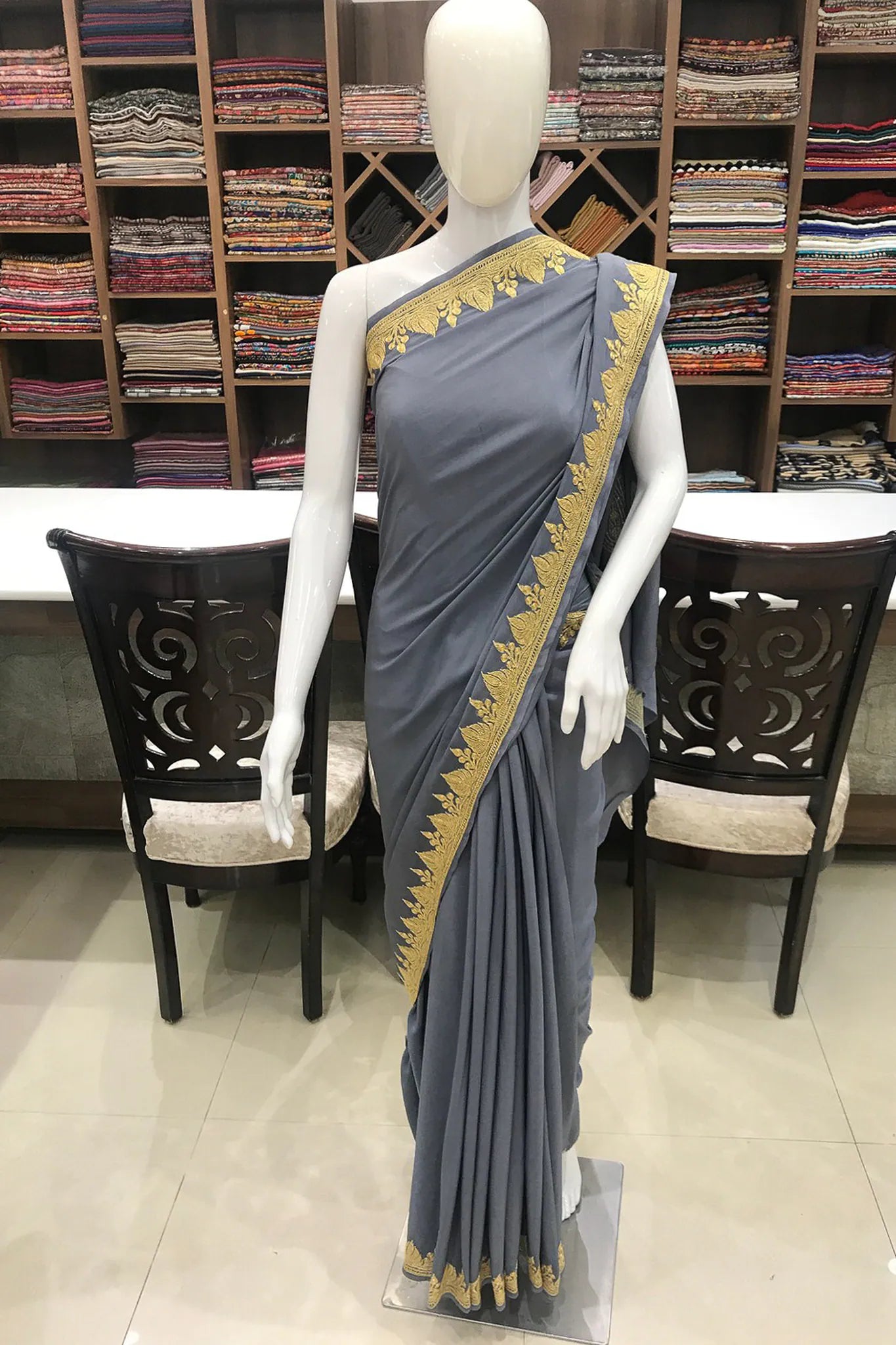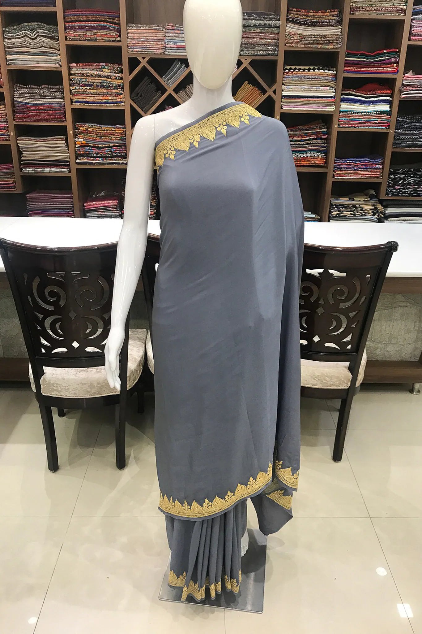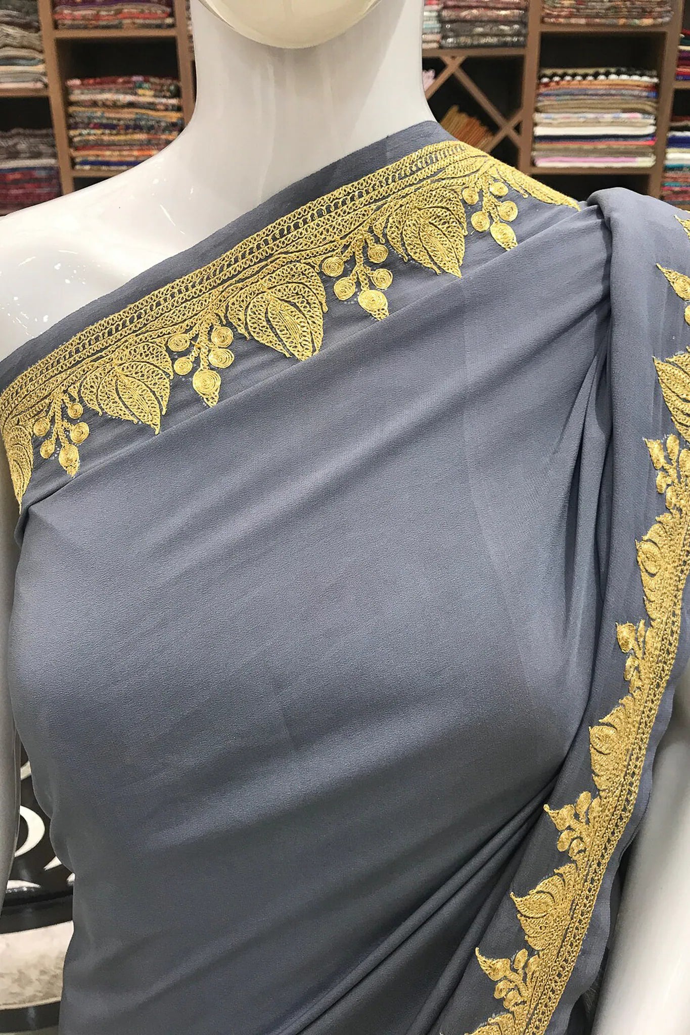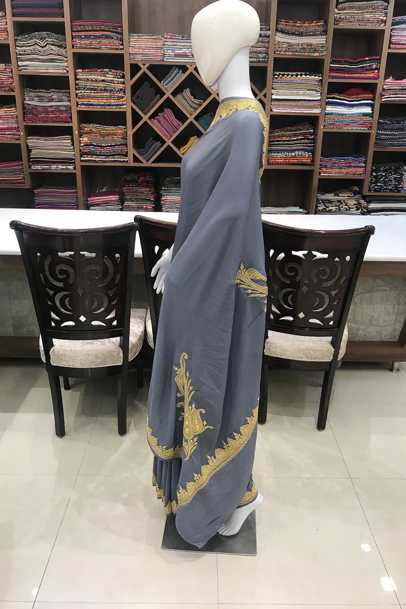 Pure Crepe Golden Zari Hand Embroidered Kashmiri Saree