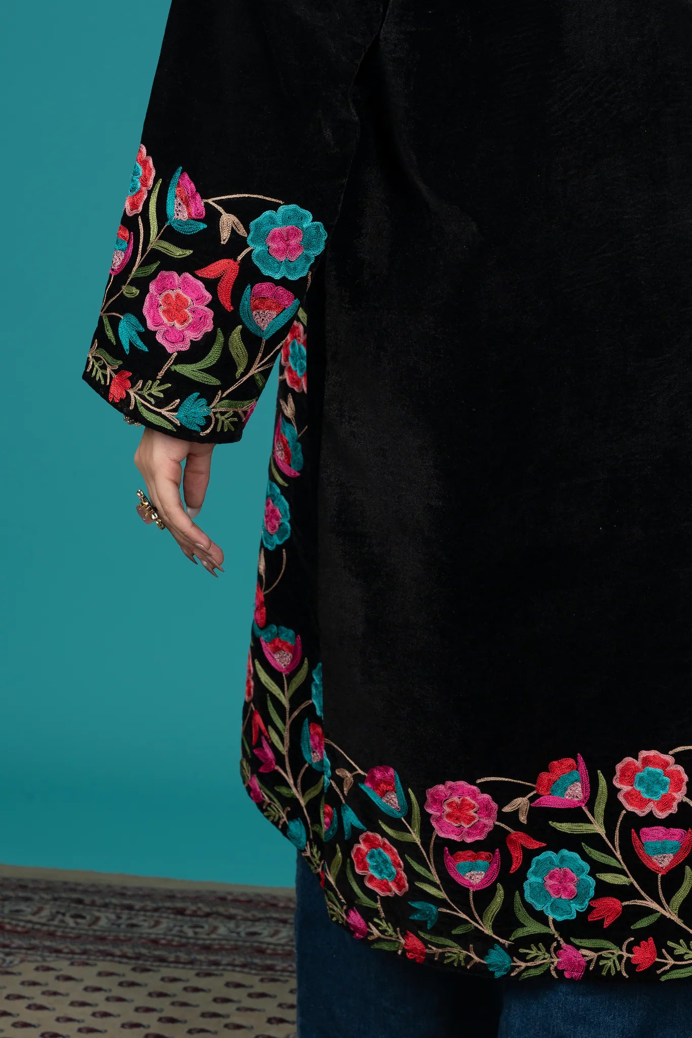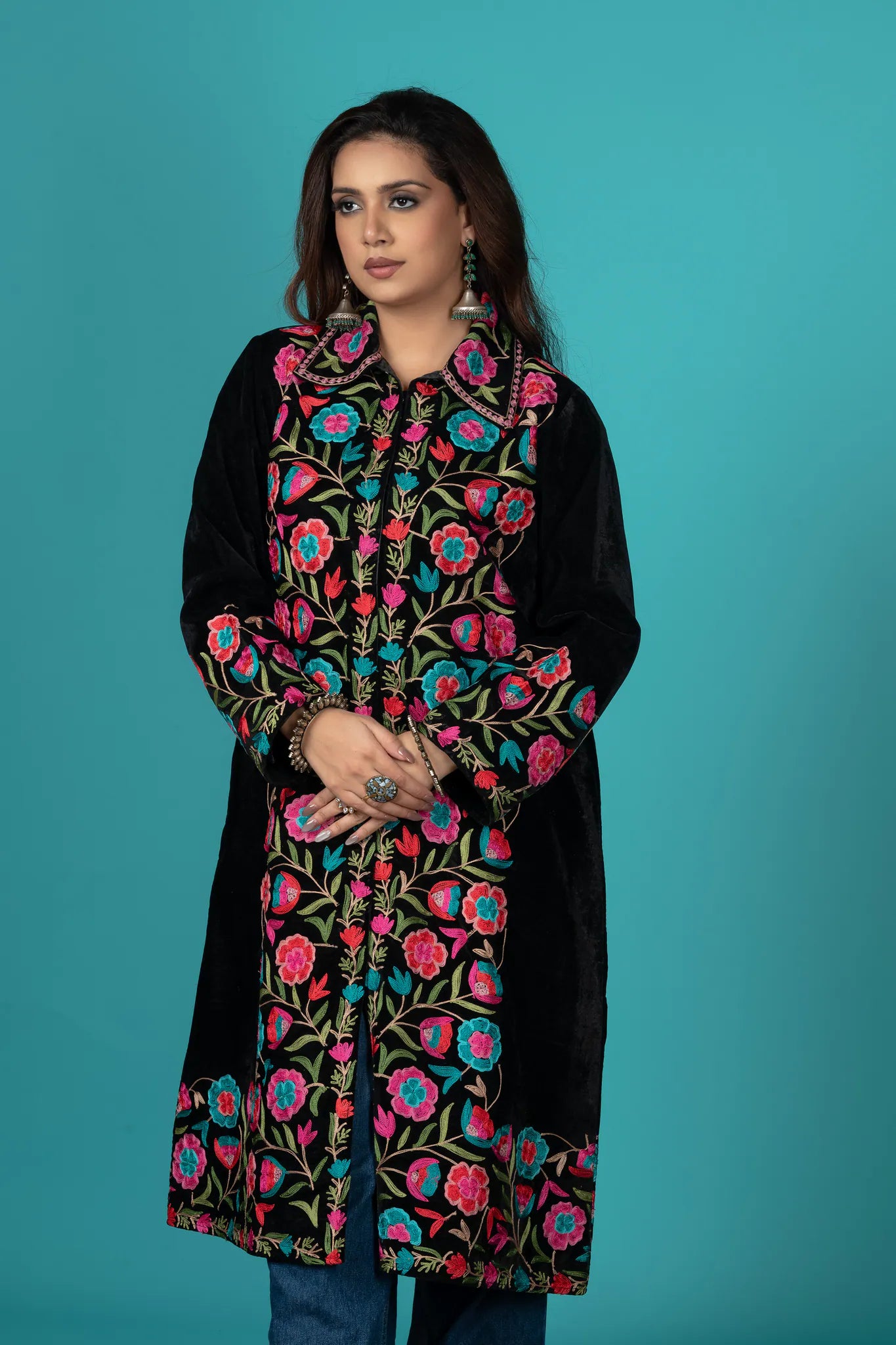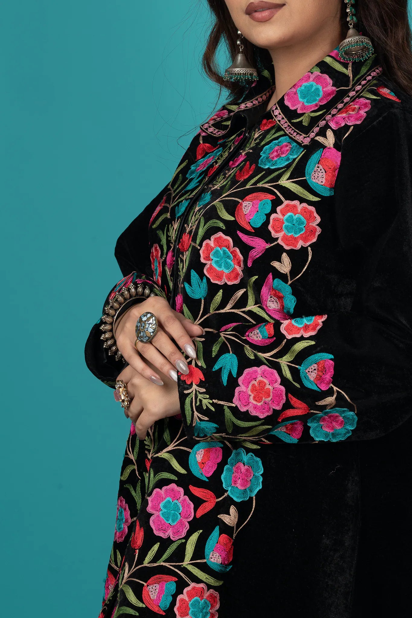 Never fading, timeless traditional Black Velvet Front Jaal Long Coat will make you look trendy and stylish no matter what. Pair it up with denim, skirt, trouser, or even a flowing dress to evoke chic in you.