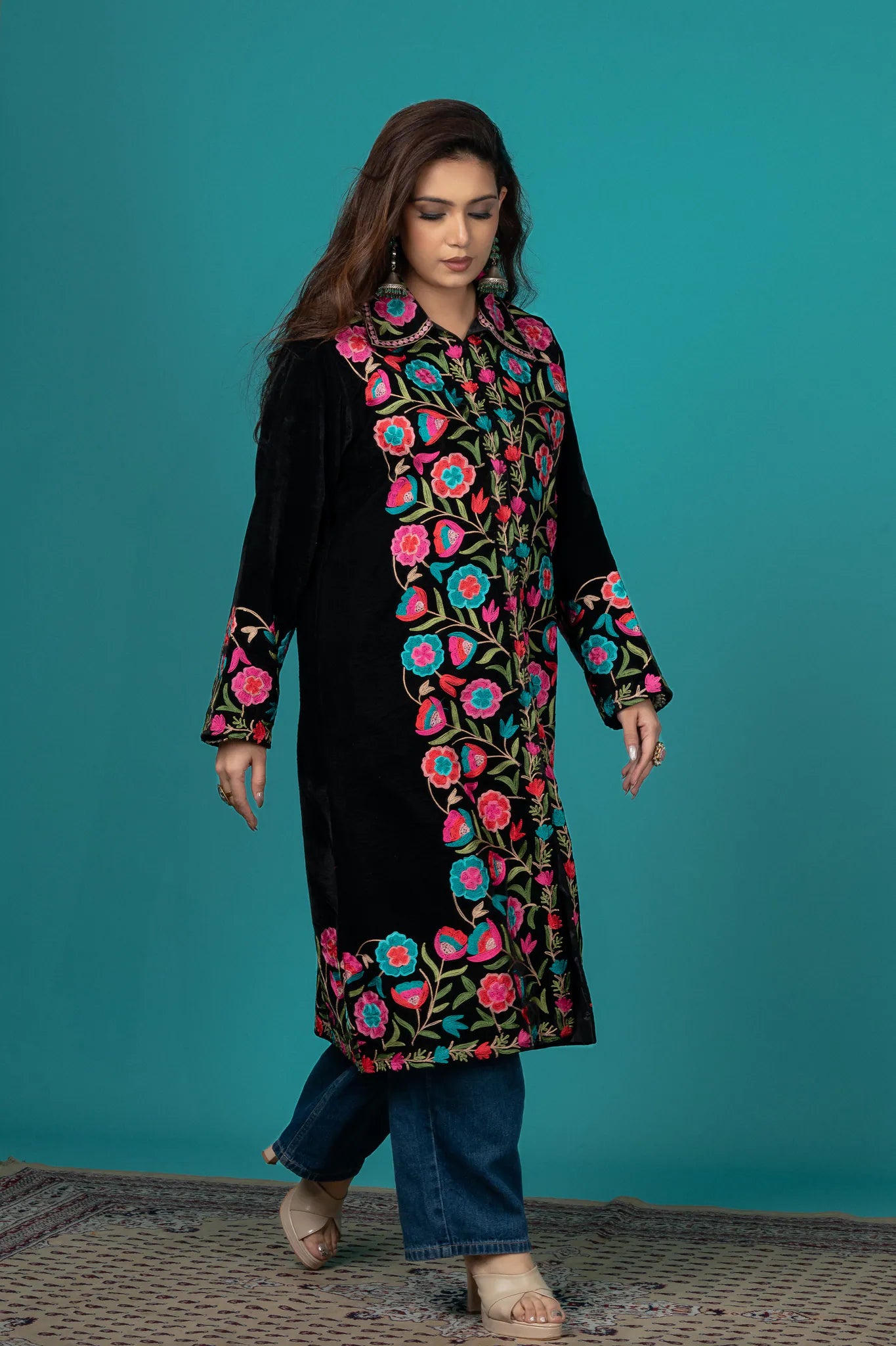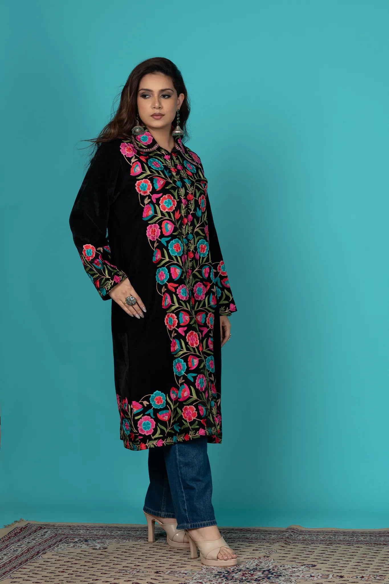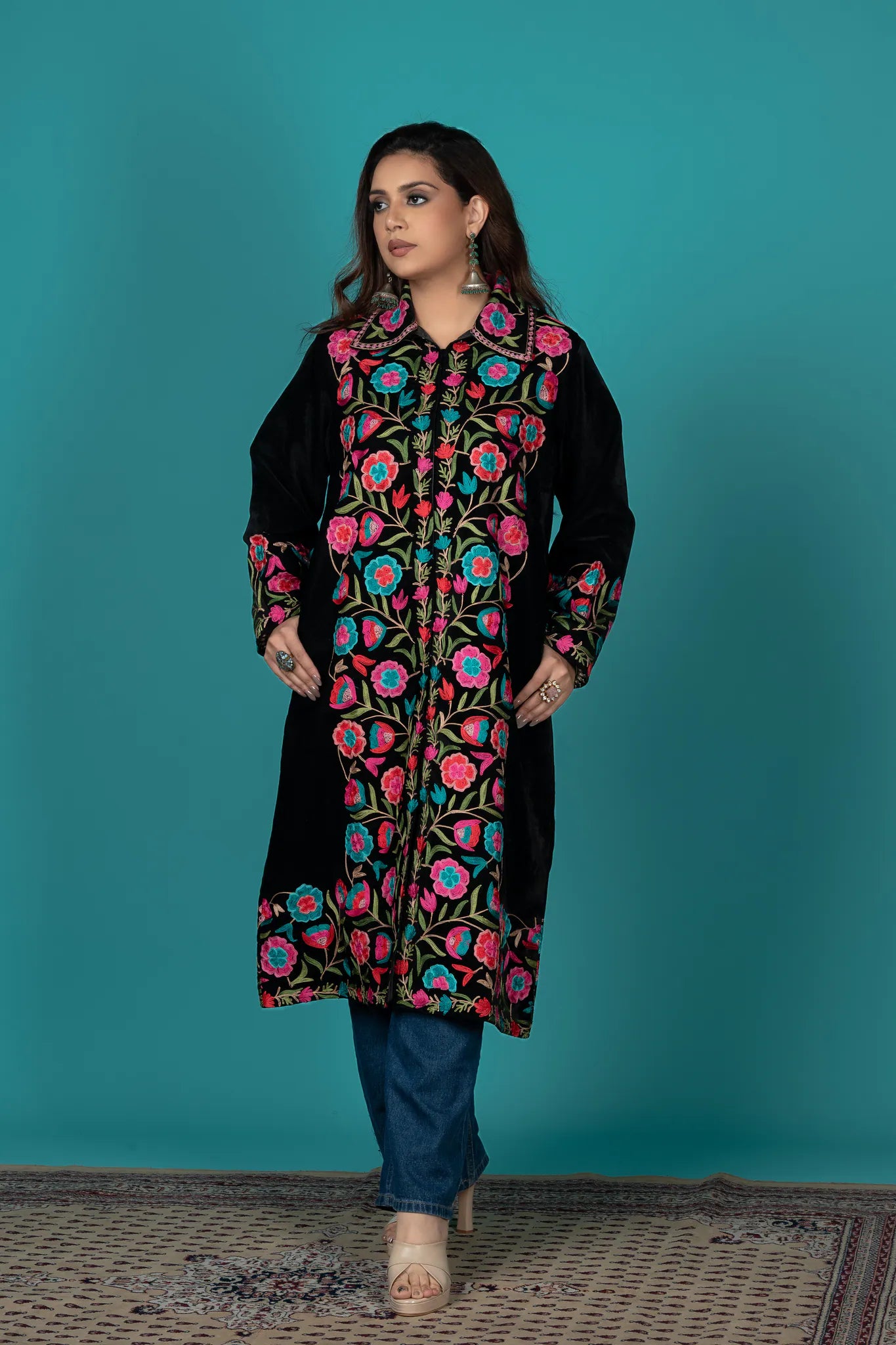 Never fading, timeless traditional Black Velvet Front Jaal Long Coat will make you look trendy and stylish no matter what. Pair it up with denim, skirt, trouser, or even a flowing dress to evoke chic in you.
