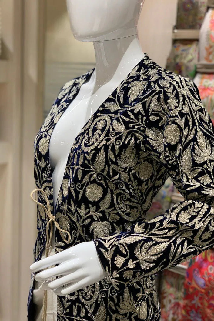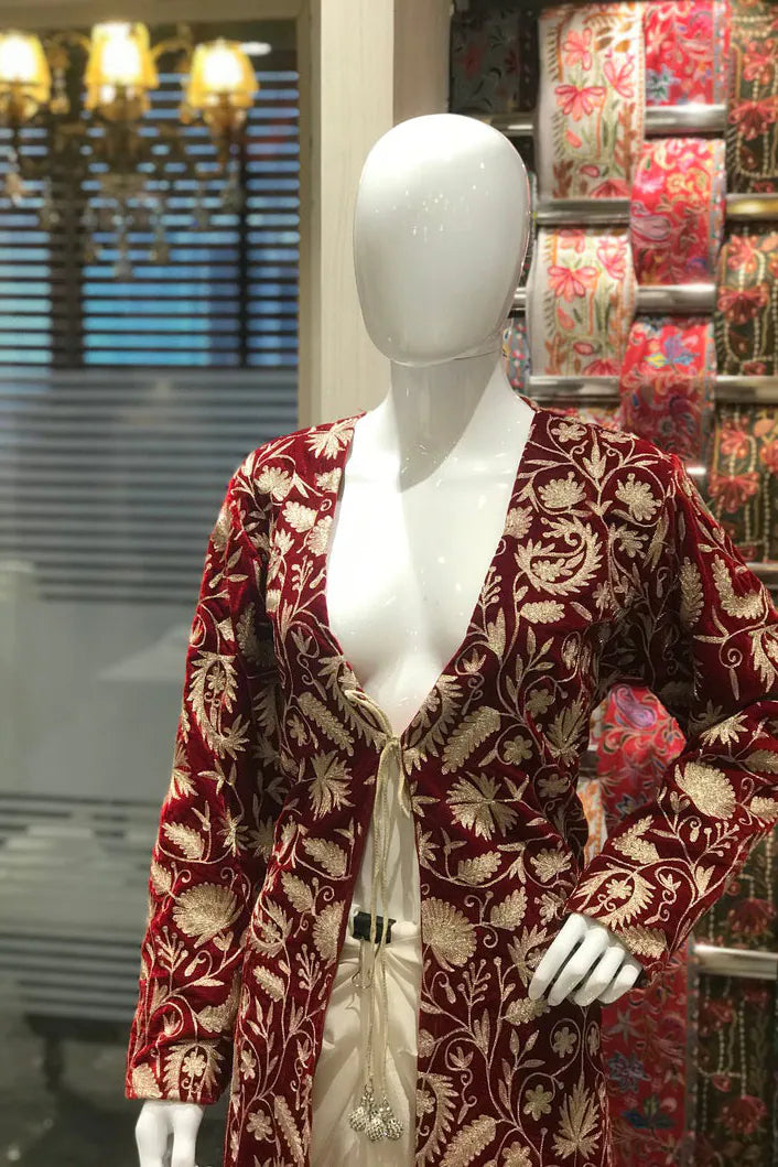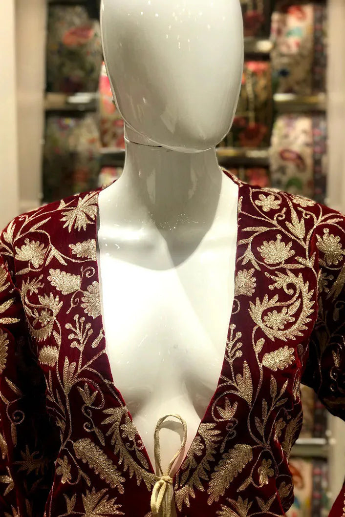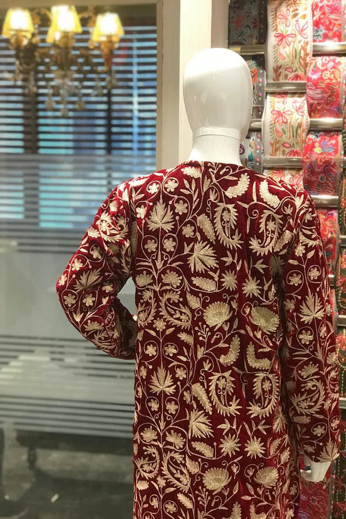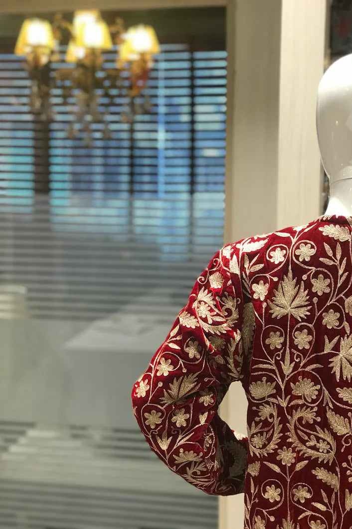 In red, it feels like warmth gathered at dusk, steady and enveloping. In navy, it leans toward something more introspective, like the hour just after conversation softens. The fine velvet holds light close to its surface, allowing the golden zari to rise gently through the Kashmiri jaal. Vines and blossoms travel in disciplined continuity across the full 42 inches, their rhythm unbroken from shoulder to hem. The gold does not glitter sharply. It hums against the richness beneath it.