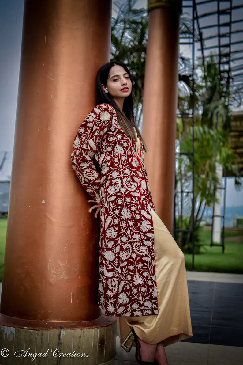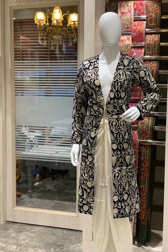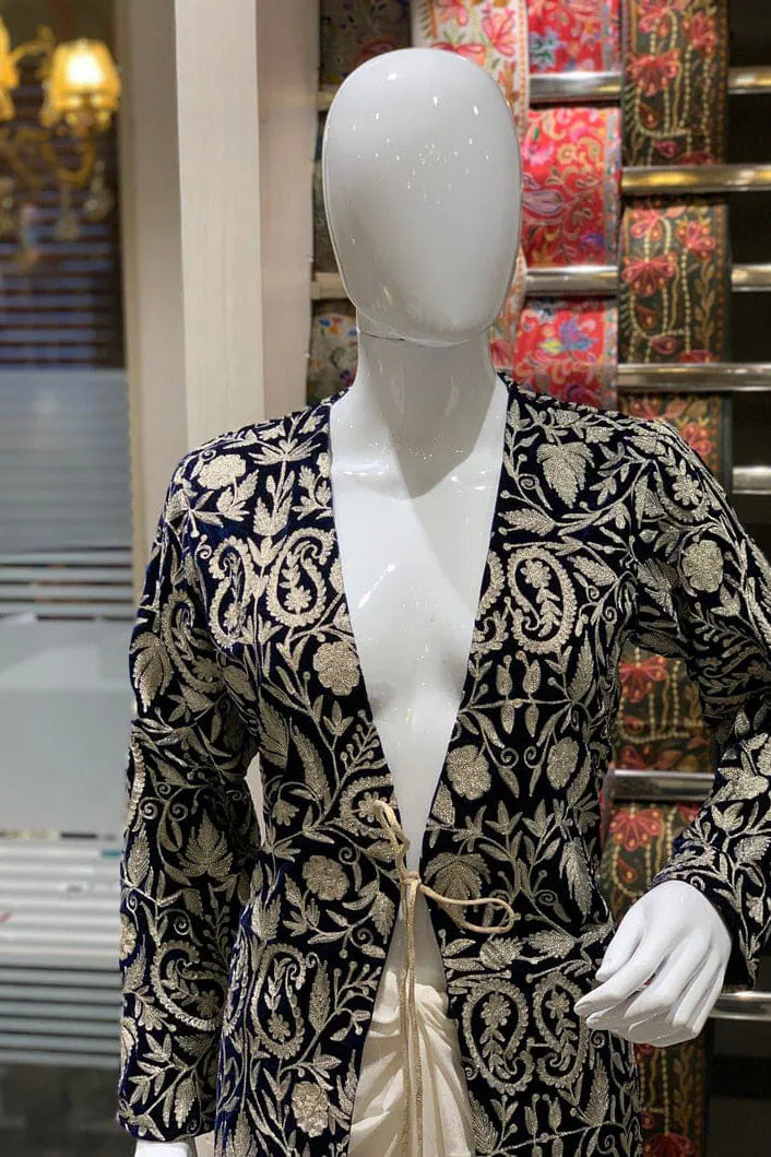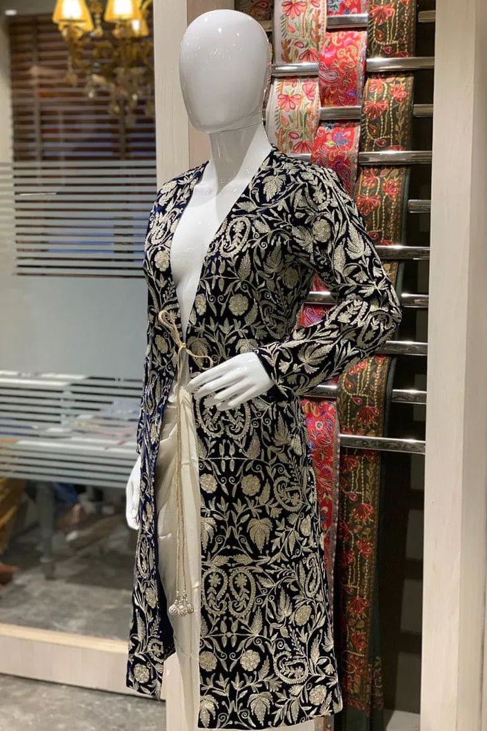 In red, it feels like warmth gathered at dusk, steady and enveloping. In navy, it leans toward something more introspective, like the hour just after conversation softens. The fine velvet holds light close to its surface, allowing the golden zari to rise gently through the Kashmiri jaal. Vines and blossoms travel in disciplined continuity across the full 42 inches, their rhythm unbroken from shoulder to hem. The gold does not glitter sharply. It hums against the richness beneath it.