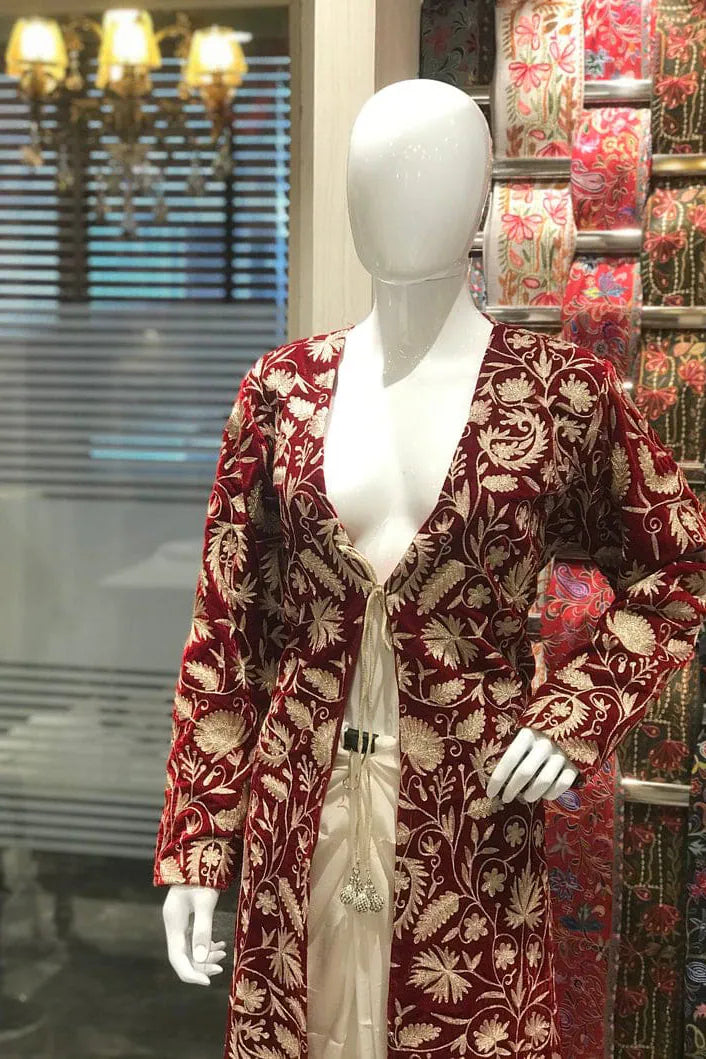 - Wear the red version open atop an ivory floor length anarkali, allowing the velvet hem to rest just above the flare.