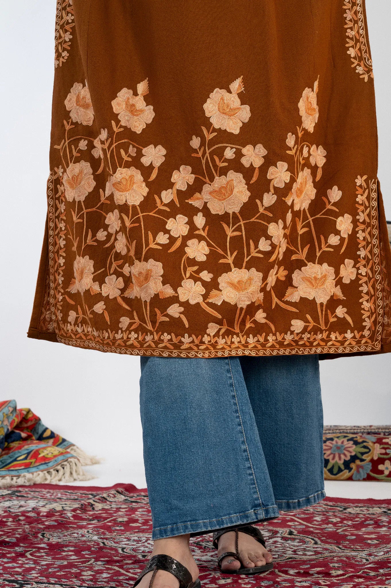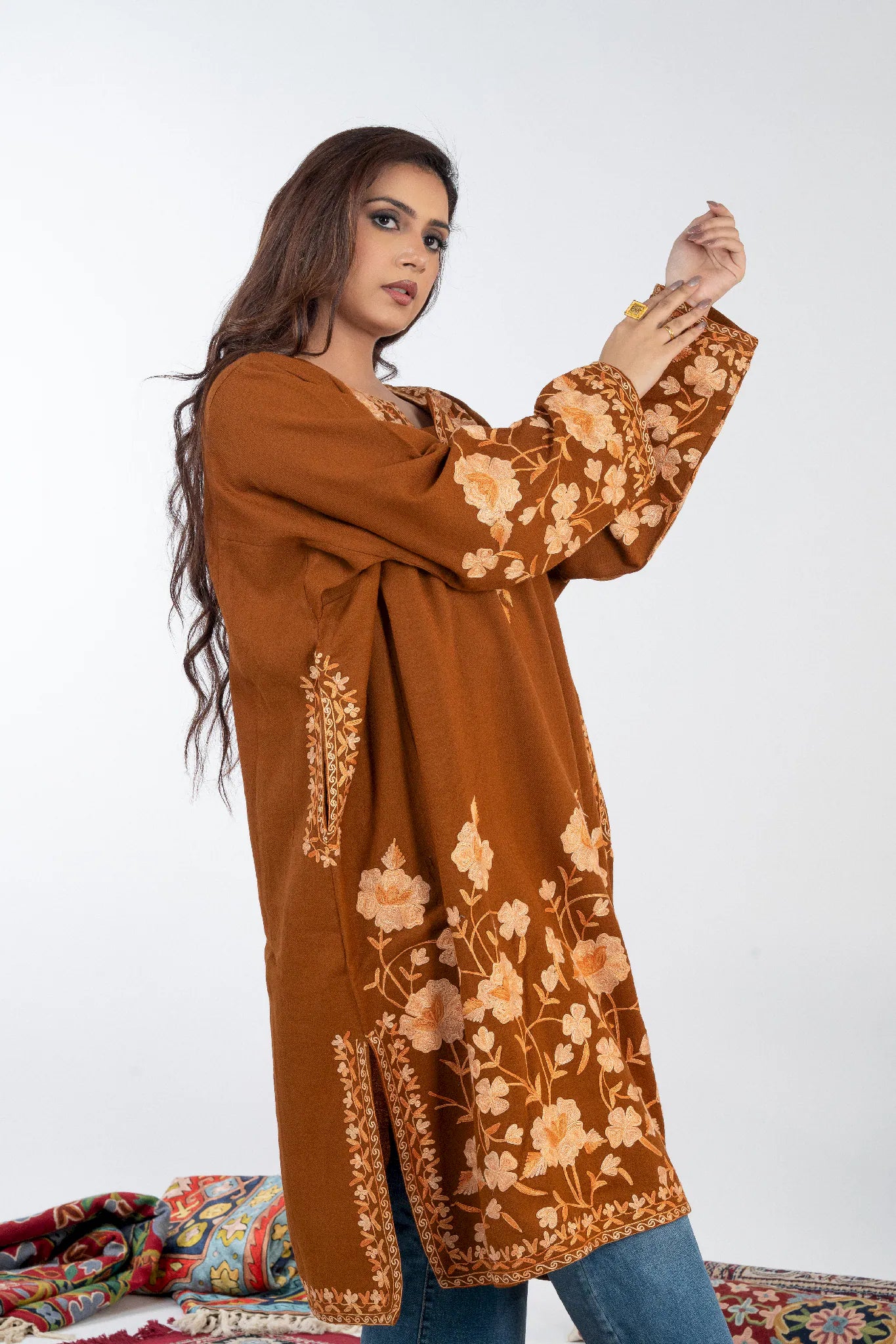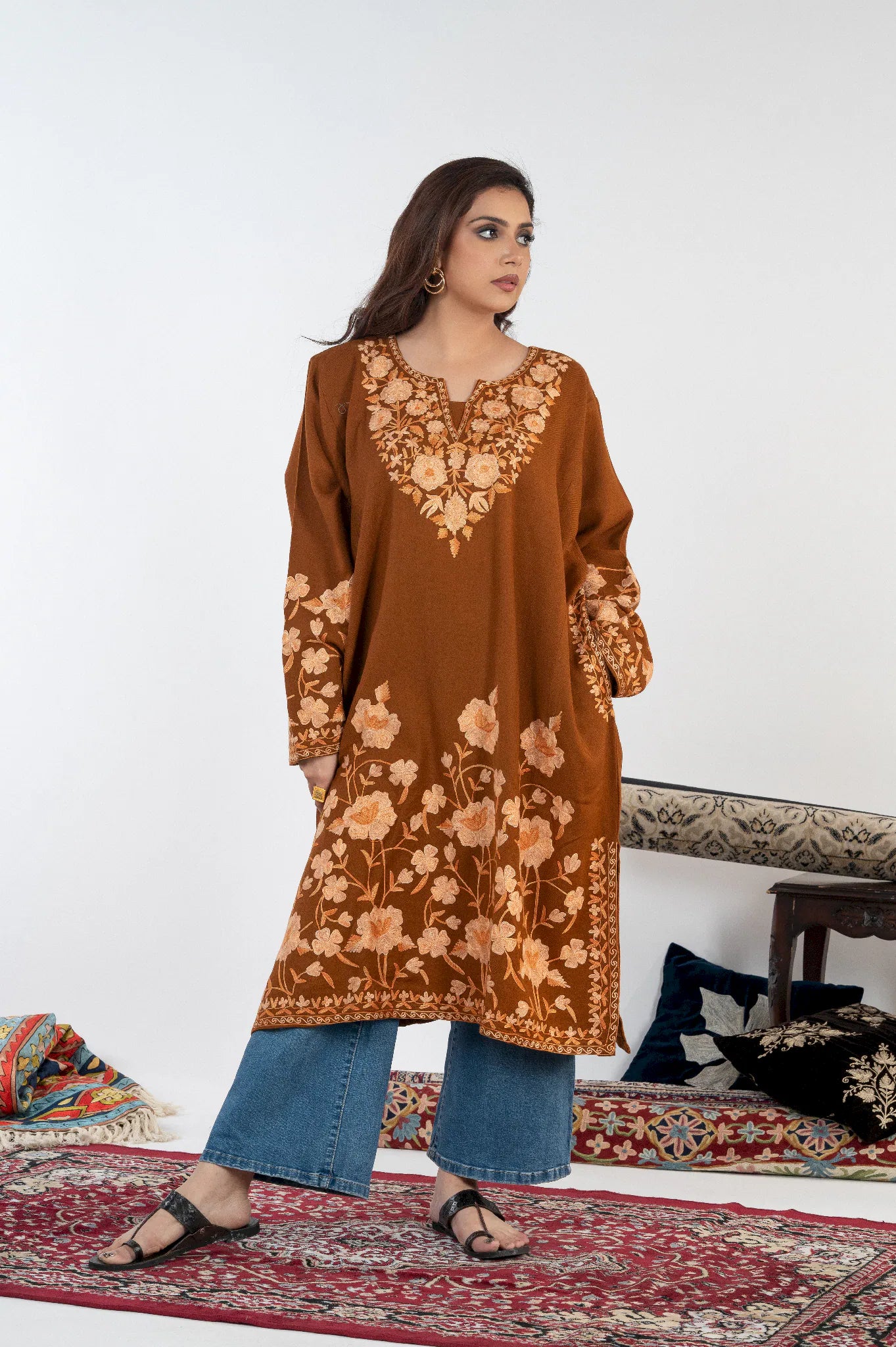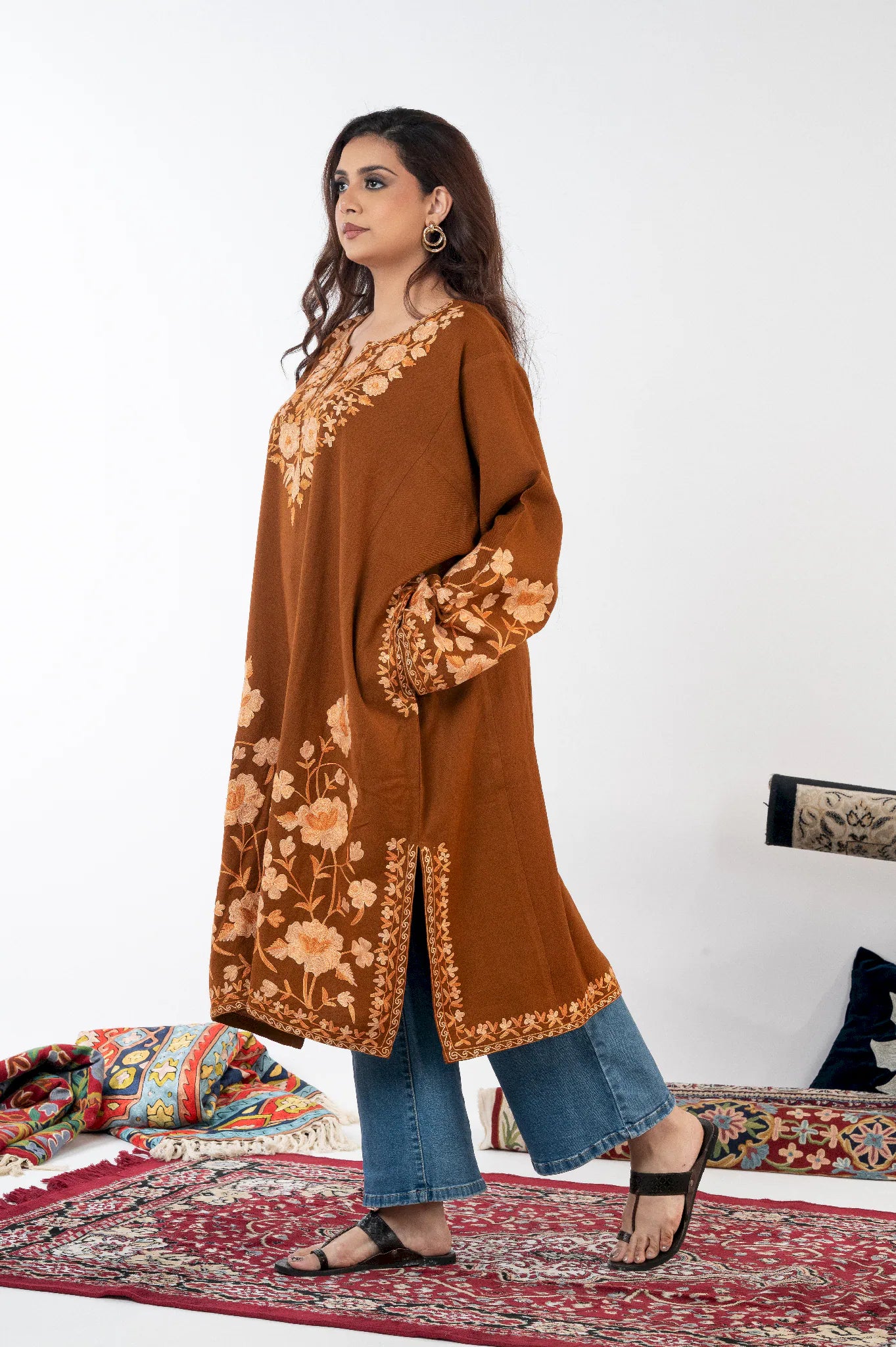 Worn with quiet confidence, Rukhsaar envelops you in warmth, grace, and a deep connection to Kashmiri heritage. This Phiran tunic is crafted in pure wool, offering natural comfort while flowing effortlessly with the body. Intricate multicolour Aari embroidery blooms across a rich brown base, reflecting generations of artisan mastery and timeless elegance. Designed for versatility and longevity, Rukhsaar transitions seamlessly from everyday refinement to meaningful celebrations, finished with functional side pockets and a customisable 40 inch length for a thoughtful, personal fit.