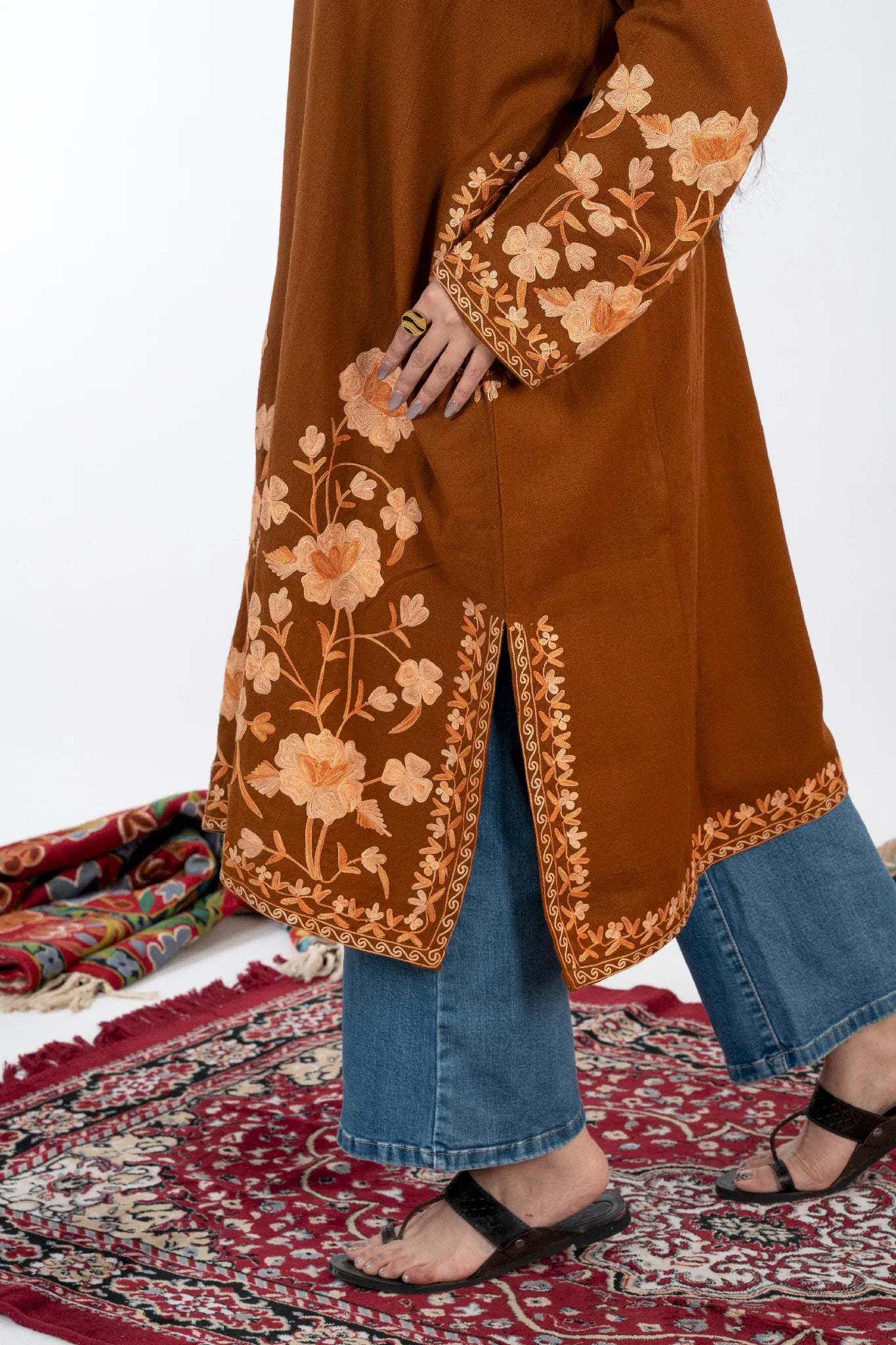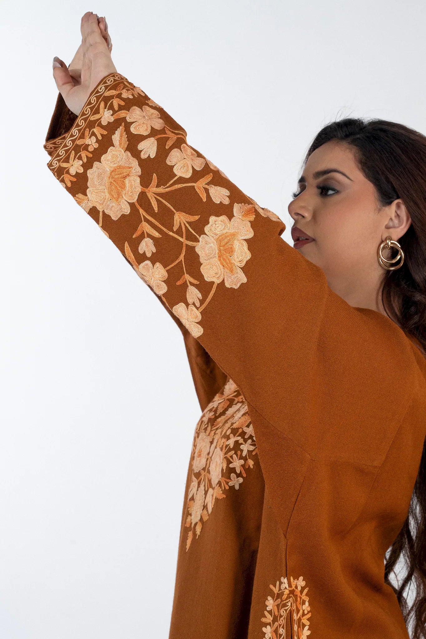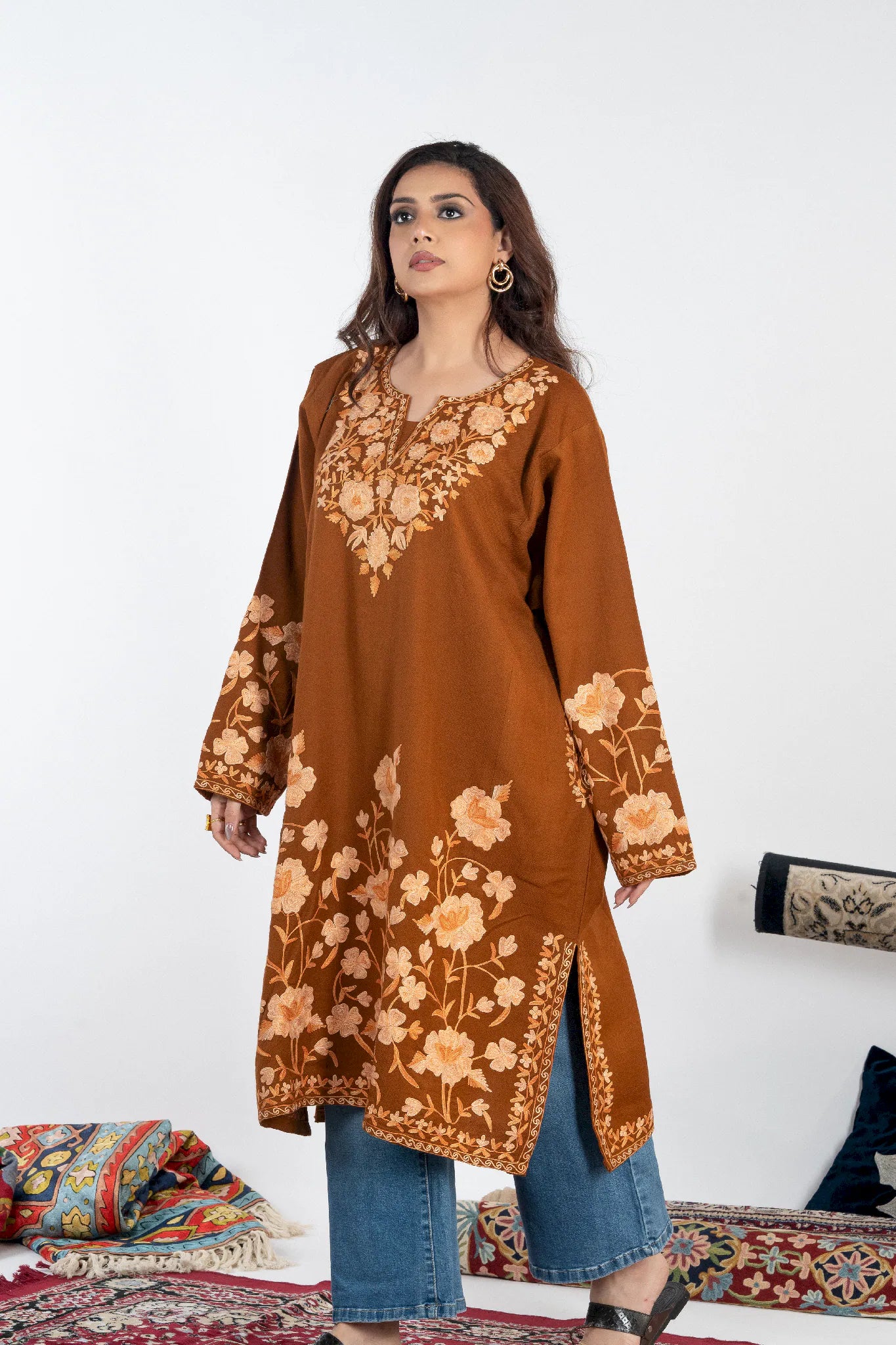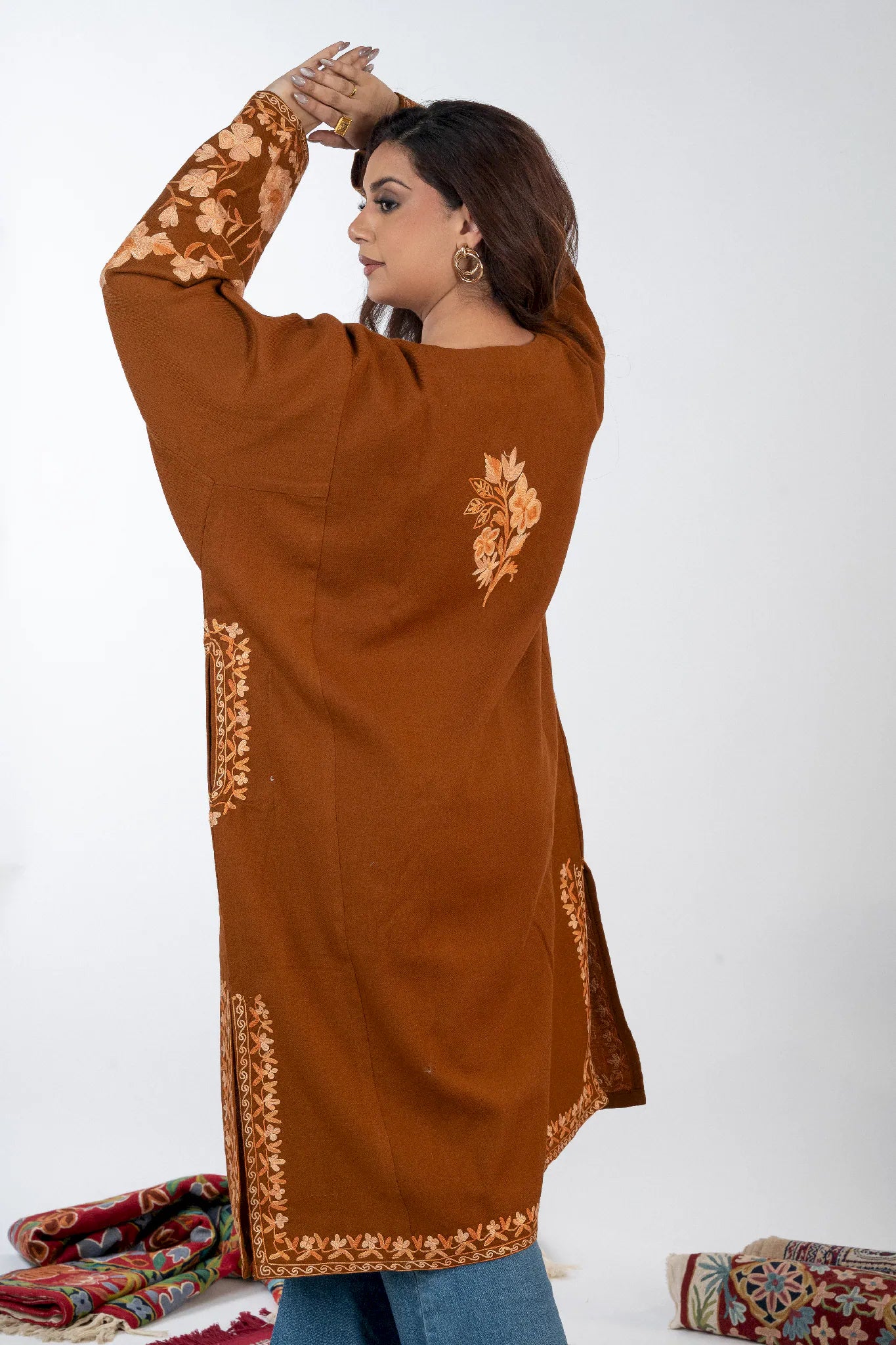 Worn with quiet confidence, Rukhsaar envelops you in warmth, grace, and a deep connection to Kashmiri heritage. This Phiran tunic is crafted in pure wool, offering natural comfort while flowing effortlessly with the body. Intricate multicolour Aari embroidery blooms across a rich brown base, reflecting generations of artisan mastery and timeless elegance. Designed for versatility and longevity, Rukhsaar transitions seamlessly from everyday refinement to meaningful celebrations, finished with functional side pockets and a customisable 40 inch length for a thoughtful, personal fit.