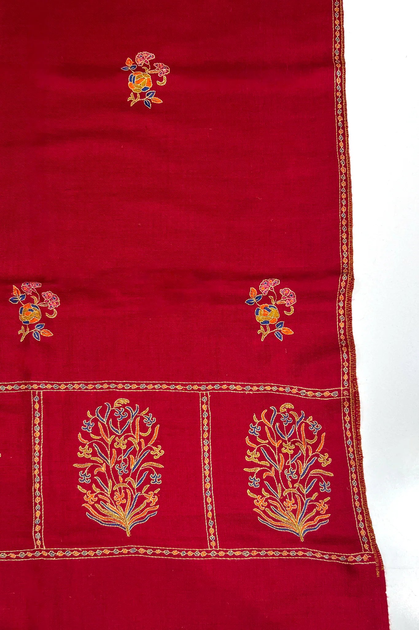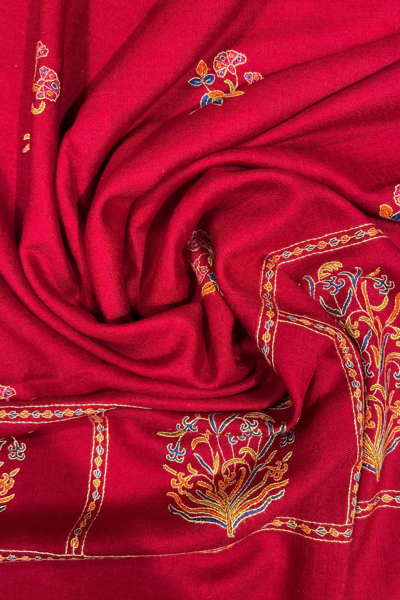 Ruvira arrives in a deep red that feels immediately festive, the kind of red warmed by evening lamps and quiet conversations. The surface holds a gentle sheen, not reflective but alive, allowing the embroidery to emerge slowly. Floral forms rise and rest across the fabric in saffron, indigo, and soft gold tones, creating a sense of movement without urgency.