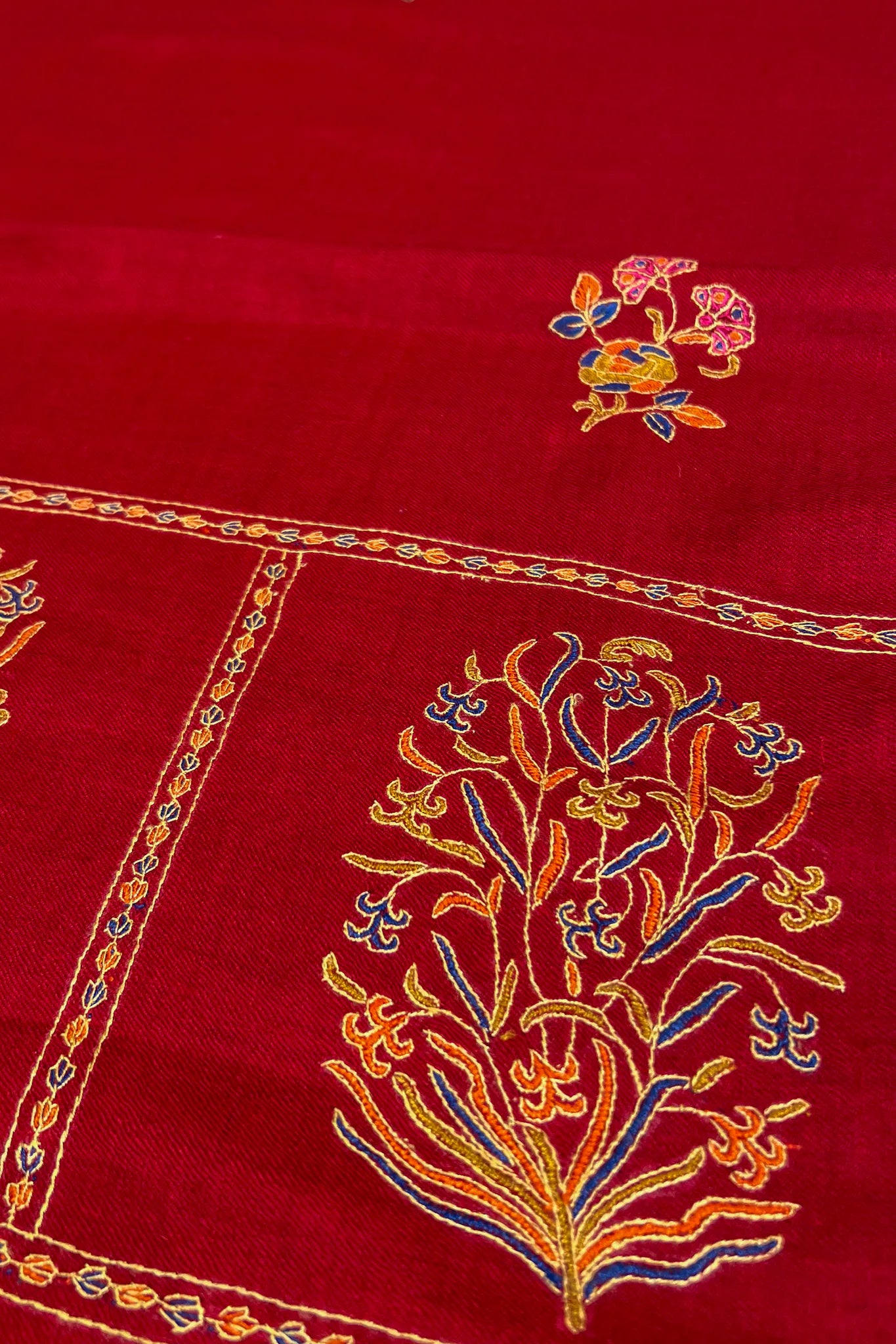 When worn, it feels comforting and composed. The tight weave gives the stole a reassuring presence, one that stays in place and holds warmth close. The embroidery feels thoughtfully spaced, allowing the red base to breathe while still feeling celebratory. It carries the familiarity of something worn during gatherings that stretch late, when the air cools and the room grows quieter.