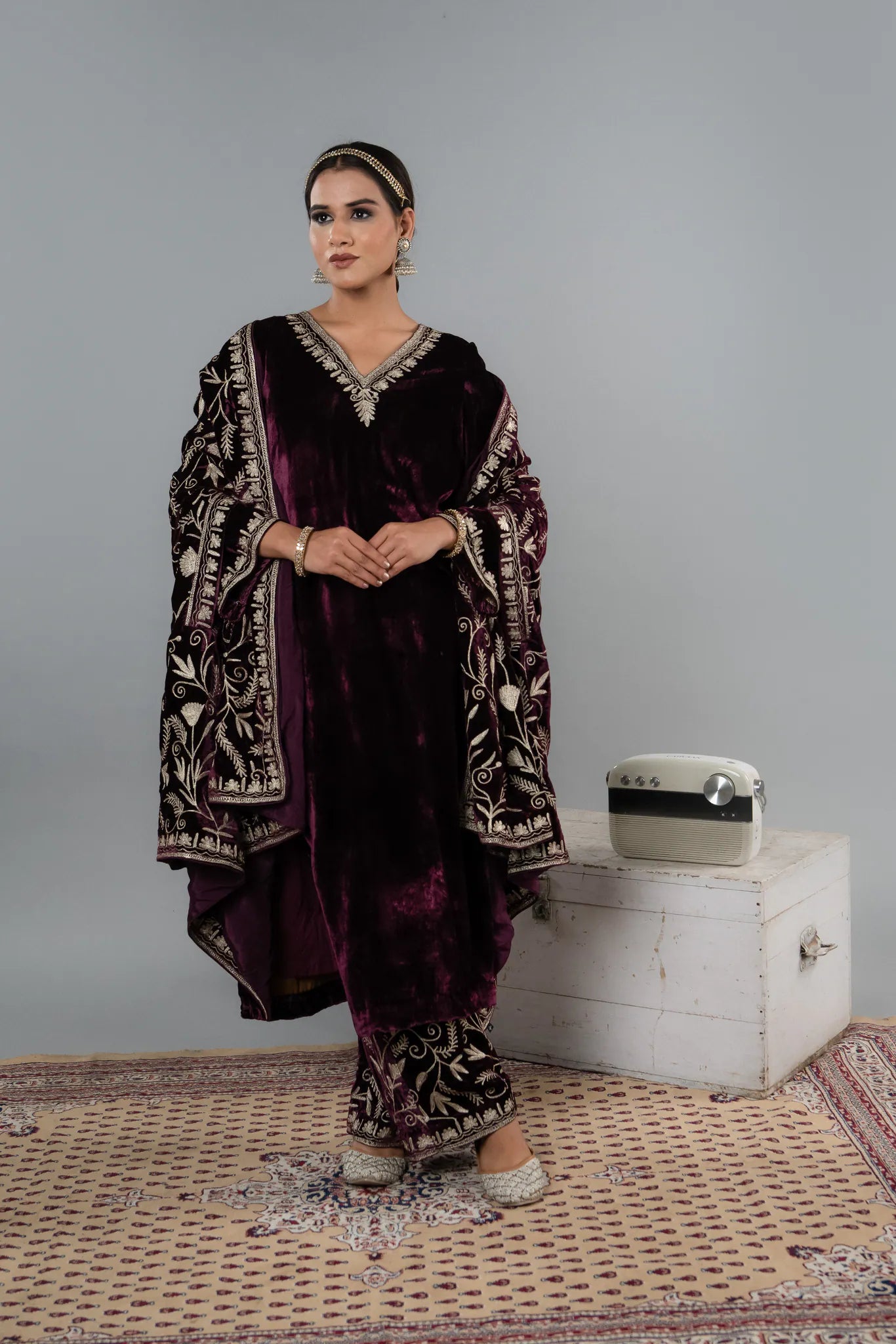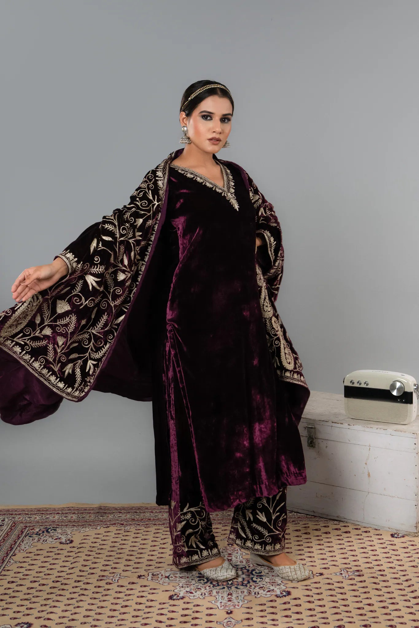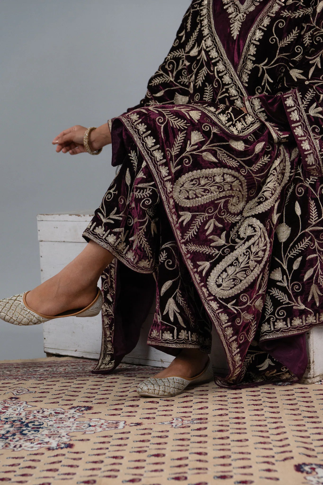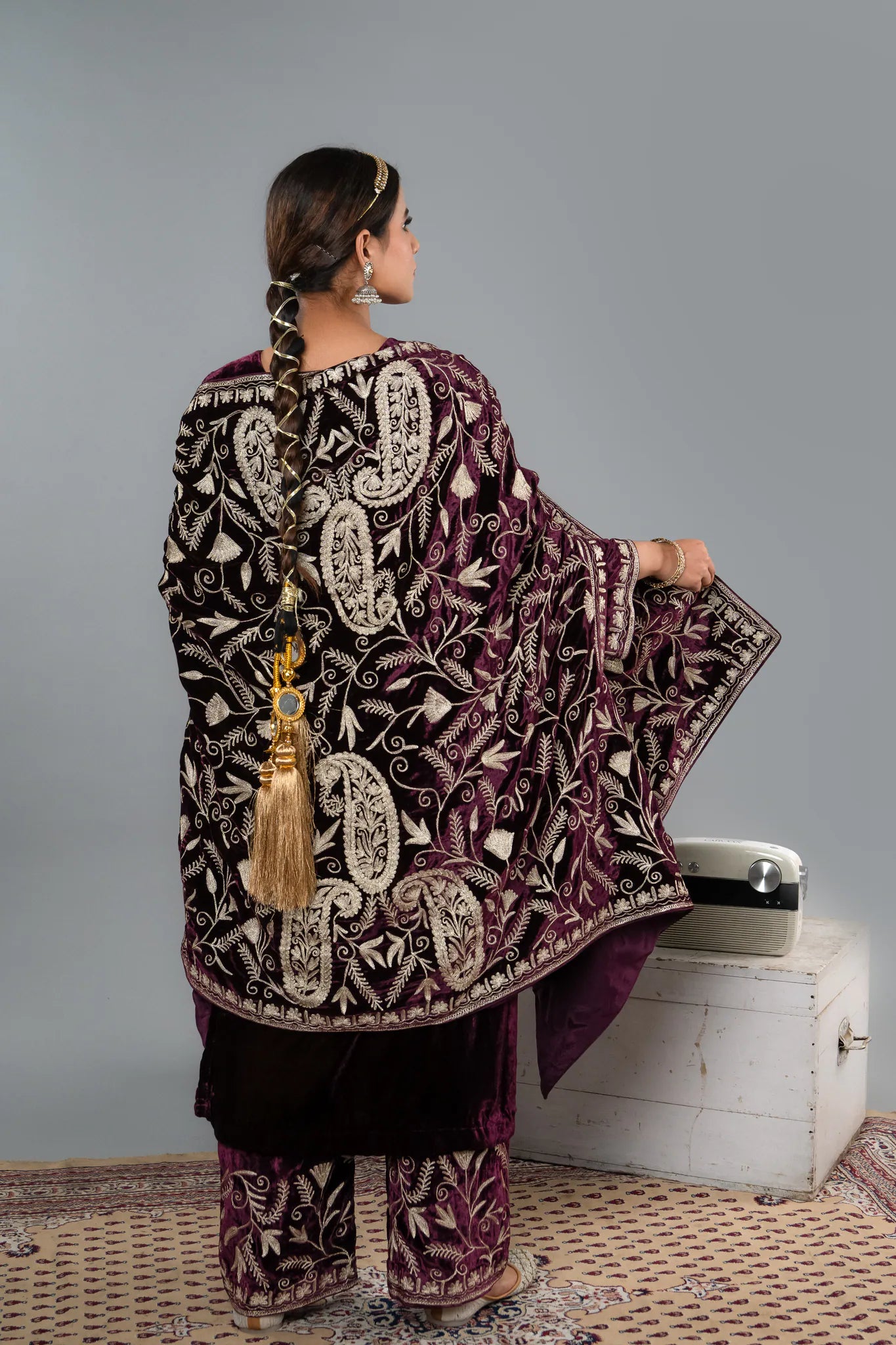 A royal masterpiece in sandy brown velvet, this Kashmiri suit features intricate Tilla embroidery that speaks of heritage and elegance. Perfect for festive and formal occasions, it blends traditional charm with regal sophistication.