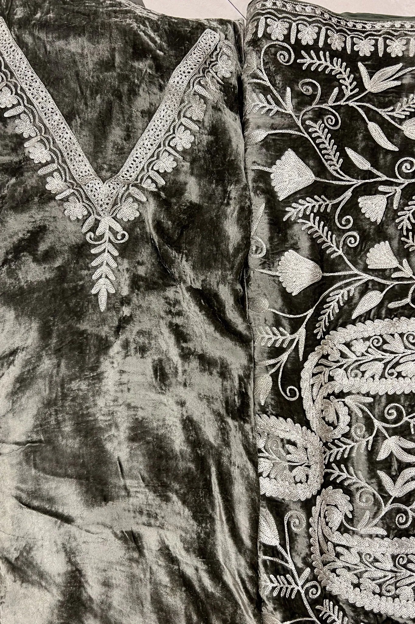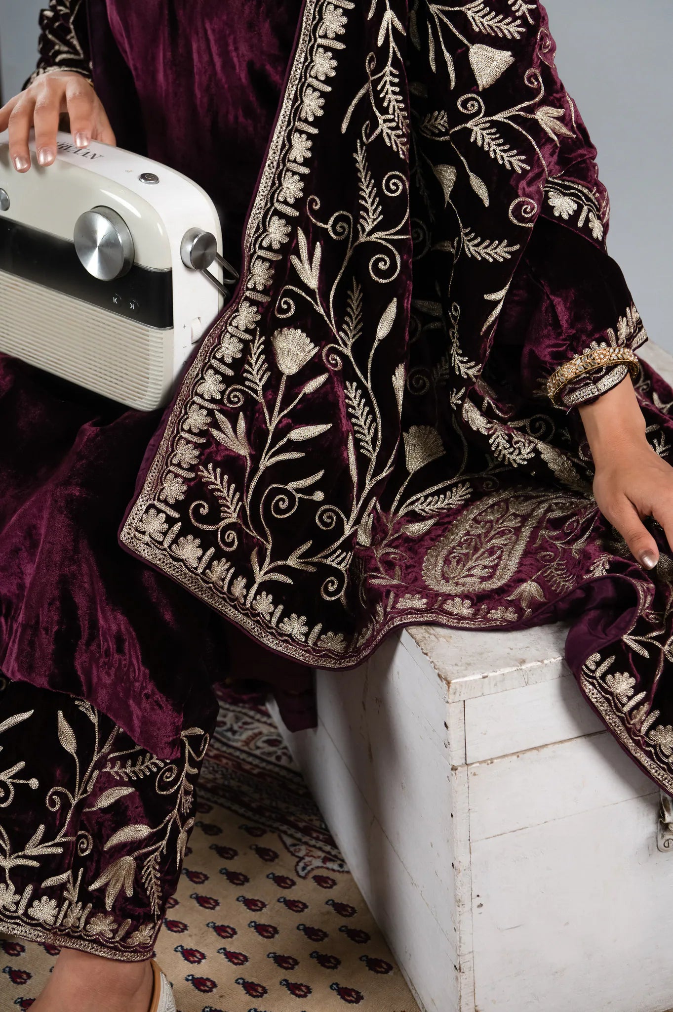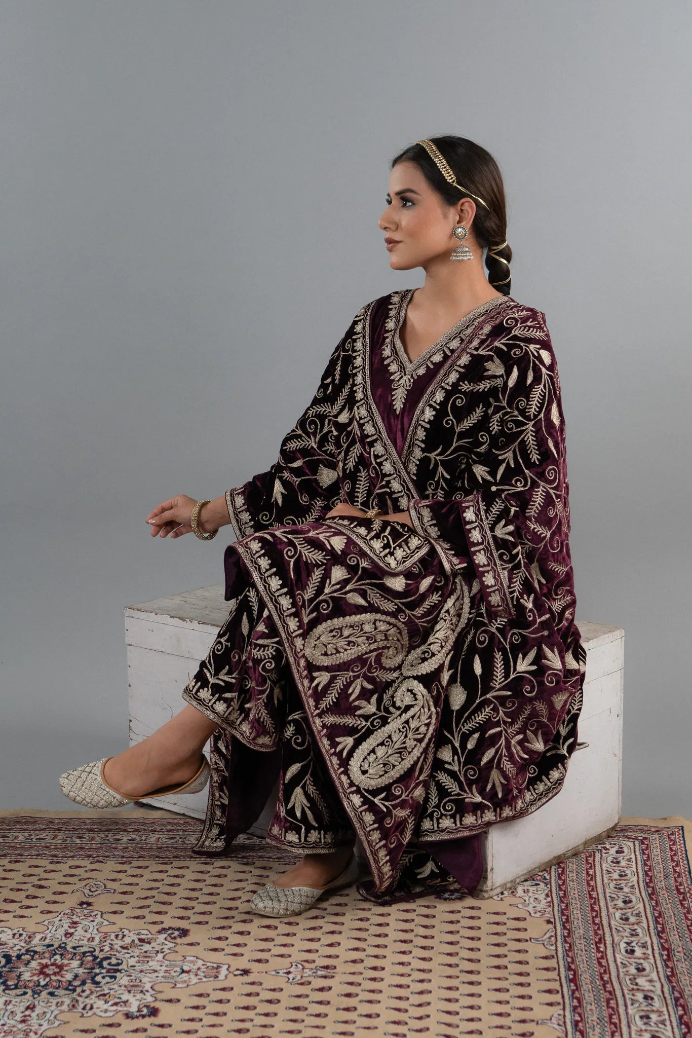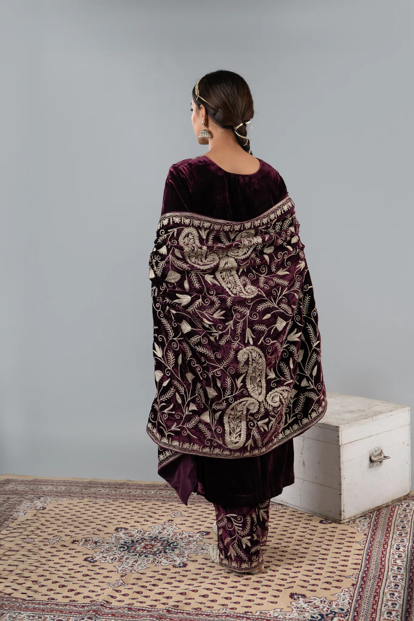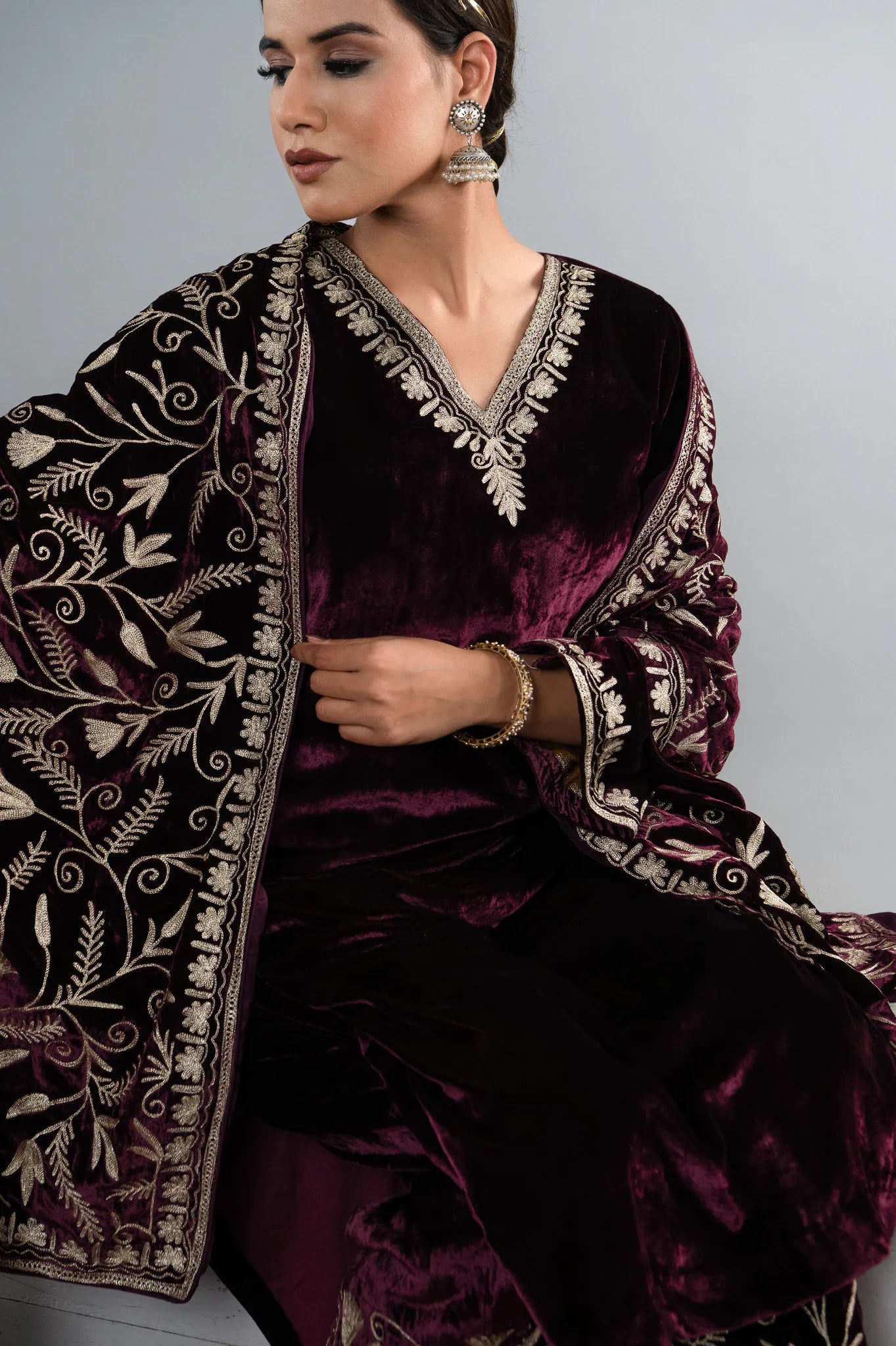 A royal masterpiece in sandy brown velvet, this Kashmiri suit features intricate Tilla embroidery that speaks of heritage and elegance. Perfect for festive and formal occasions, it blends traditional charm with regal sophistication.