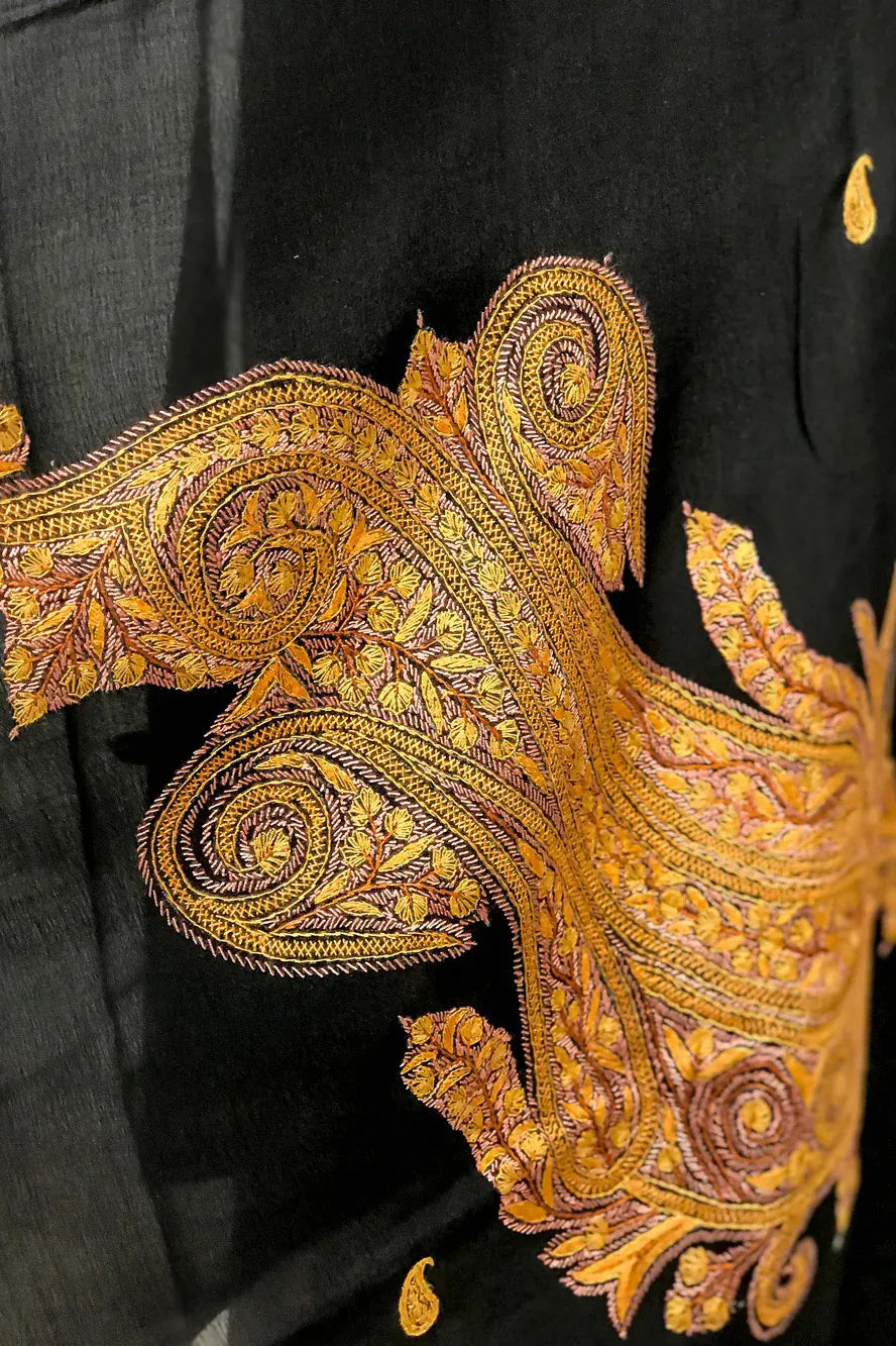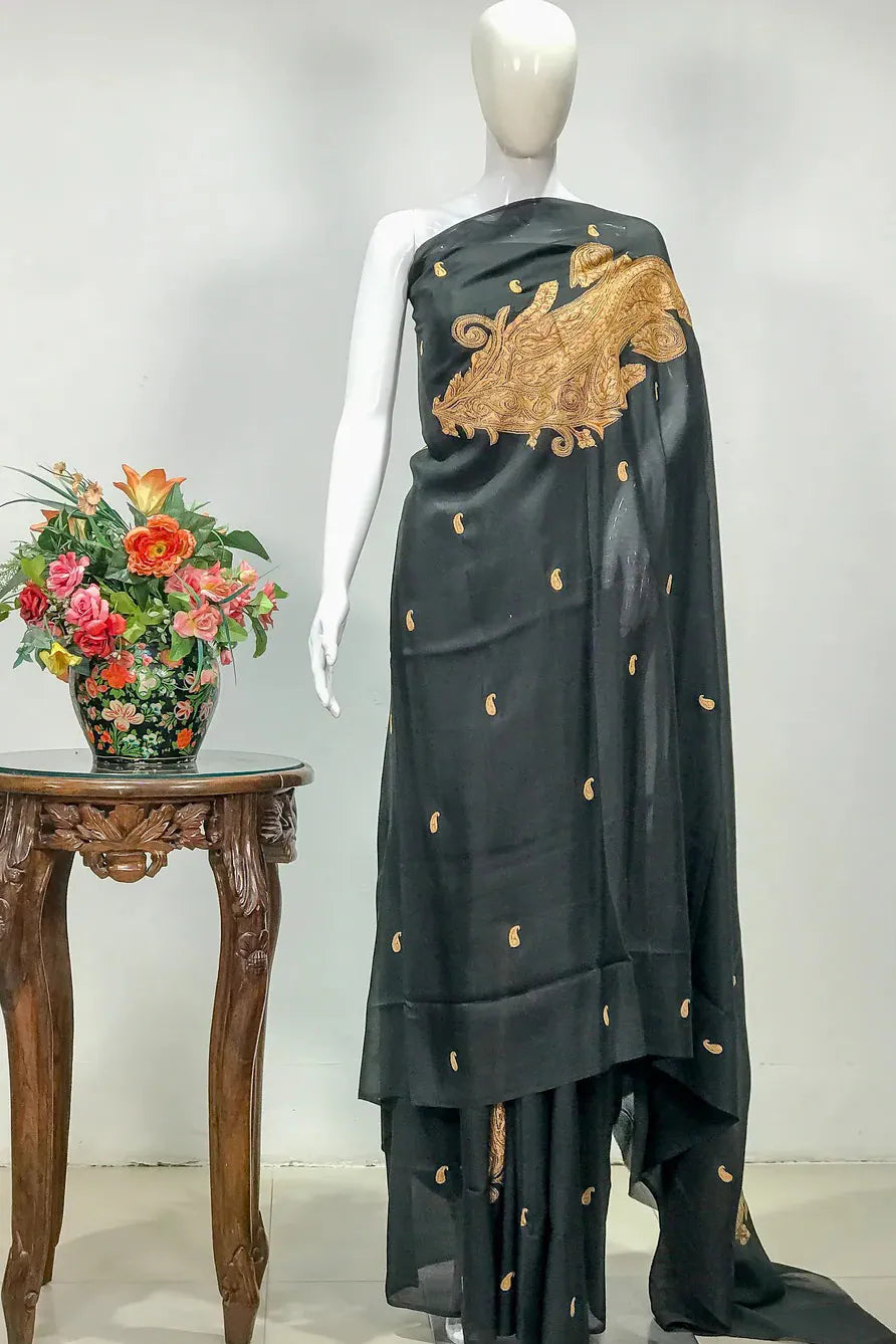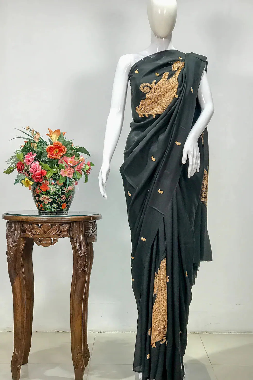 Wearing Zariq brings a sense of quiet confidence and refined power, allowing you to step into tradition with a modern, assured presence. Crafted in pure chinon, the saree drapes fluidly and feels light against the skin, offering comfort that lasts through long evenings and celebrations. Intricate sozni hand embroidery in warm yellow tones creates a striking contrast against the deep black base, reflecting the patience, skill, and soul of Kashmiri artisans. Designed to remain relevant across seasons, Zariq blends timeless artistry with contemporary elegance and is paired with a matching pure chinon blouse for a complete, polished look.