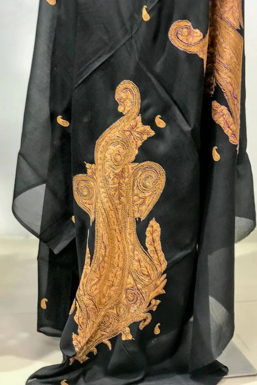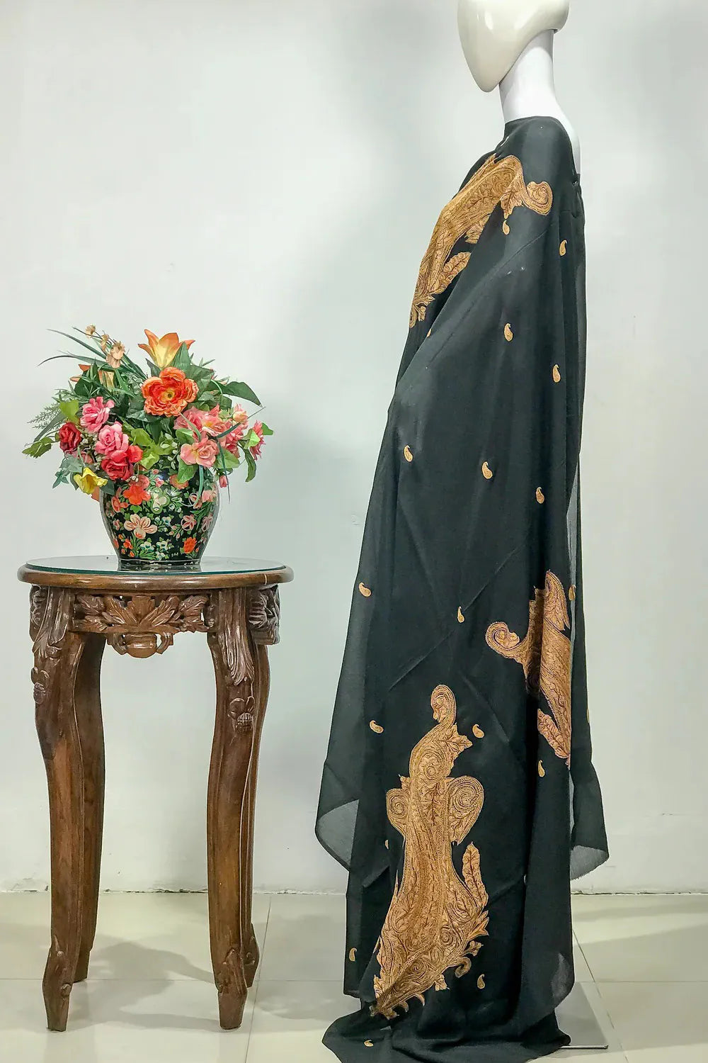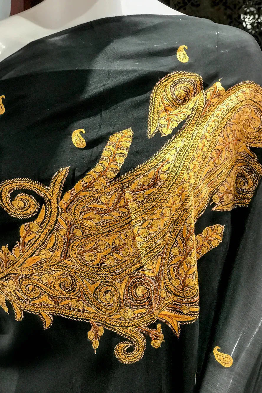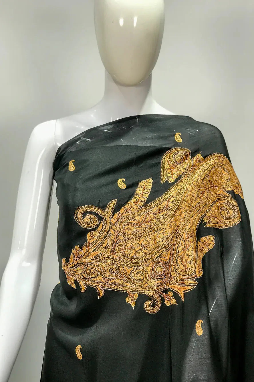 Wearing Zariq brings a sense of quiet confidence and refined power, allowing you to step into tradition with a modern, assured presence. Crafted in pure chinon, the saree drapes fluidly and feels light against the skin, offering comfort that lasts through long evenings and celebrations. Intricate sozni hand embroidery in warm yellow tones creates a striking contrast against the deep black base, reflecting the patience, skill, and soul of Kashmiri artisans. Designed to remain relevant across seasons, Zariq blends timeless artistry with contemporary elegance and is paired with a matching pure chinon blouse for a complete, polished look.