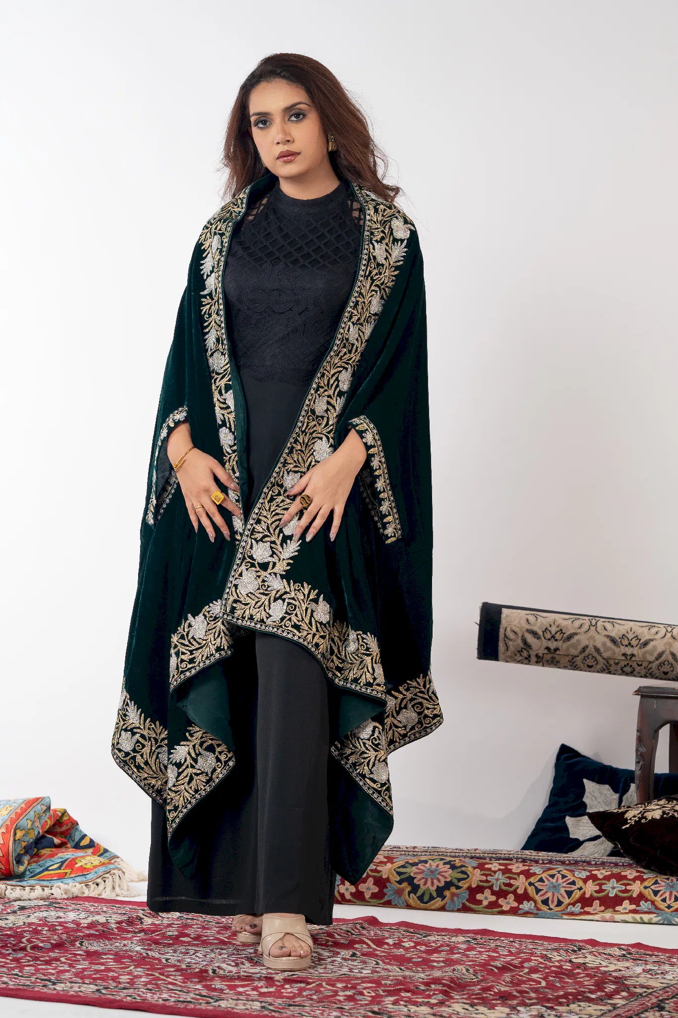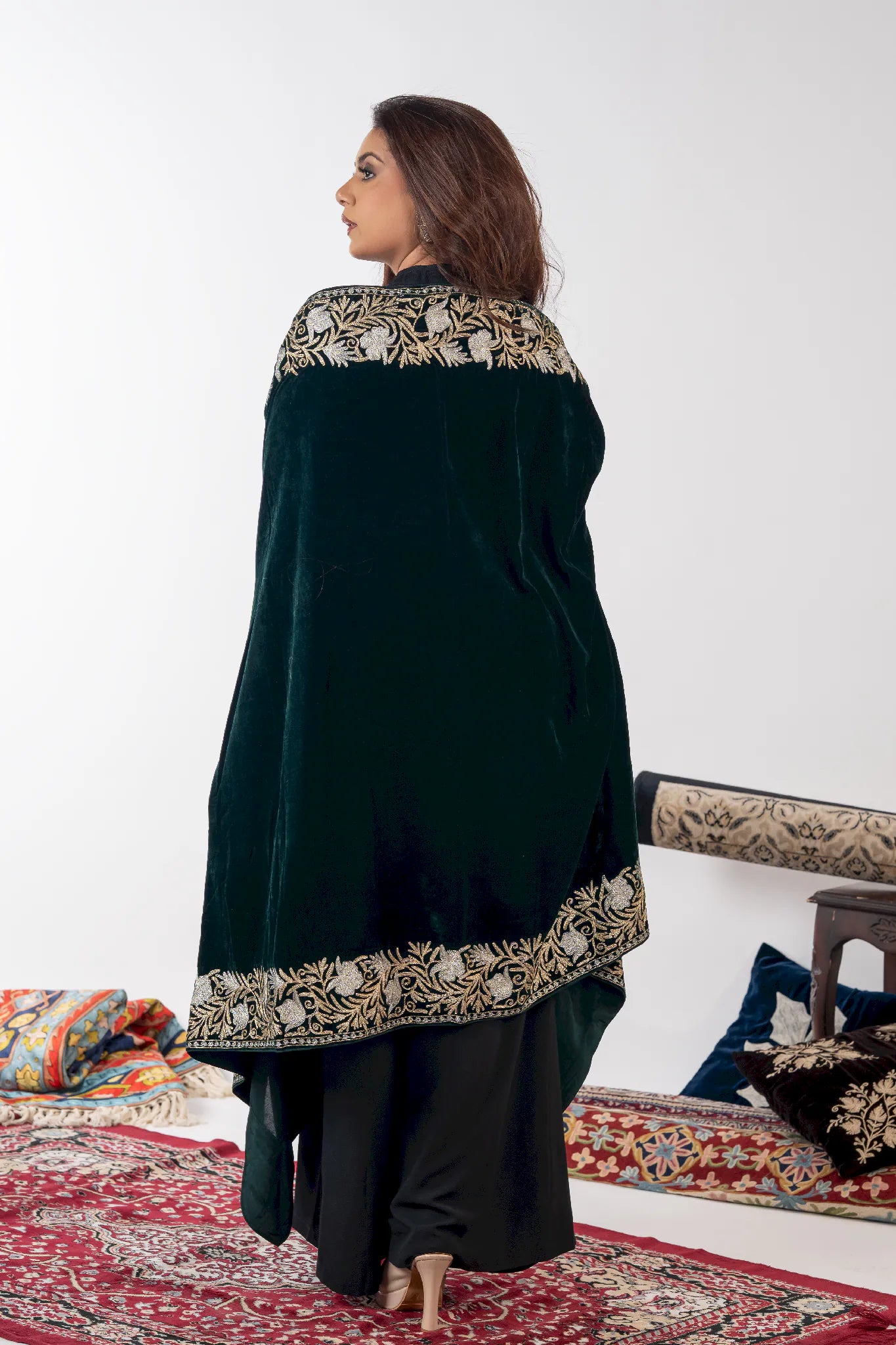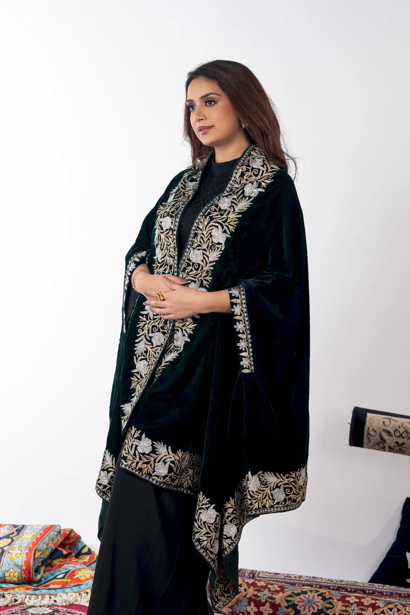 Wearing Zumar brings a sense of poised confidence and timeless elegance, grounding you in the quiet grandeur of Kashmiri heritage. Crafted in fine velvet, this cape shawl drapes fluidly with a soft, luxurious warmth that feels refined yet effortless. Intricate gold and silver Tilla embroidery unfolds across a bottle green base, celebrating meticulous craftsmanship and enduring artistry. Designed to transcend seasons and occasions, Zumar offers versatile styling through its generous 88 by 38 inch silhouette, making it a statement piece that remains relevant year after year.