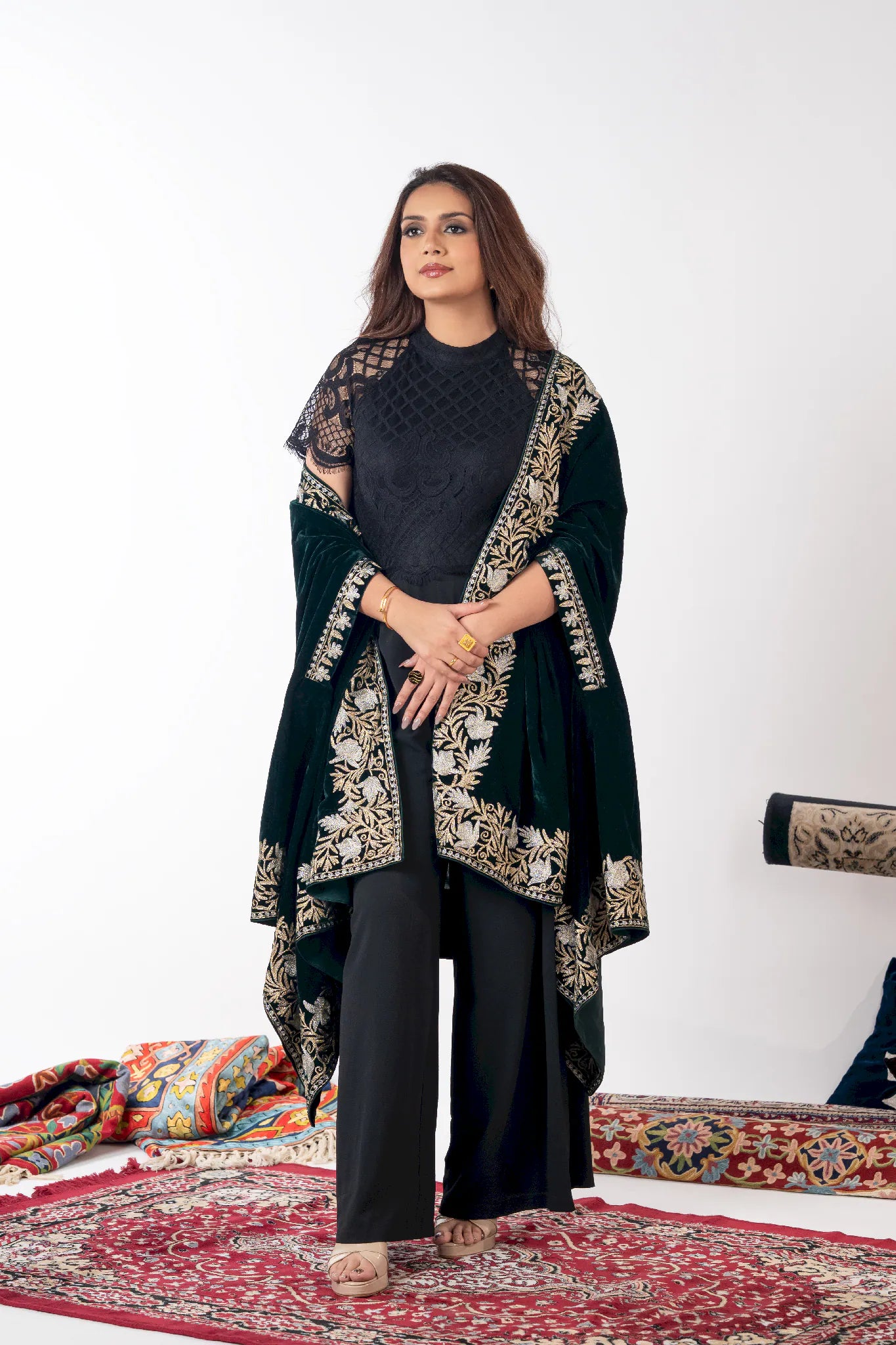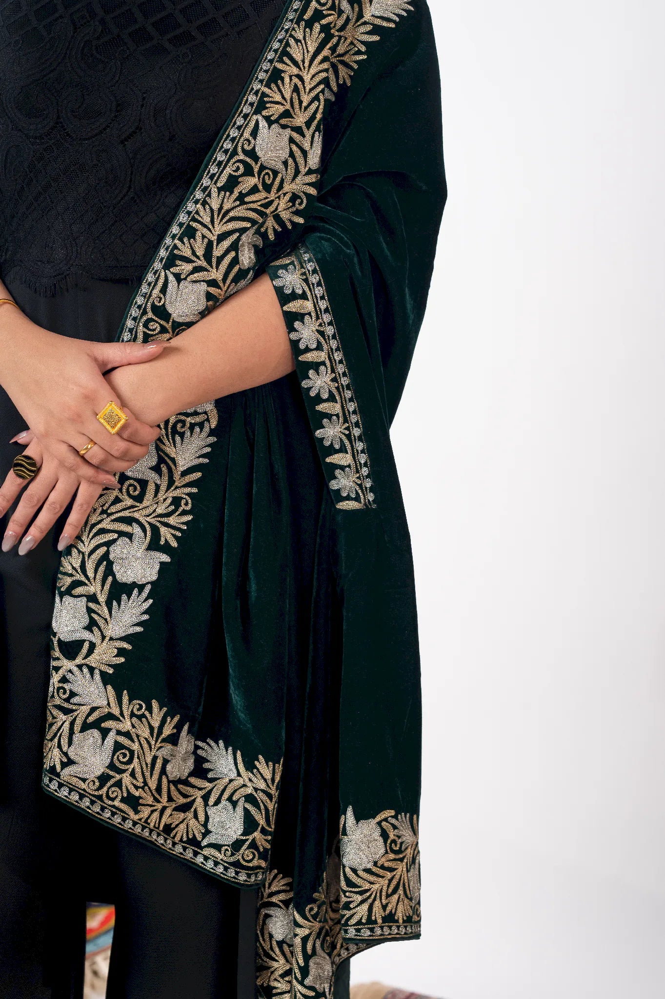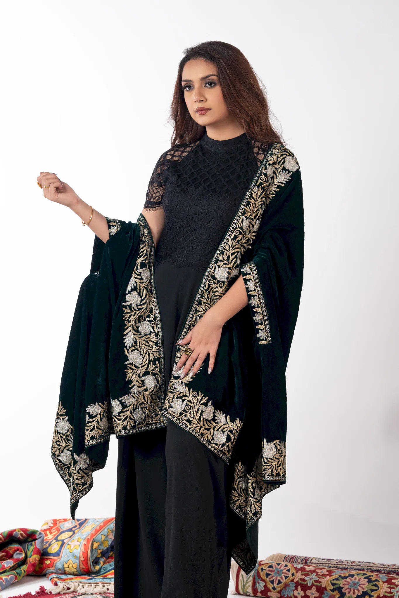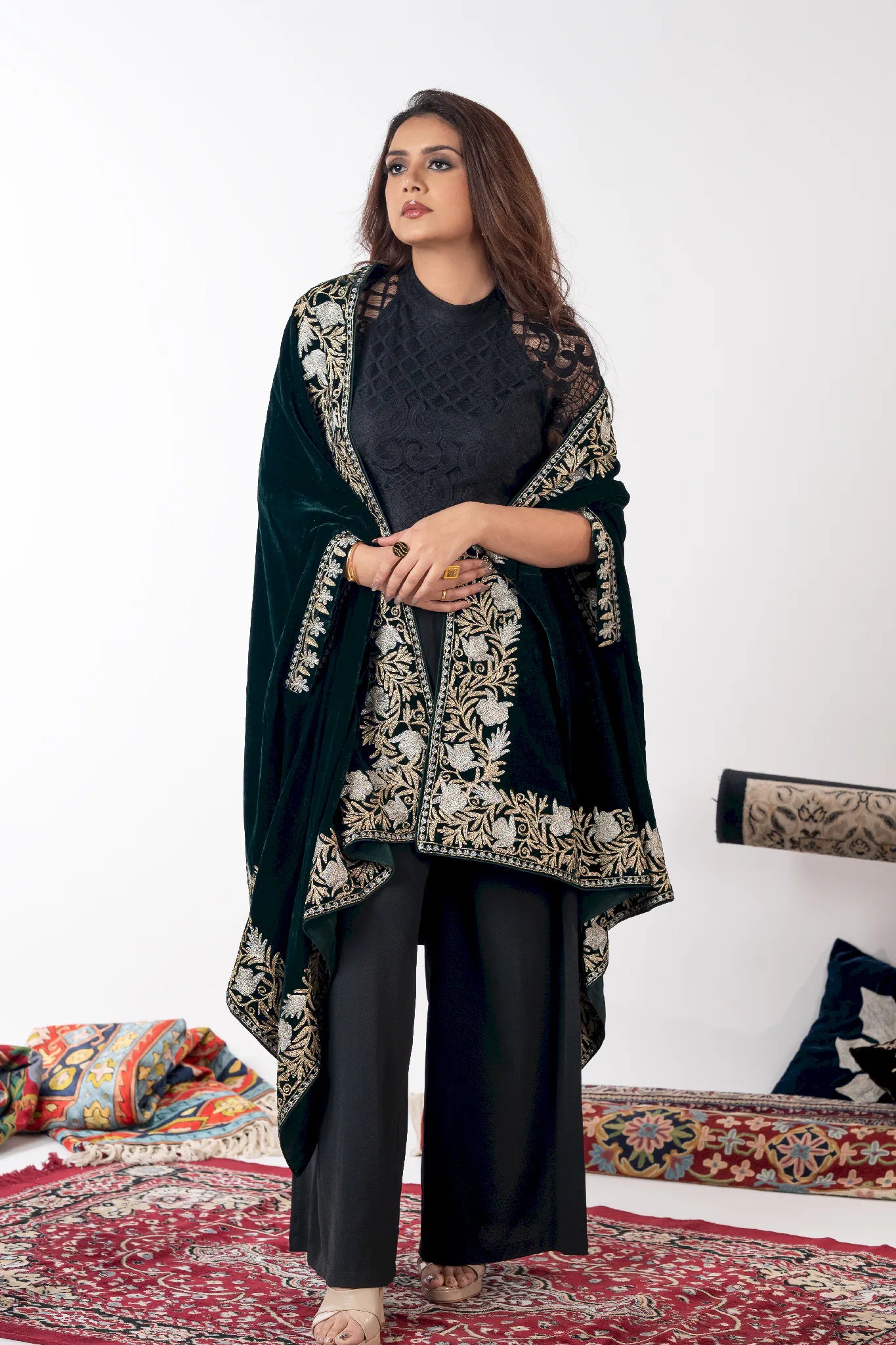 Wearing Zumar brings a sense of poised confidence and timeless elegance, grounding you in the quiet grandeur of Kashmiri heritage. Crafted in fine velvet, this cape shawl drapes fluidly with a soft, luxurious warmth that feels refined yet effortless. Intricate gold and silver Tilla embroidery unfolds across a bottle green base, celebrating meticulous craftsmanship and enduring artistry. Designed to transcend seasons and occasions, Zumar offers versatile styling through its generous 88 by 38 inch silhouette, making it a statement piece that remains relevant year after year.