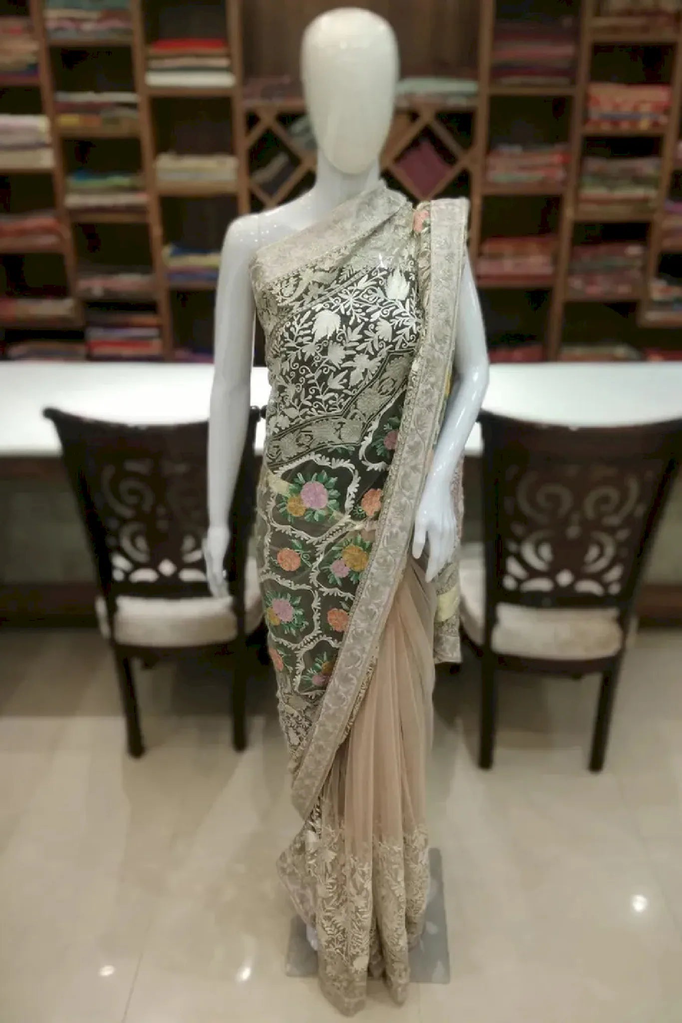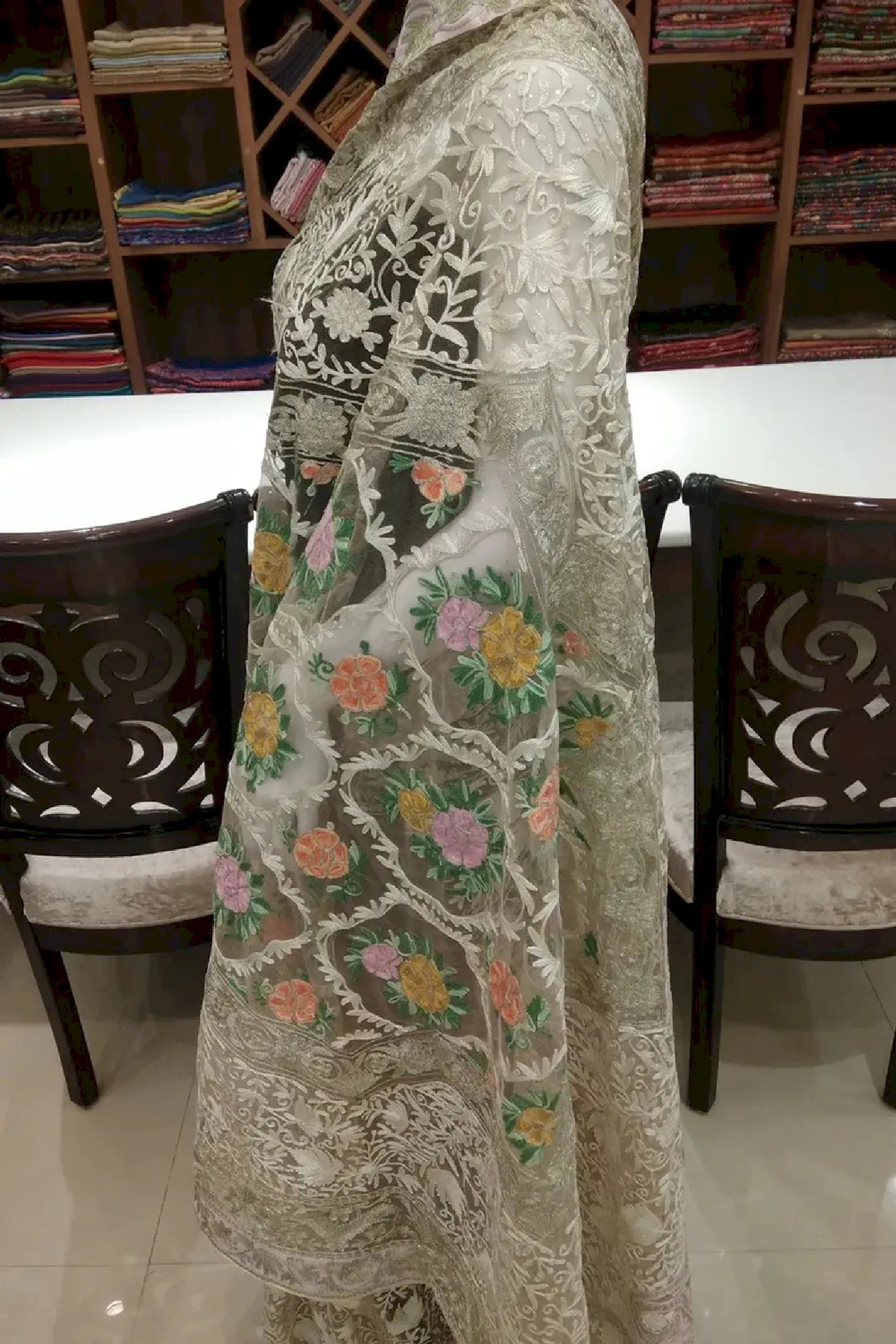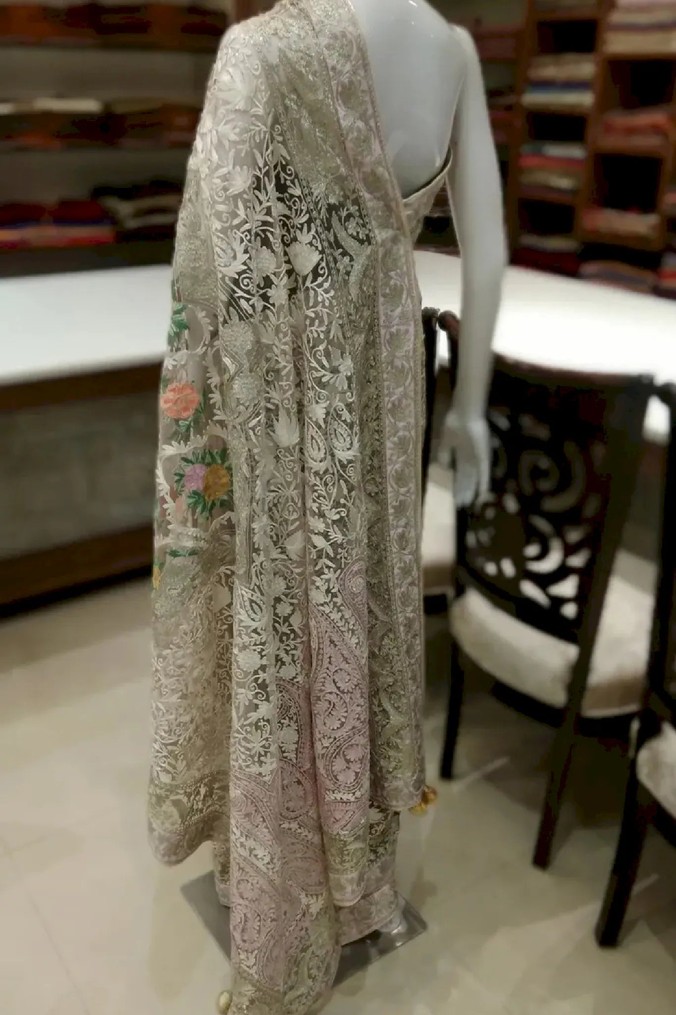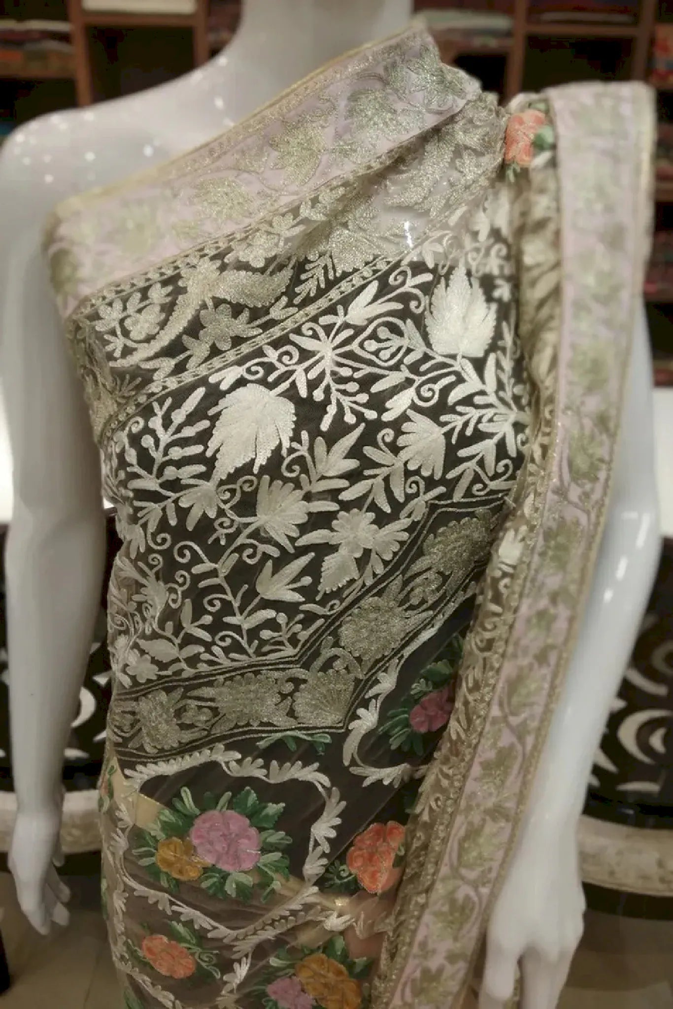 Wearing Zunair brings a sense of calm confidence, where elegance feels natural and deeply rooted. The soft net drape moves effortlessly, offering comfort while allowing Kashmiri aari and tilla fusion embroidery to unfold in intricate harmony across beige tone. Each motif reflects patient artistry and cultural continuity, crafted by skilled artisan to create a sari that feels timeless yet relevant. Designed for refined celebrations, Zunair balances visual richness with versatility, making it a piece to return to across seasons.