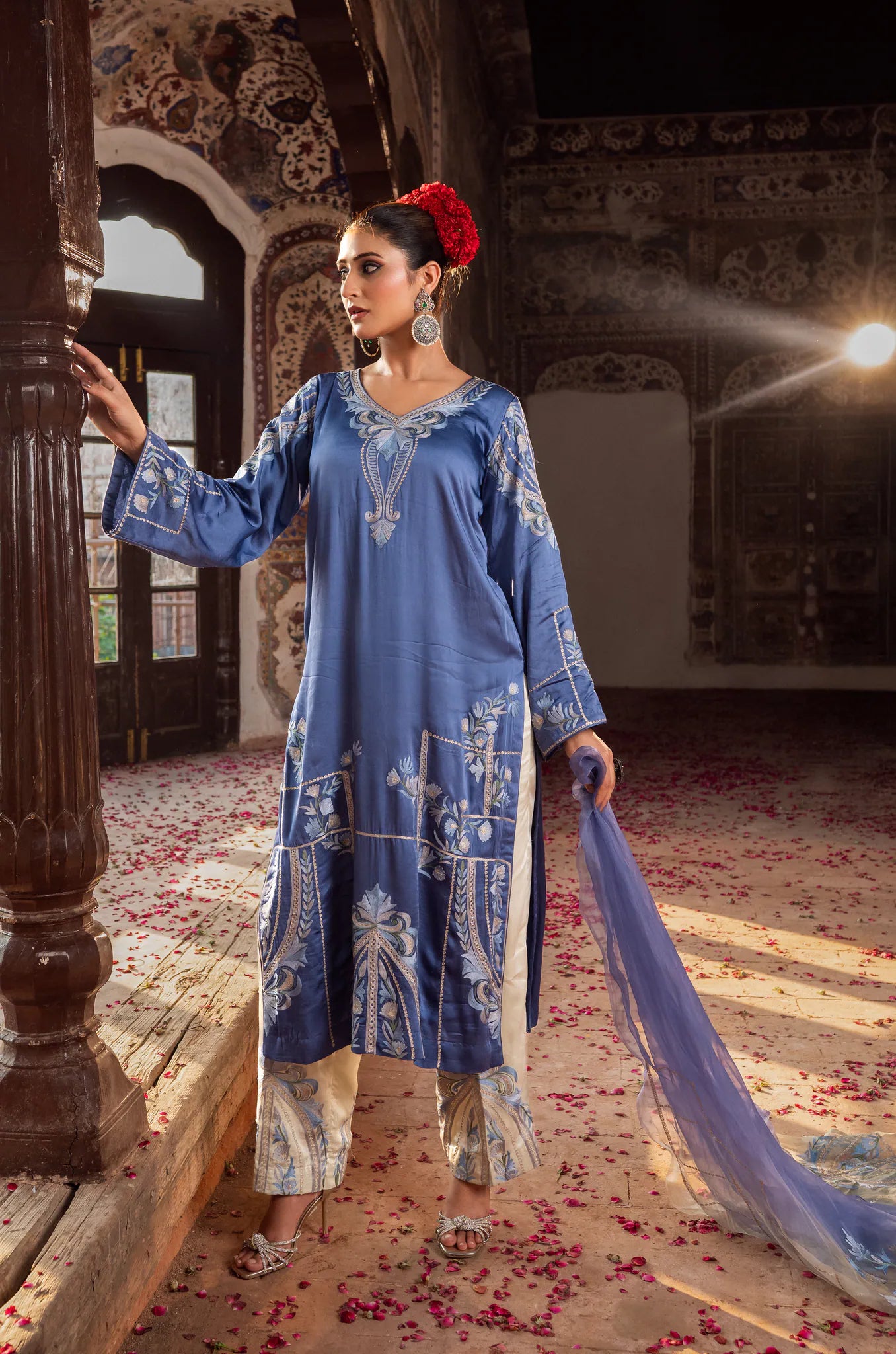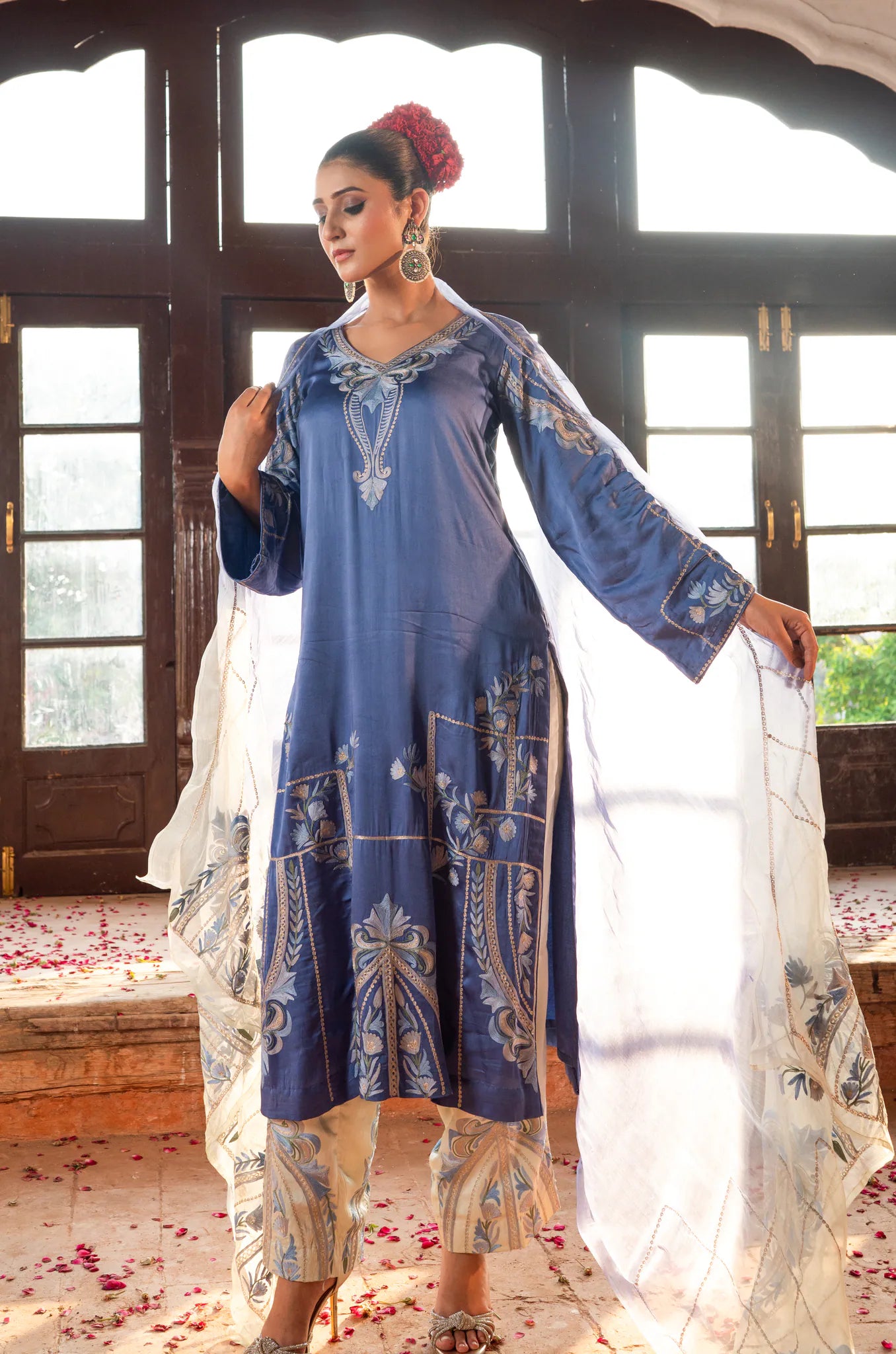 Design Features: This Cotton Satin Shirt Pant set evokes poise with its sophisticated sky blue hue, elevated by exquisite thread & tilla embroidery. The serene canvas is elegantly paired with a pure Organza dupatta that showcases delicately worked floral patterns.