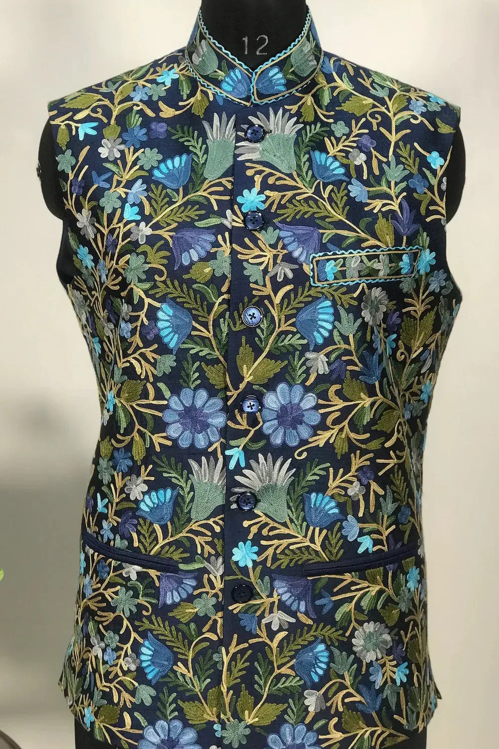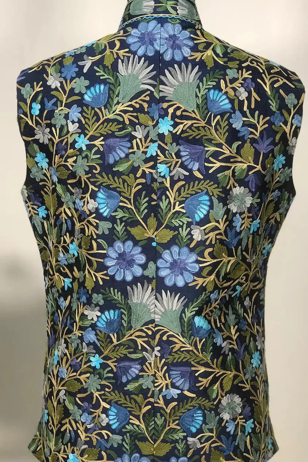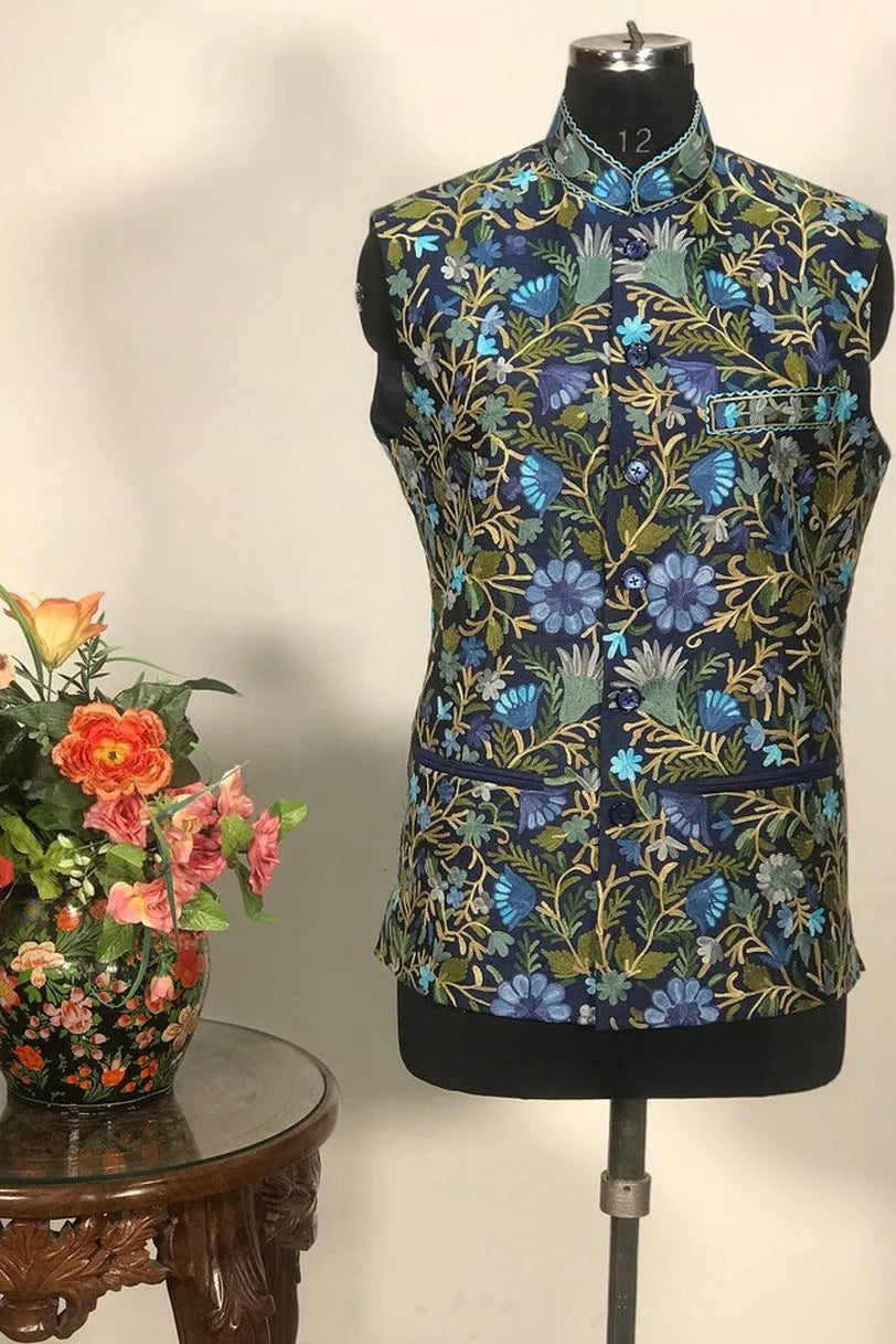 Navy blue viscose raw silk worked entirely in multicolour Kashmiri aari — florals that bloom across the chest, collar, and back in blues, greens, and golds. The kind of jacket that announces you know what formal dressing means.