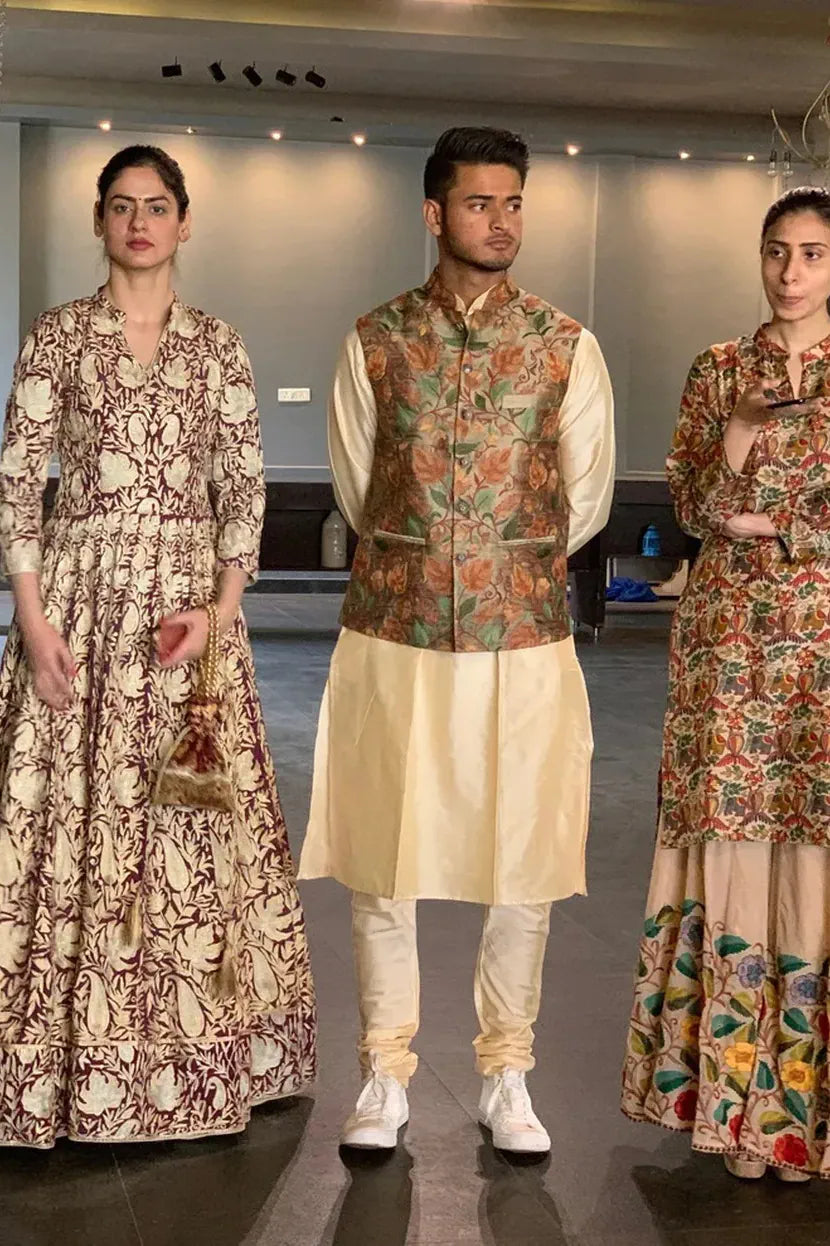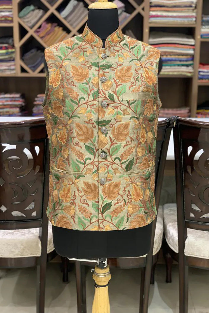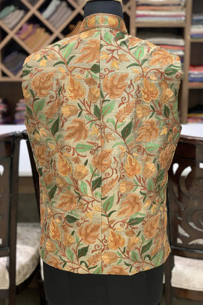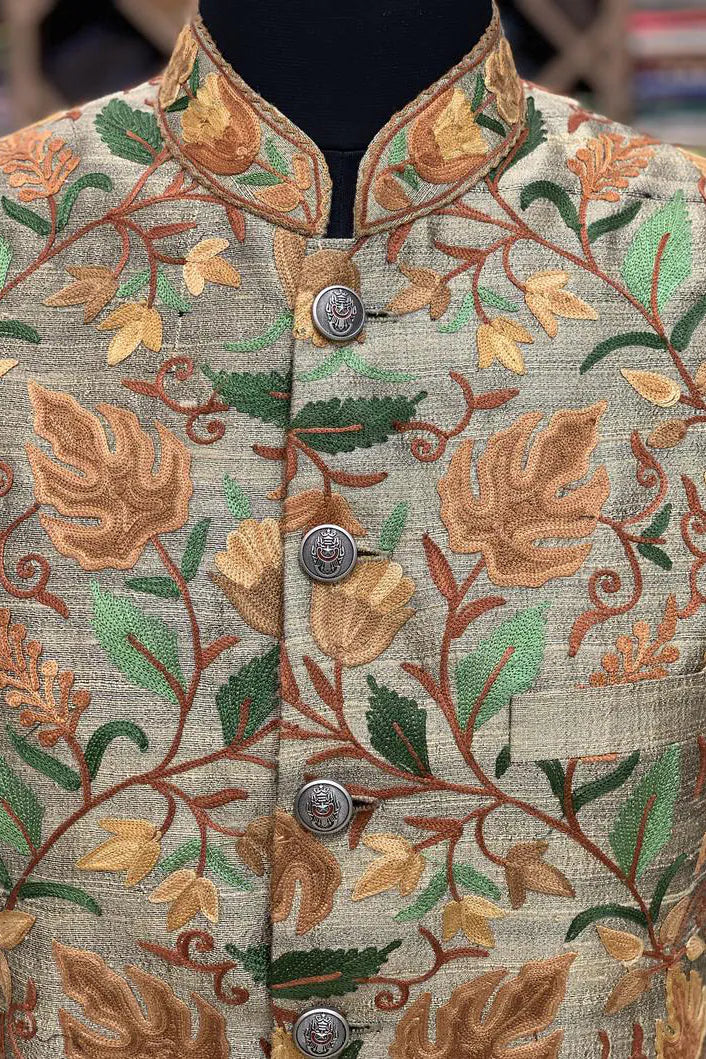 Worked entirely in multi-colour Kashmiri aari on beige viscose raw silk, this jacket layers over formal kurtas the way heirloom pieces do — with weight, presence, and the kind of embroidery that people recognise from across the room.