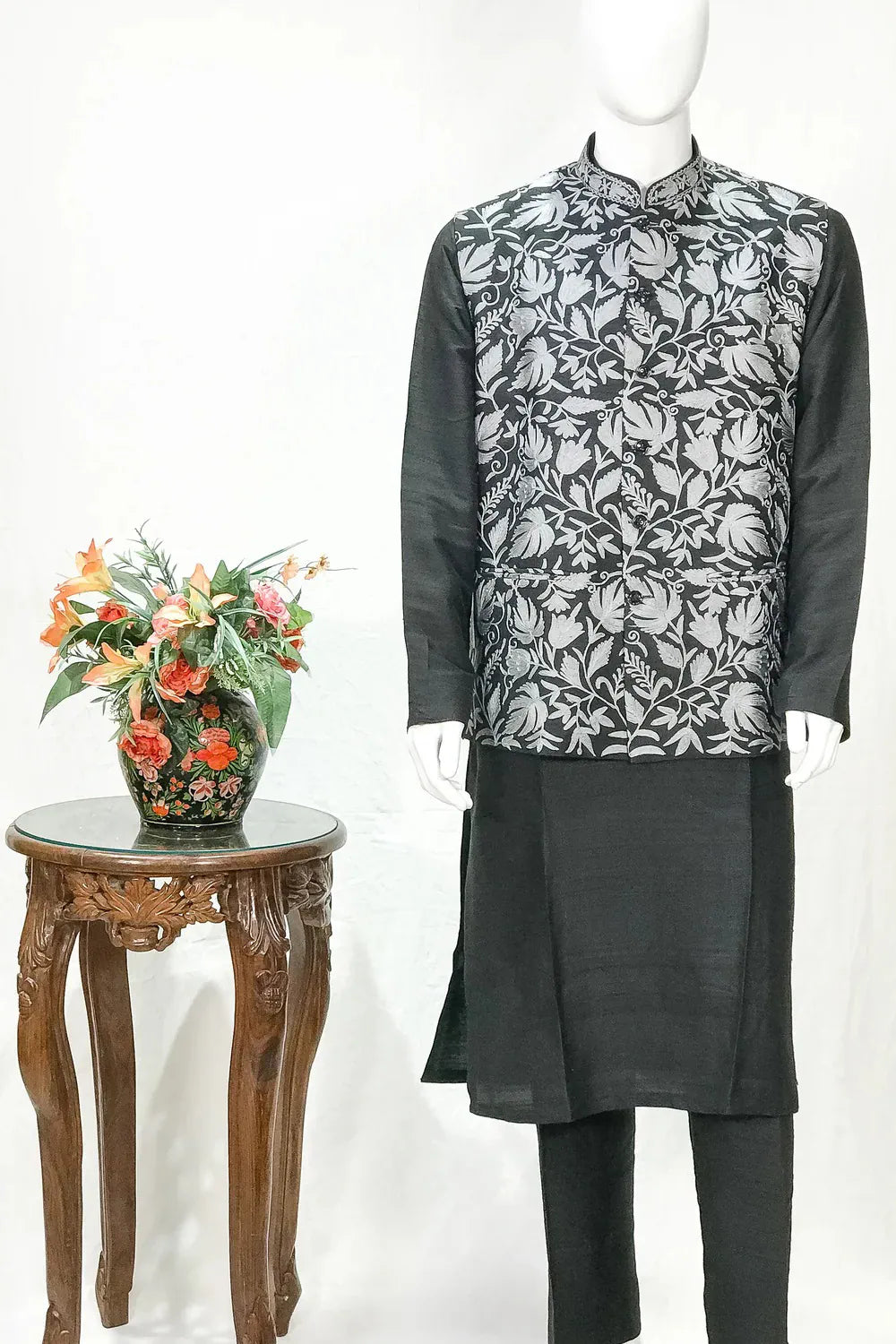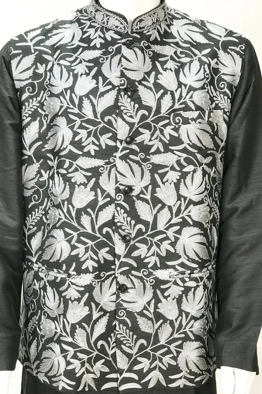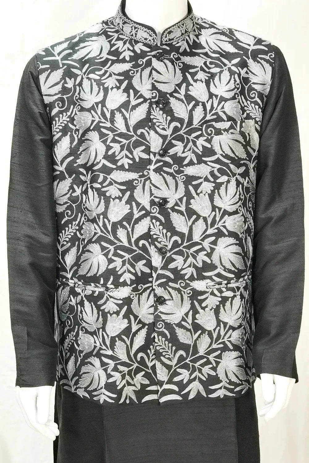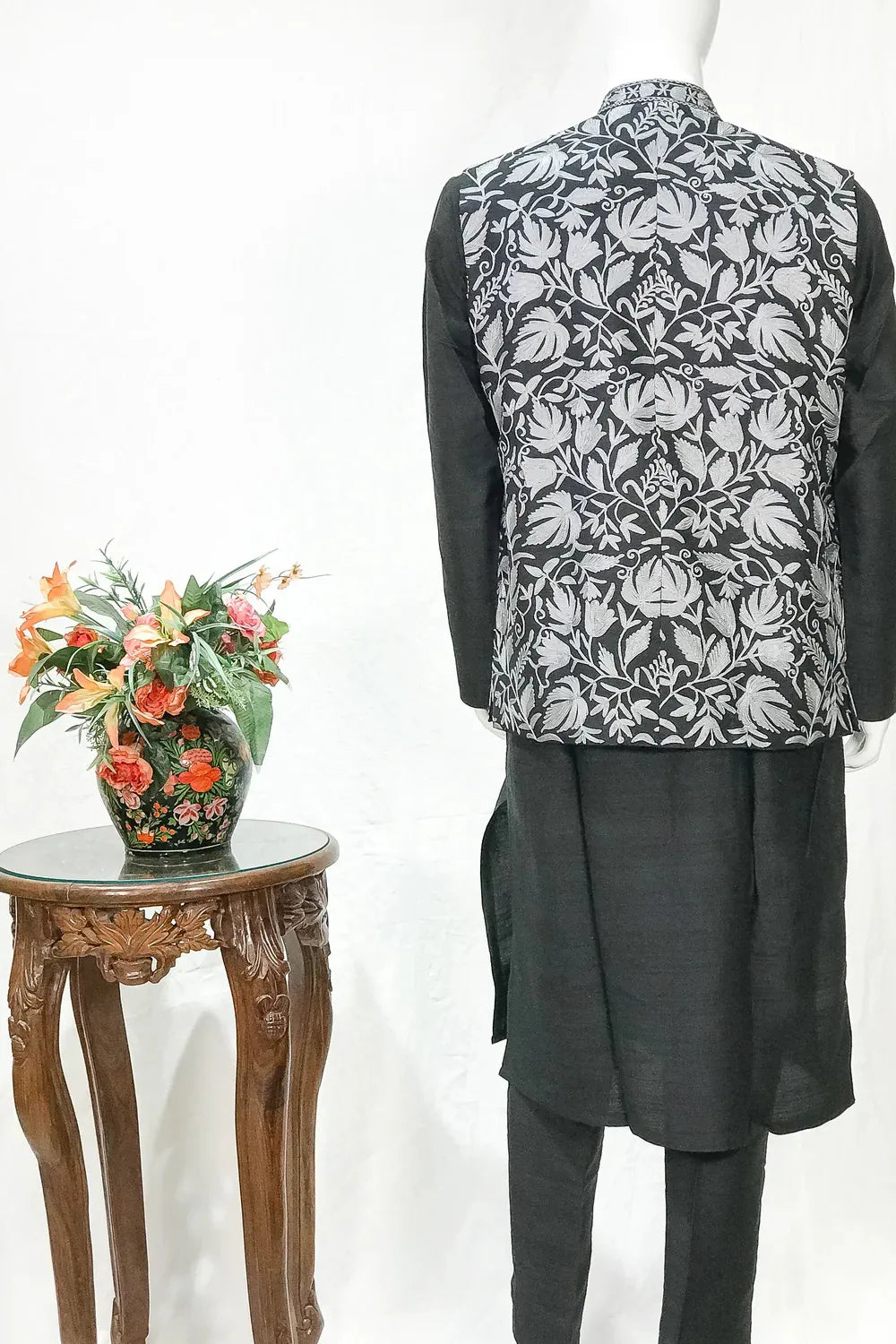 A black pure raw silk Nehru jacket with dense grey aari worked in an all-over chinar and floral jaal — the embroidery runs front to back without pause, giving the jacket an almost woven weight. At 27 inches, the length sits exactly where it should for a kurta pairing.