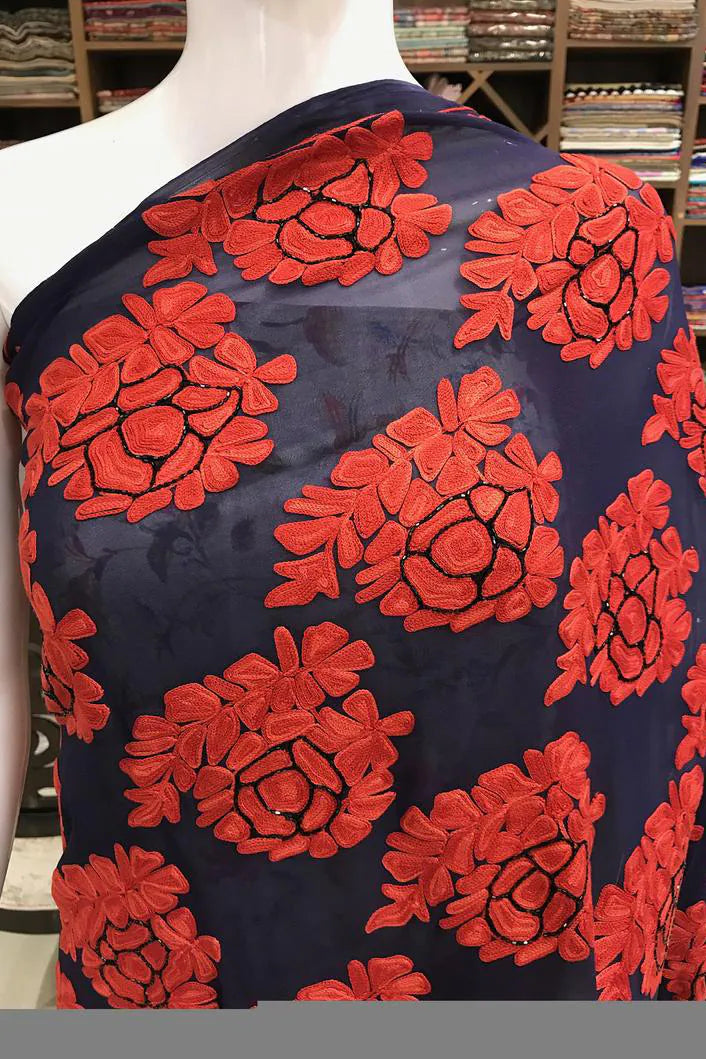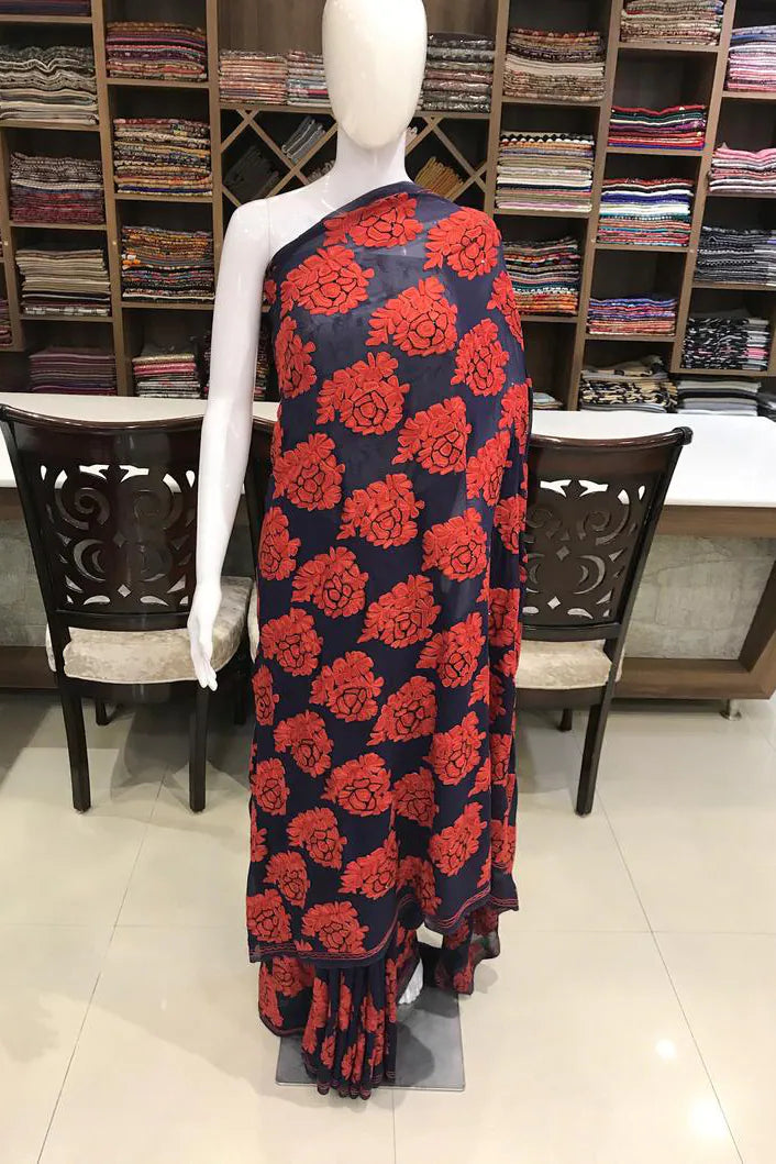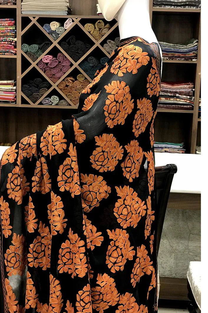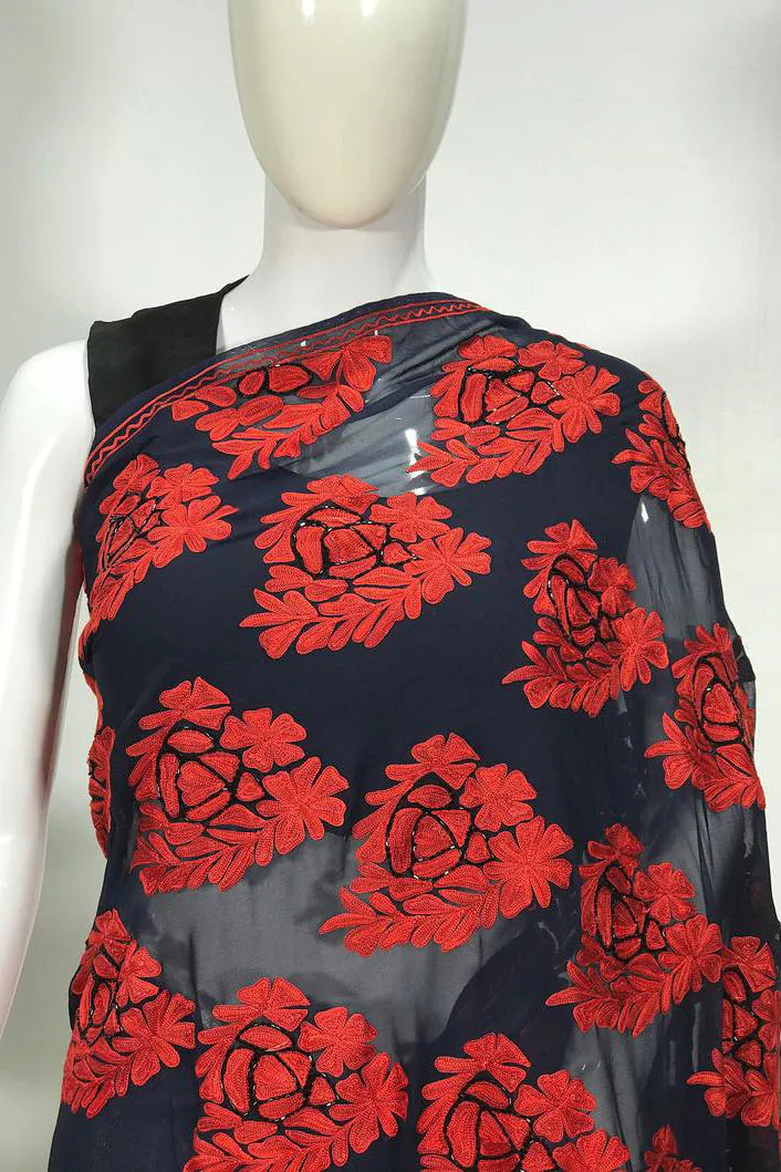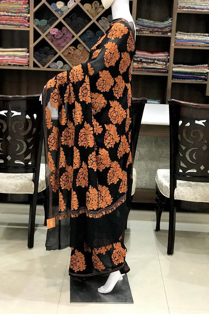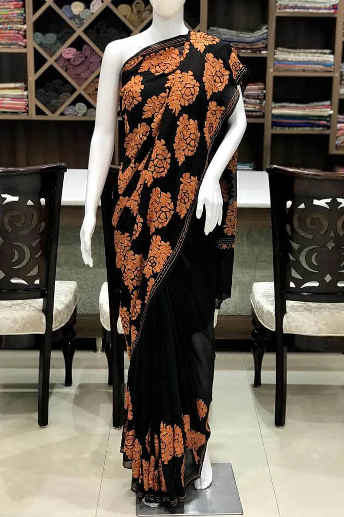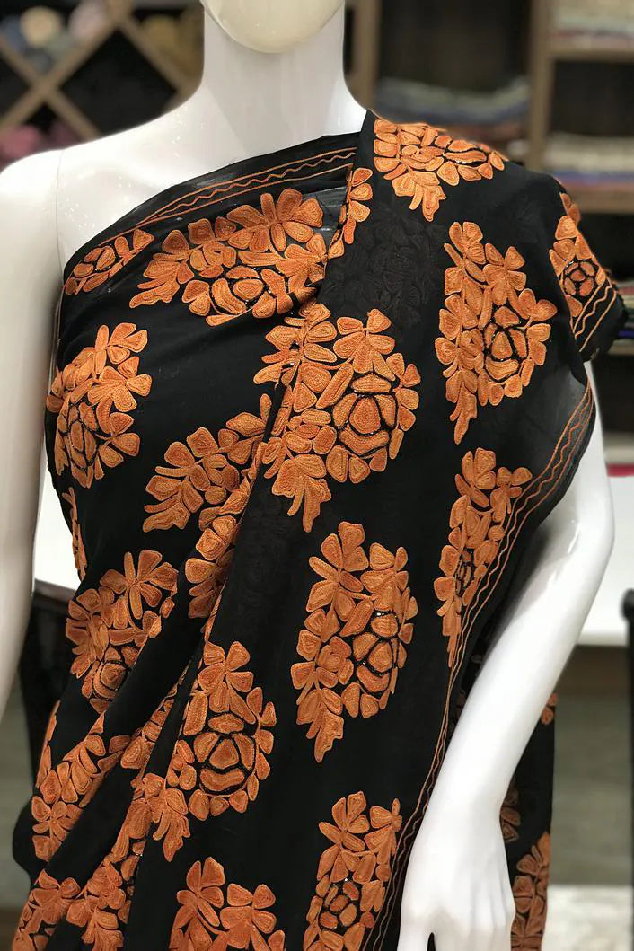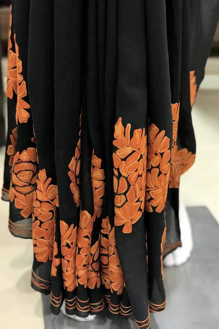 Arohi embodies strength, rhythm, and cultural pride, designed for moments that demand presence. All over Kashmiri aari embroidery flows across a deep toned base, crafted patiently by skilled artisans. The viscose georgette fabric offers a fluid yet structured drape, ensuring comfort without compromising form. Rich in detail and timeless in appeal, Arohi is ideal for evening celebrations and formal gatherings. Finished with an Indian crepe blouse, it stands as a bold yet graceful heirloom piece.