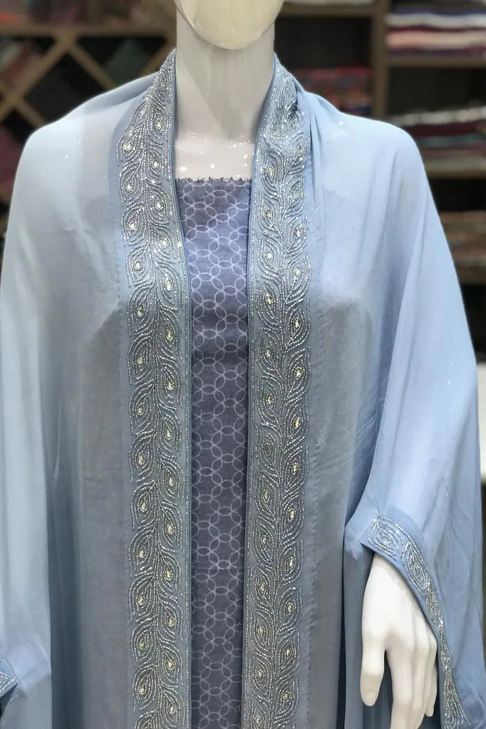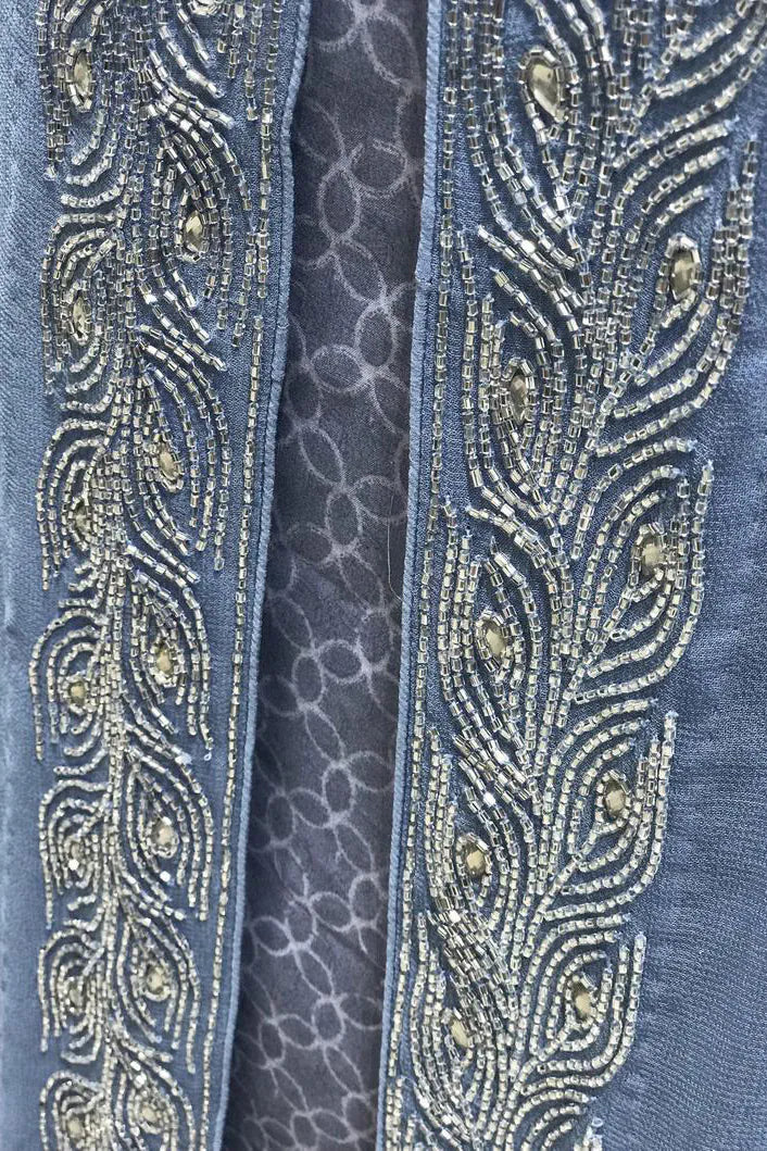 Worn, the cape moves with a calm certainty. The silver kardana work traces the edges with restraint, catching light only when the body shifts. It feels composed and intentional, something chosen for its ease rather than its statement. There is comfort in its openness, and clarity in the way it frames the silhouette without defining it too closely.