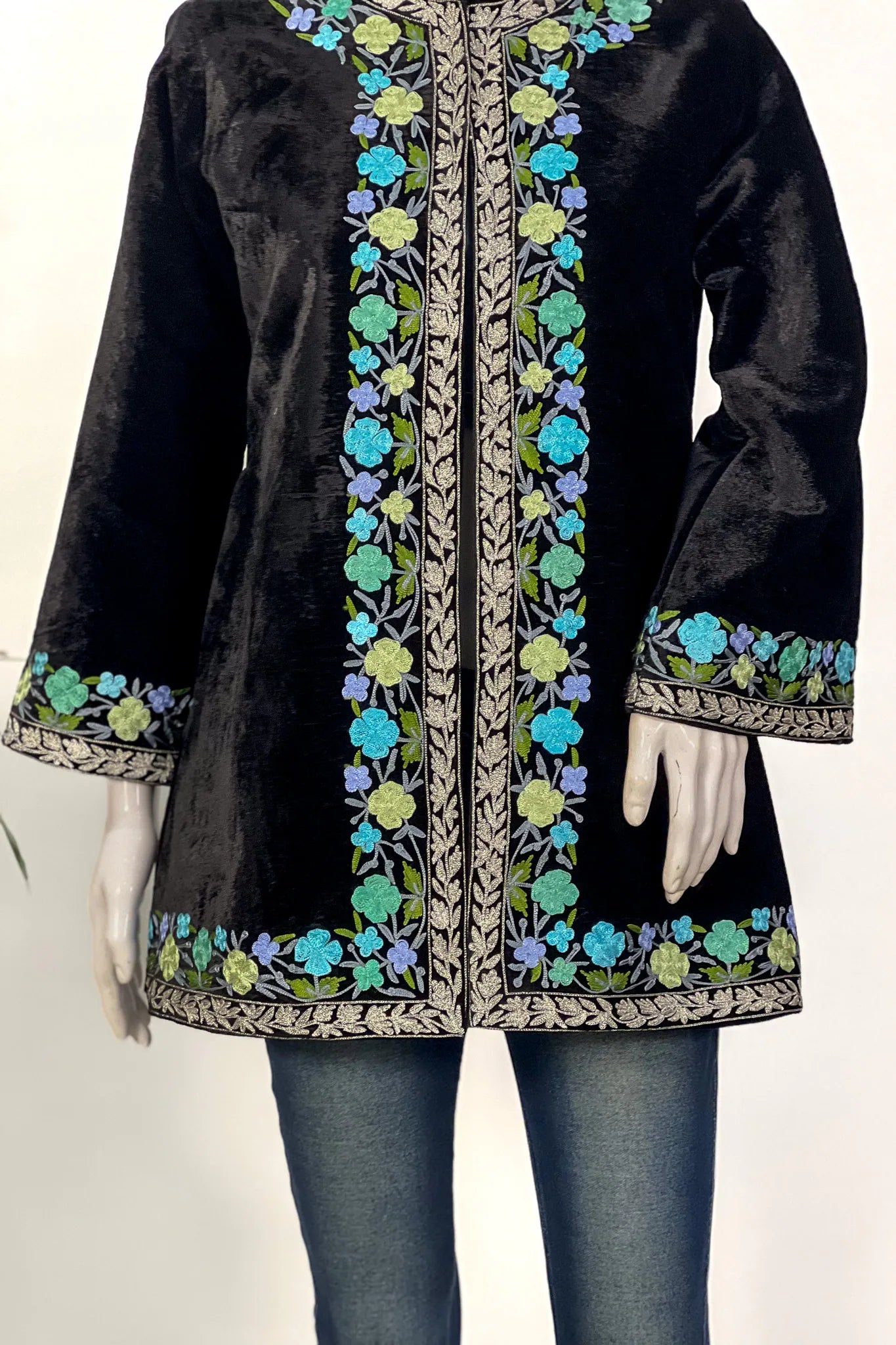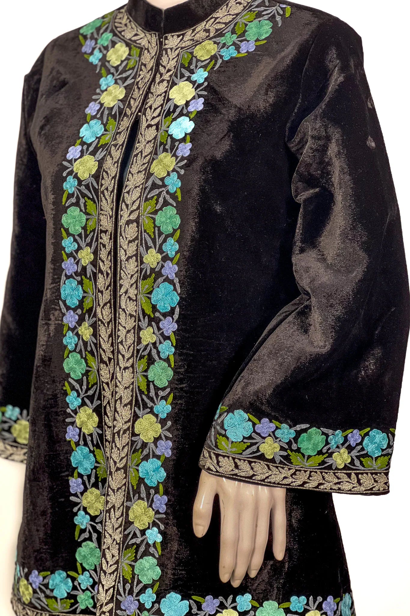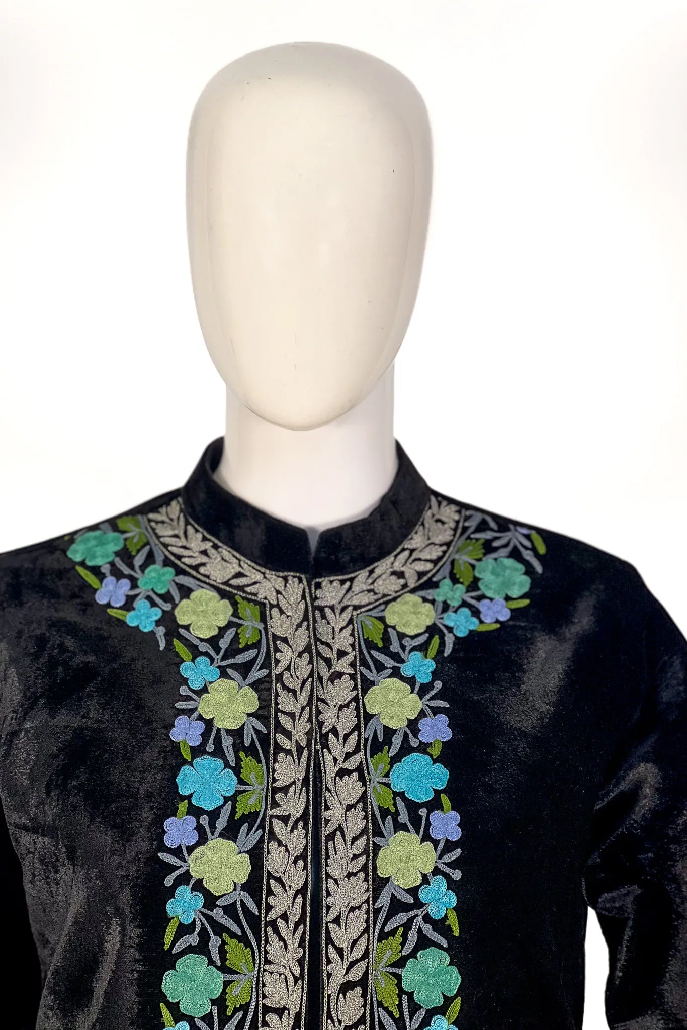 The velvet catches light the way night water does, dark and quietly reflective. At first it appears almost still, a deep black surface without interruption. Then the florals begin to reveal themselves. Soft blues and greens rise along the front panels, framed by fine Tilla and Aari borders that travel down the center like a slender pathway. There is something intimate about it, the way the embroidery rests close to the neckline and traces the edges without overwhelming the velvet beneath.