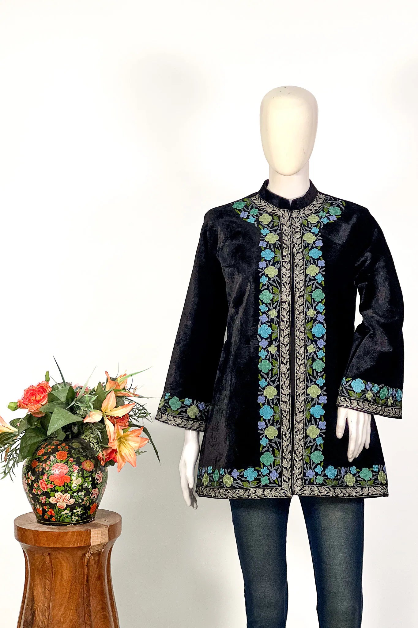 - Wear it open above a floor length black dress, letting the embroidered borders frame the neckline vertically.