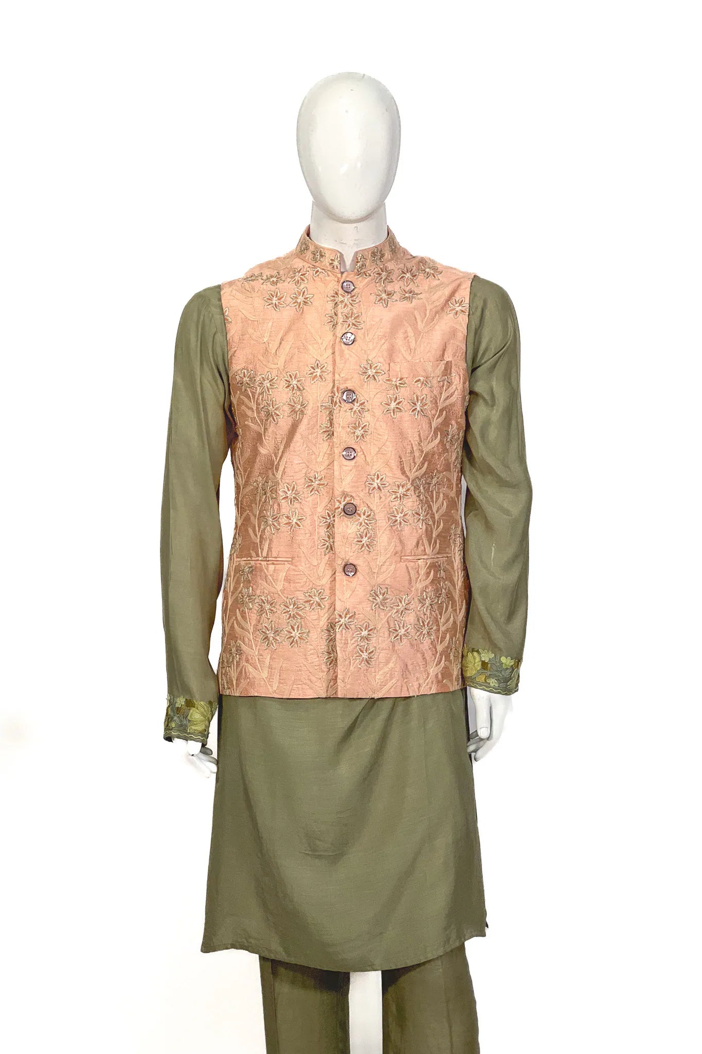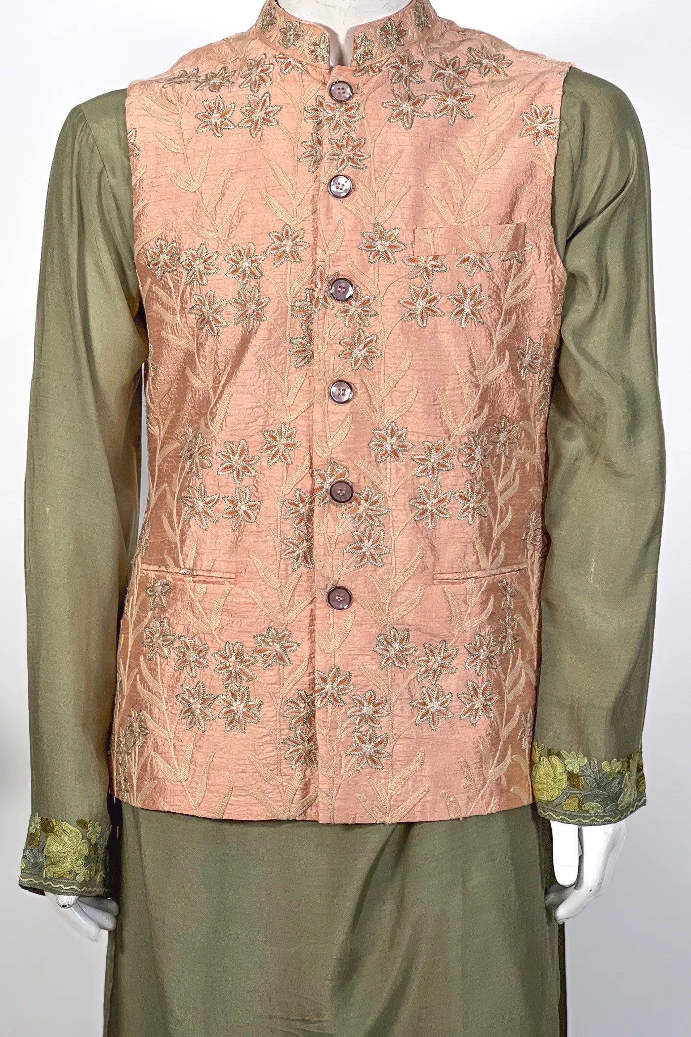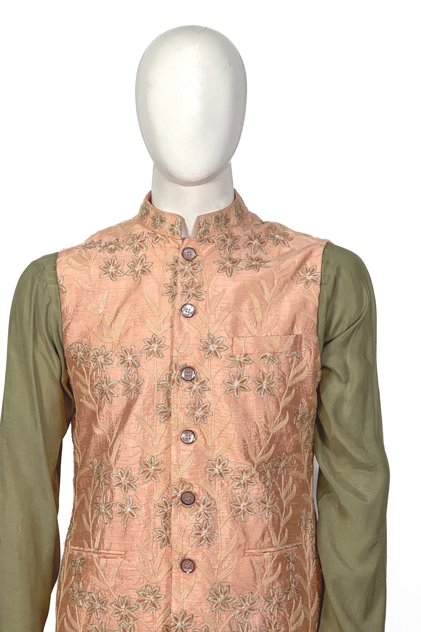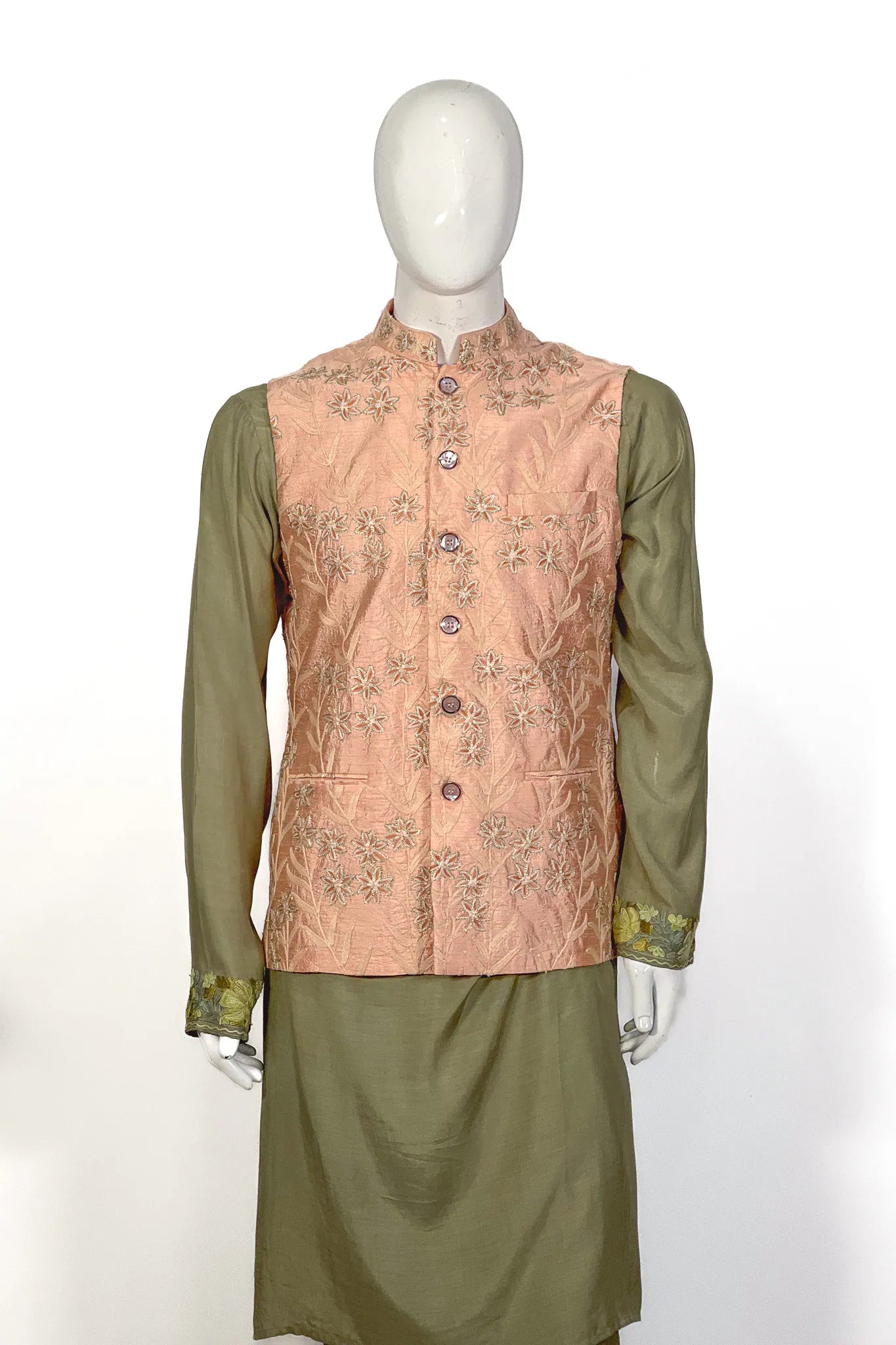 Wear over an olive or sage kurta-pyjama set and finish with tan kolhapuri sandals and a simple gold kada. For a winter baraat, layer a cream pashmina stole across the shoulders — the peach holds against cool neutrals.