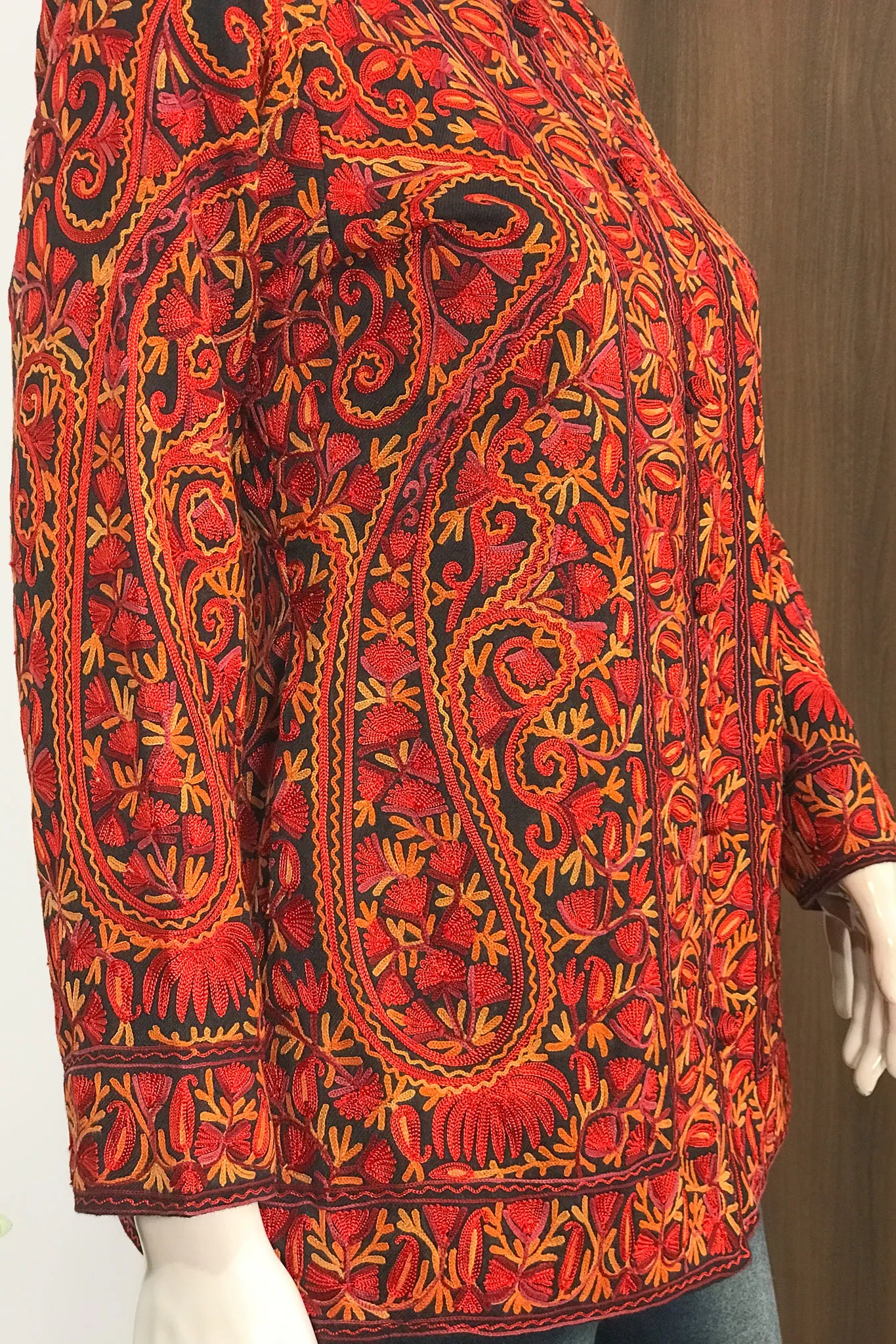 The first thing you notice is the warmth of the red against black. Not bright in a hurried way, but steady, like embers that have been burning quietly for hours. The wool feels dense beneath the fingers, smooth yet substantial, and across its surface the Kashmiri Jamawar Aari embroidery unfurls in curling vines and paisleys that seem to move even while still. Zehnara carries colour with confidence. The threads in crimson, saffron, and rust rise against the dark base, forming patterns that feel both intricate and deeply rooted.