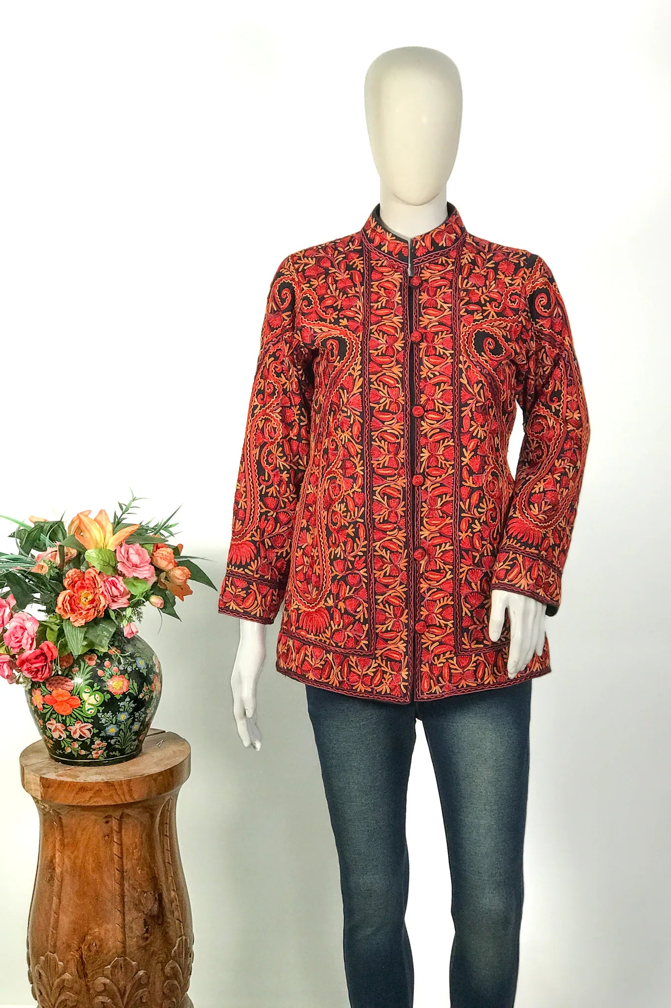 Worn, the length settles just below the hips, creating a structured silhouette that holds its shape without stiffness. The lining rests softly against the skin, while the embroidered front panel draws the eye upward along the neat row of buttons. There are pockets on both sides, almost instinctively reached for when you pause mid conversation. The wool holds warmth close, the embroidery carrying its own quiet intensity. It feels protective in cooler air, yet expressive in every detail, as though it remembers every celebration it has witnessed.