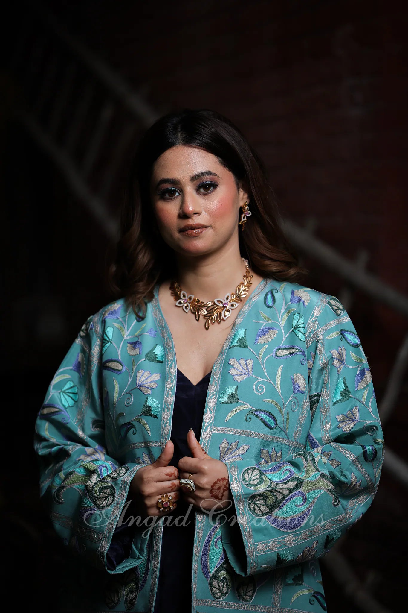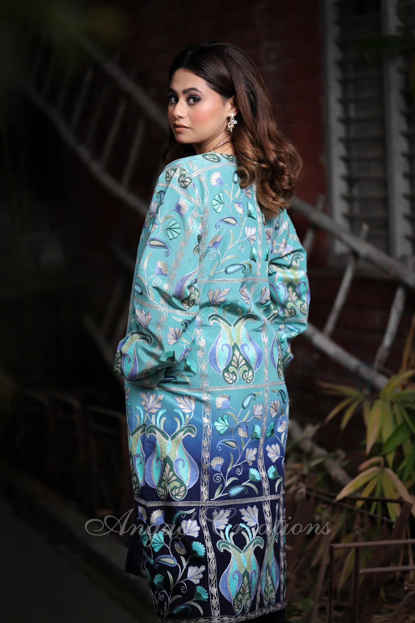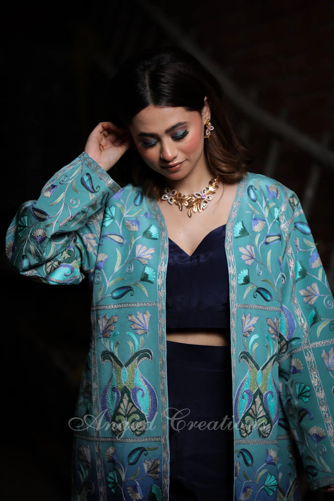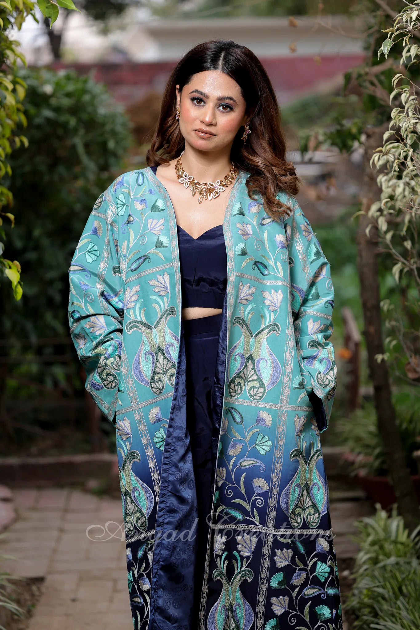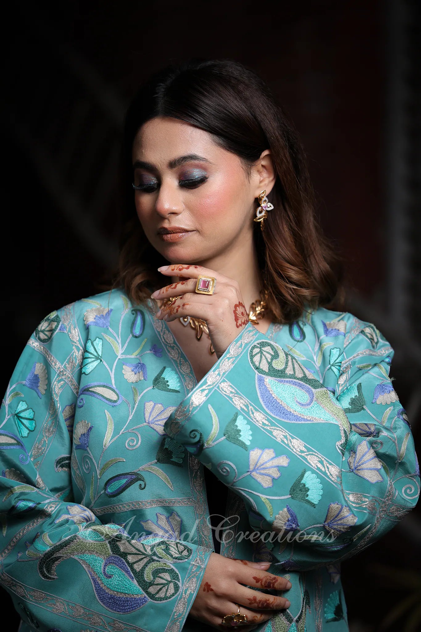 Zia is designed for women who carry confidence with quiet grace and feel deeply connected to cultural artistry. Wearing this ensemble evokes a sense of poise and individuality, where heritage craftsmanship meets modern expression. The soft fawn base of the blouse and pant creates a balanced foundation, while the statement jacket in green and rust or ombre blue and green adds depth and visual drama. Handcrafted Kashmiri aari embroidery enriched with gold tilla detailing brings the piece to life, reflecting the skill and patience of master artisans. Crafted in breathable cotton satin and fluid crepe silk, Zia offers comfort, versatility, and timeless appeal, making it a refined choice for elevated celebrations.
