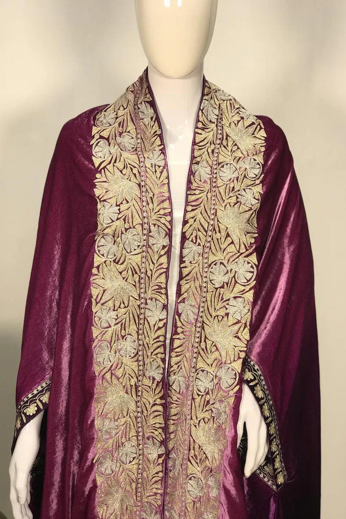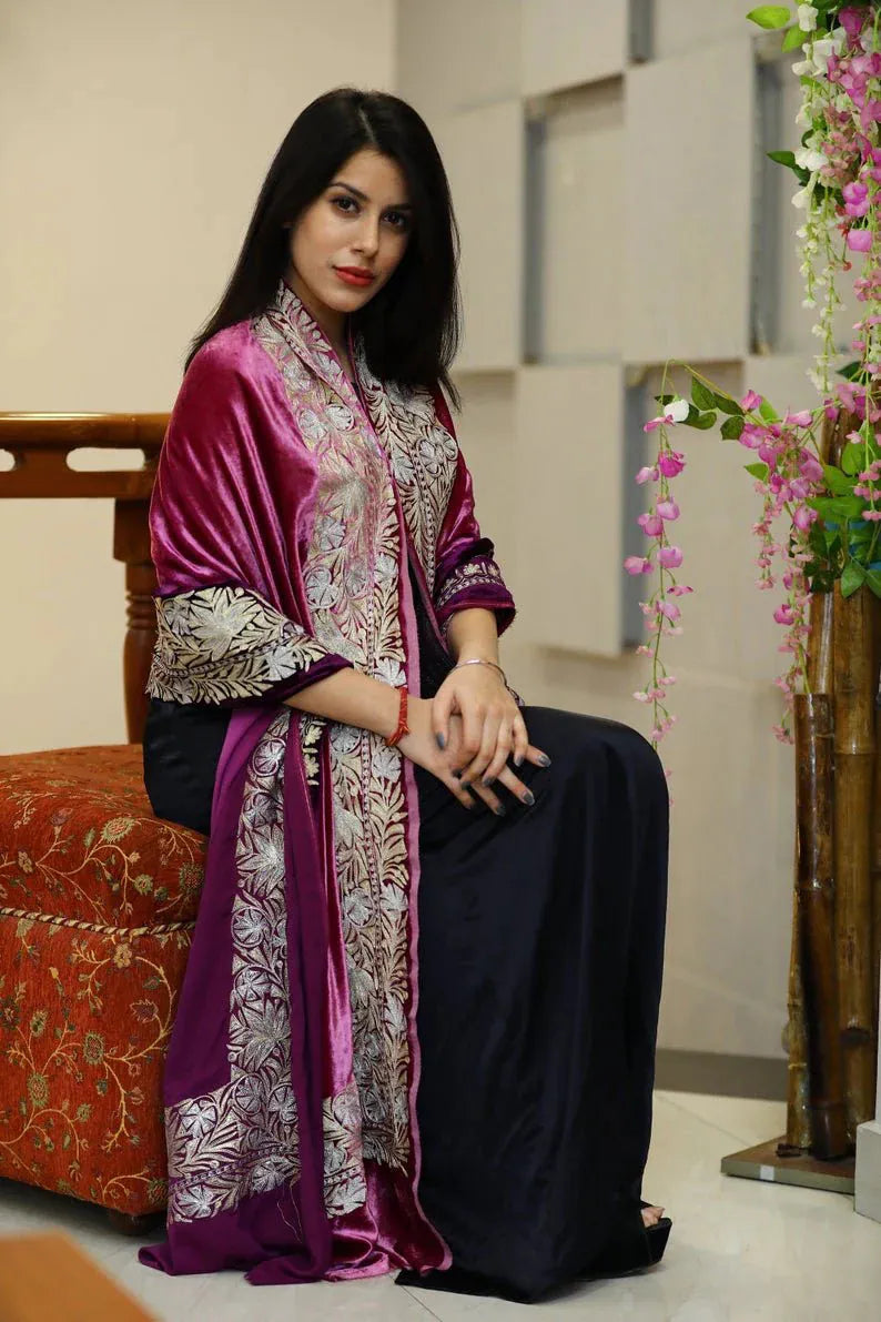 When draped across the shoulders, the cape settles with a gentle weight, neither heavy nor fleeting. The velvet rests against the skin with warmth, while the zari edges trace the arms in luminous detail. It does not overwhelm. It envelops. The contrast of metallic thread against the richness of the velvet feels intimate, like standing close enough for someone to notice the fine detailing at the cuff. Worn open as a cape, it creates a soft cascade of colour. Drawn closer, it feels protective, almost ceremonial in its quiet confidence.