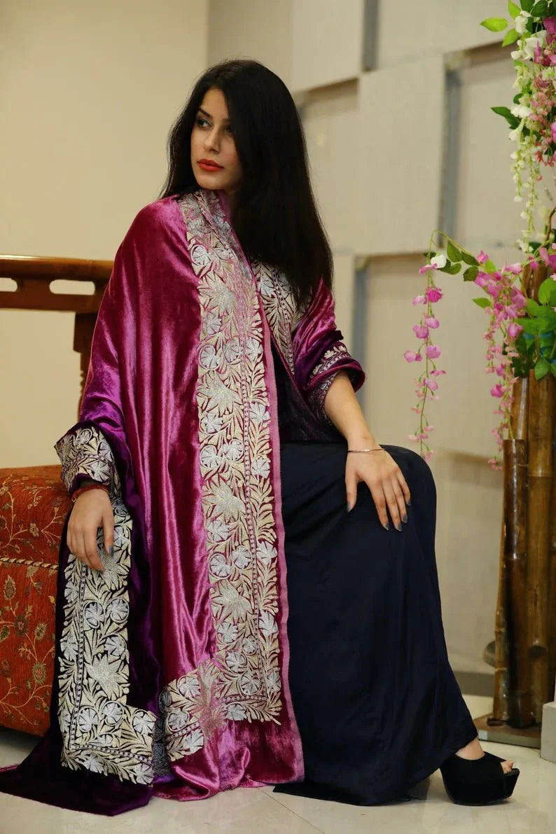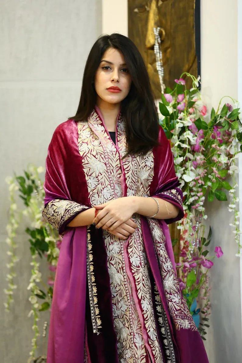 There is a certain hour in the evening when the light turns almost rose, and silk velvet begins to glow from within. Afsoon carries that hour in its folds. The onion toned pink deepens into purple as the fabric moves, catching light softly, almost liquid in its fall. Along the borders, gold and silver zari embroidery unfurls in quiet intricacy, framing the length like something carefully preserved and brought out only when the moment feels right.