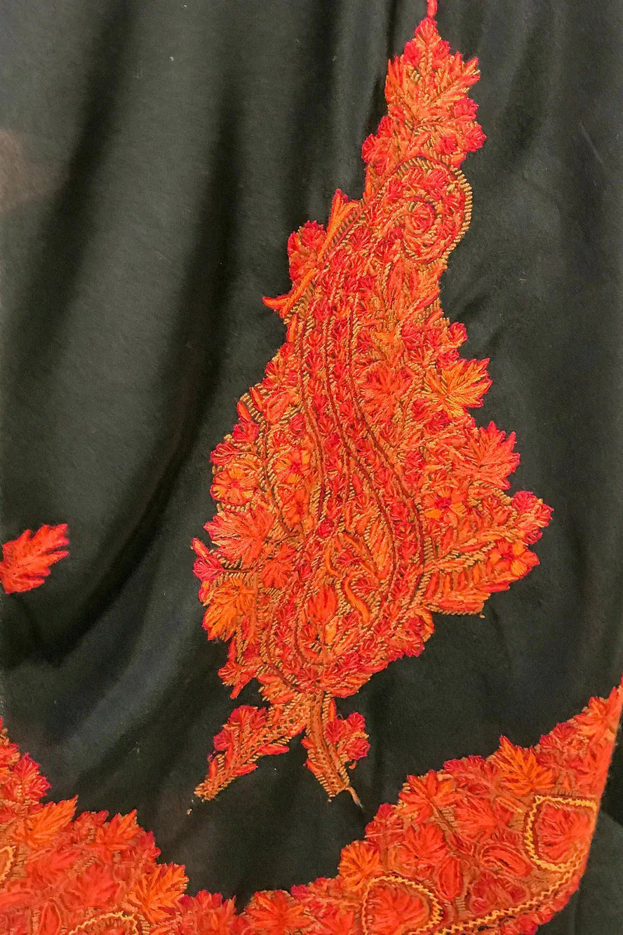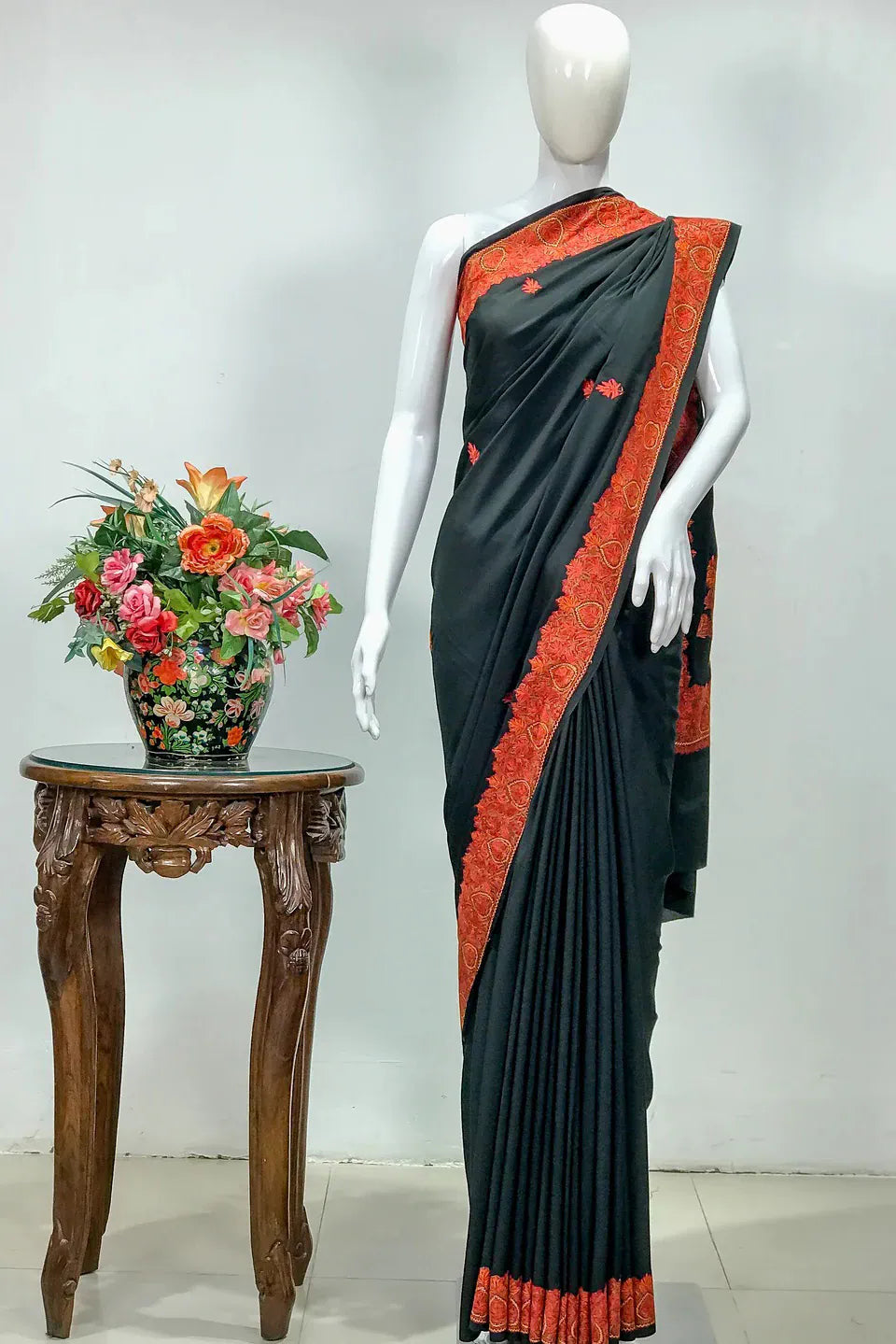 Wearing Aqira feels assured and commanding, a piece that lets confidence unfold naturally while staying rooted in timeless artistry. Crafted in Indian crepe, the saree drapes with a smooth, fluid fall that stays comfortable through long evenings and celebrations. Handcrafted sozni embroidery in deep red tones punctuates the black base with striking contrast, reflecting patience, skill, and Kashmiri craftsmanship. Designed to remain relevant across seasons and occasions, Aqira balances bold presence with refined restraint and comes paired with a matching Indian crepe blouse for a complete, polished look.