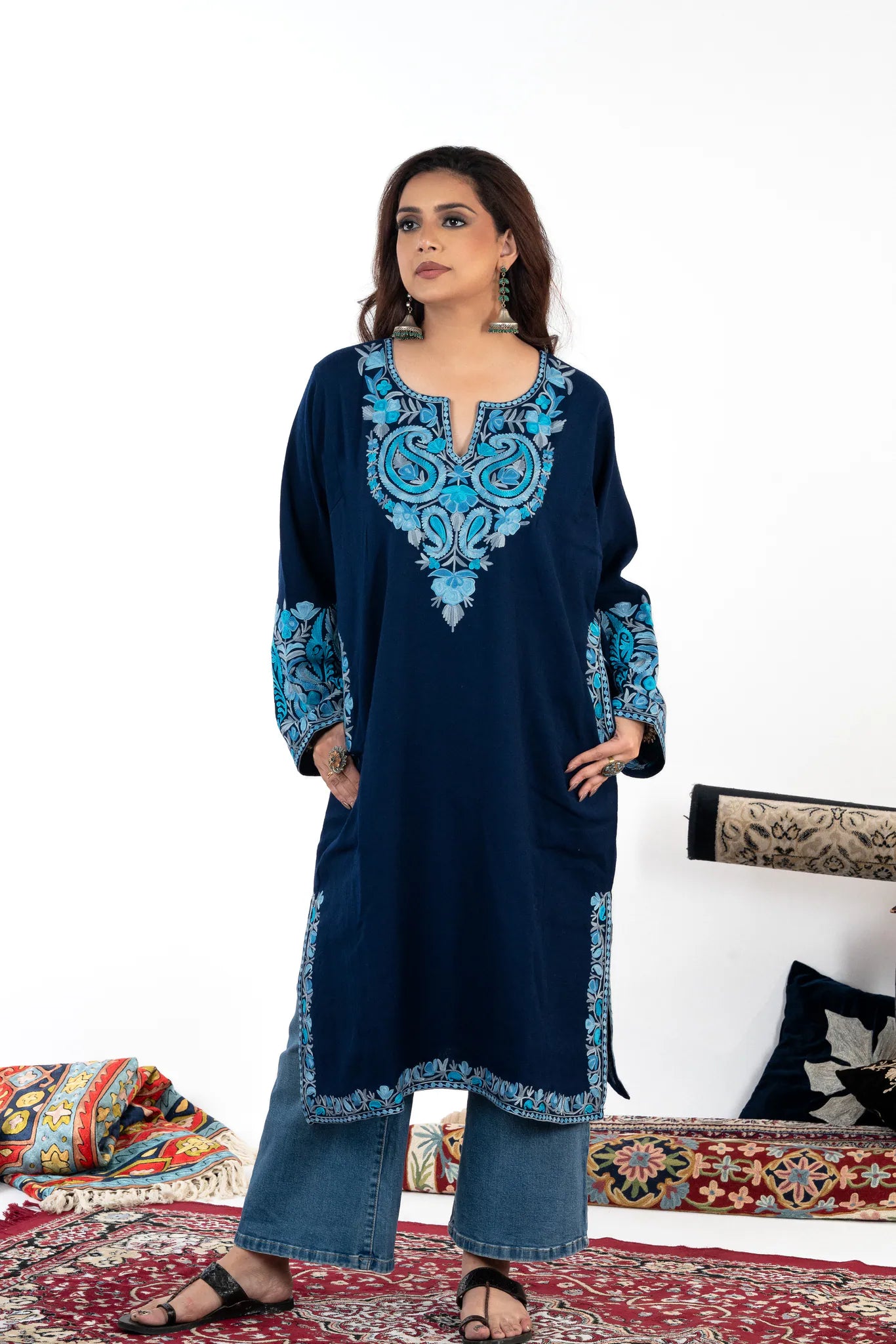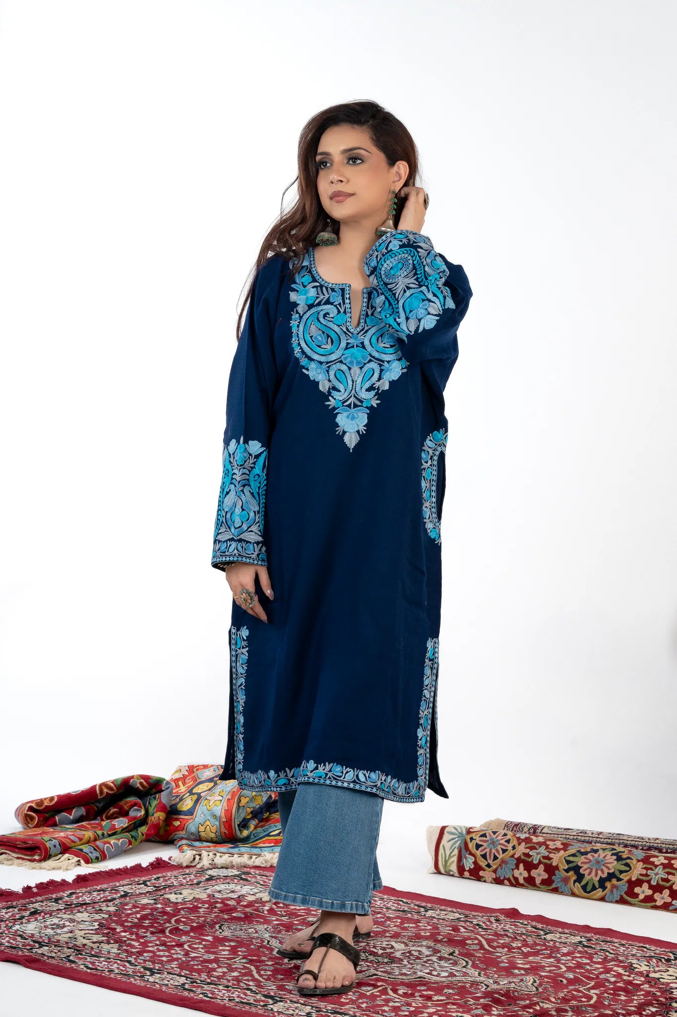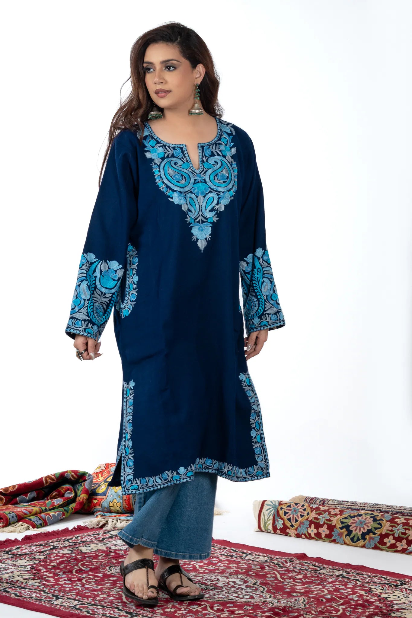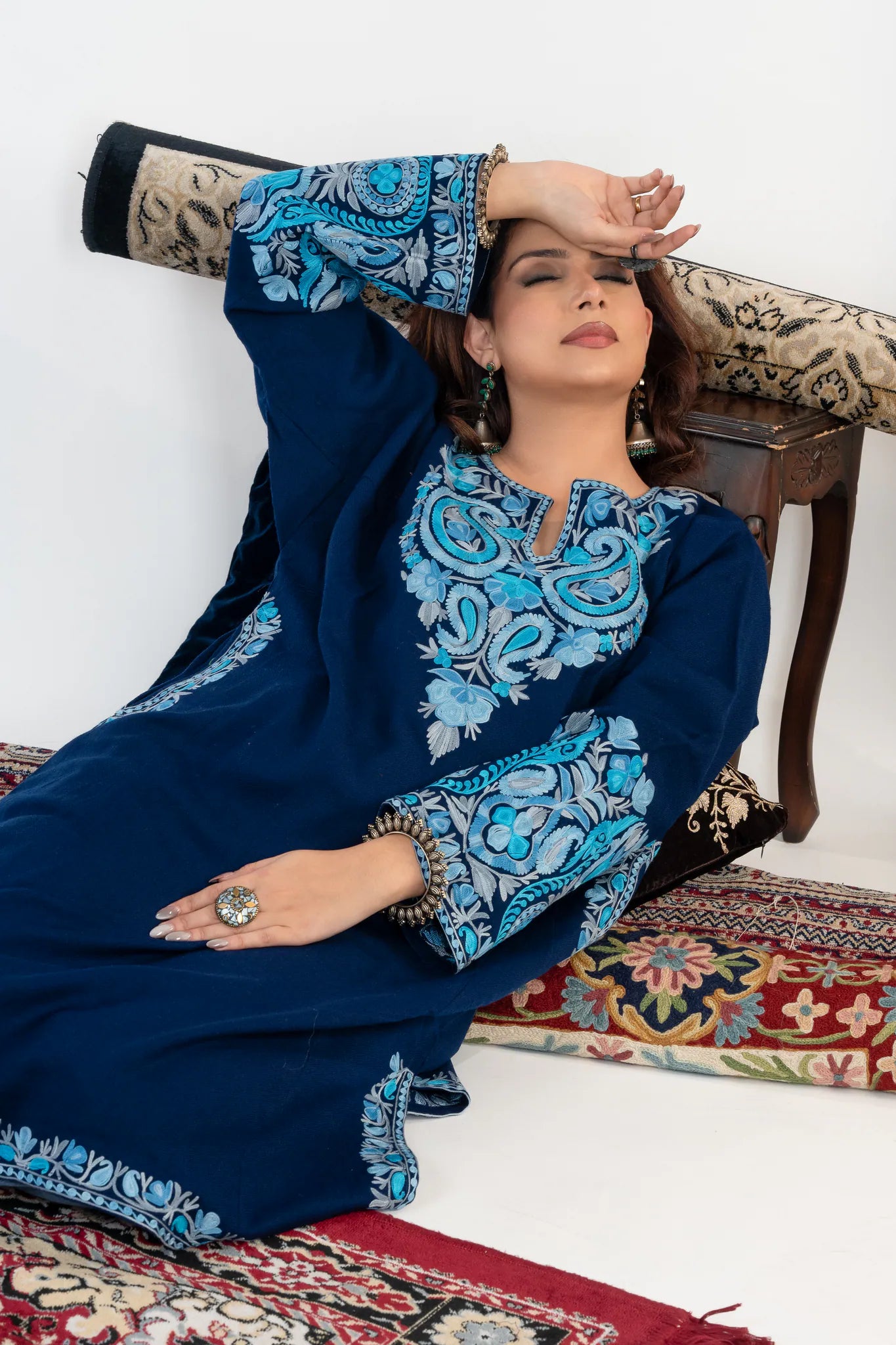 Stay cozy and graceful in our “Gulnaar” woollen Kashmiri phiran, adorned with intricate aari embroidery. Available in classic navy, regal wine, and earthy olive green, this phiran blends timeless Kashmiri artistry with everyday warmth.